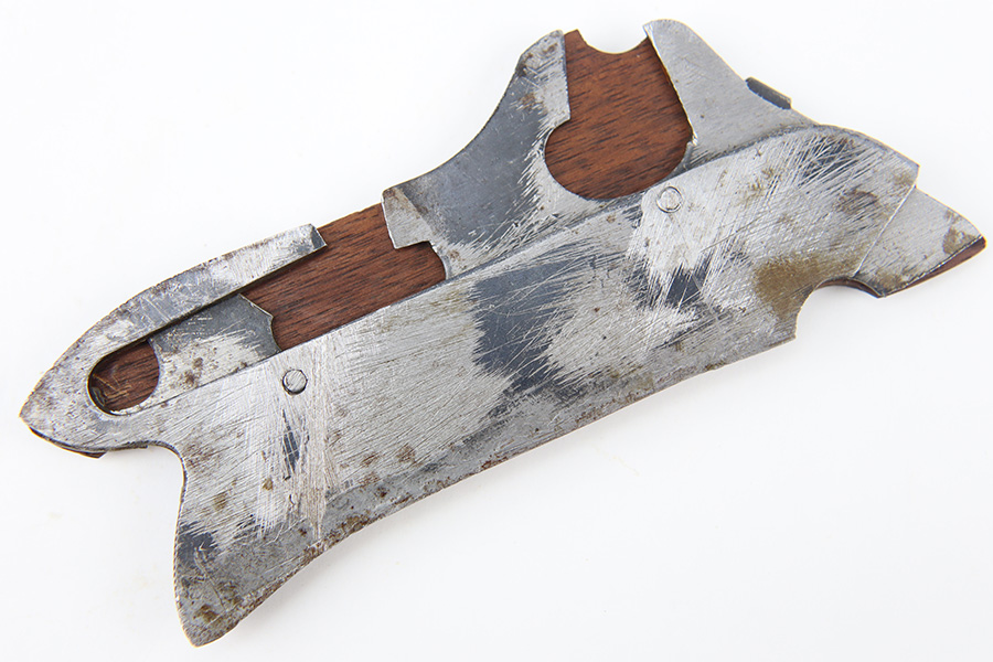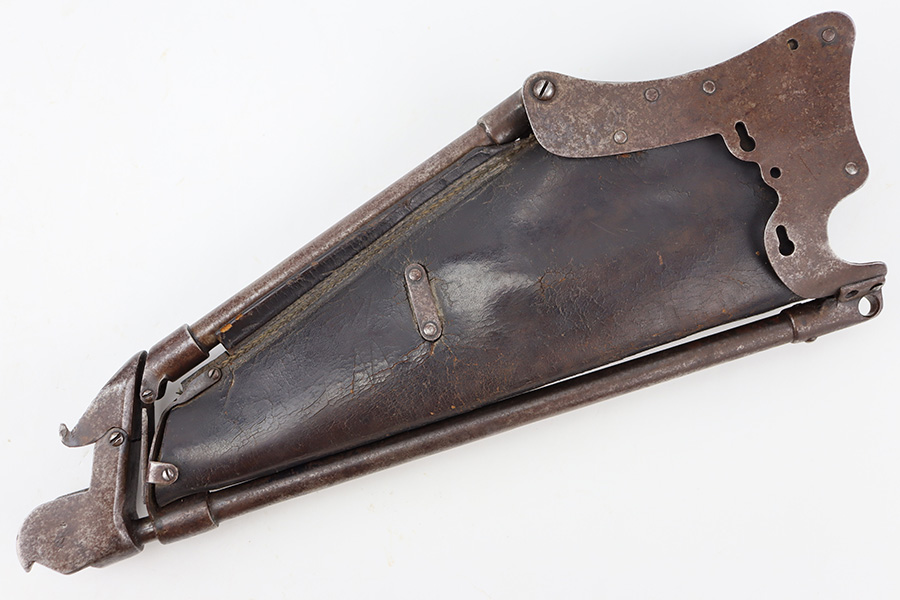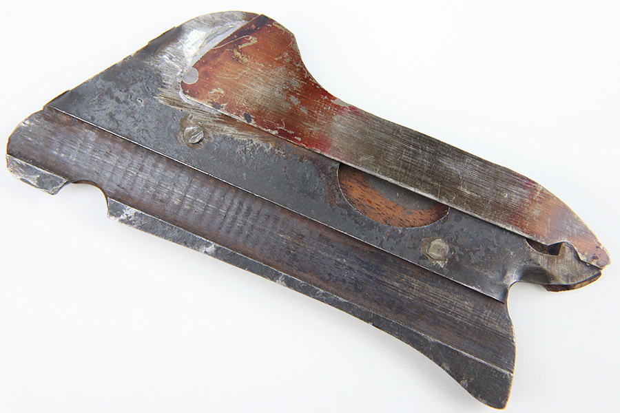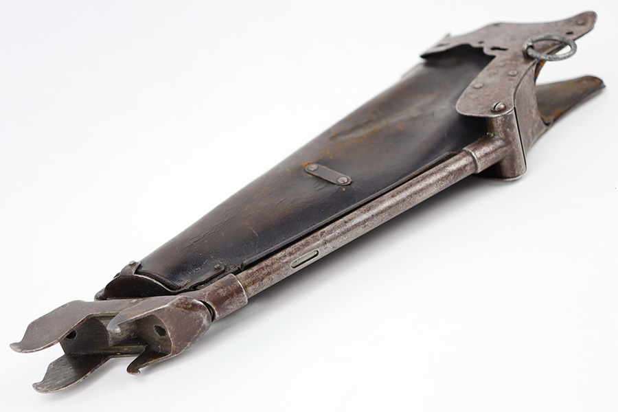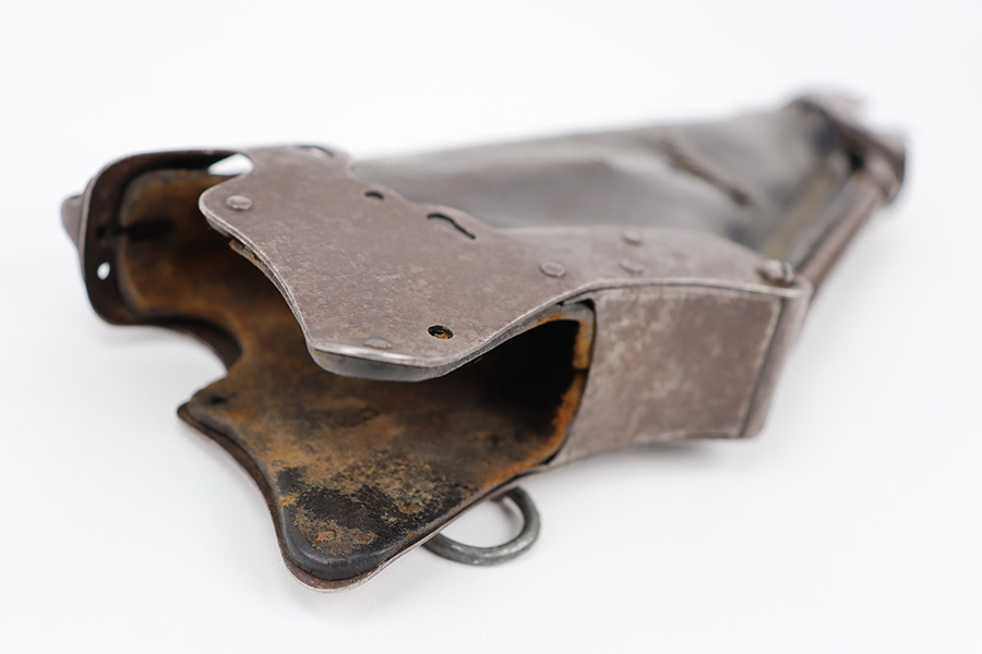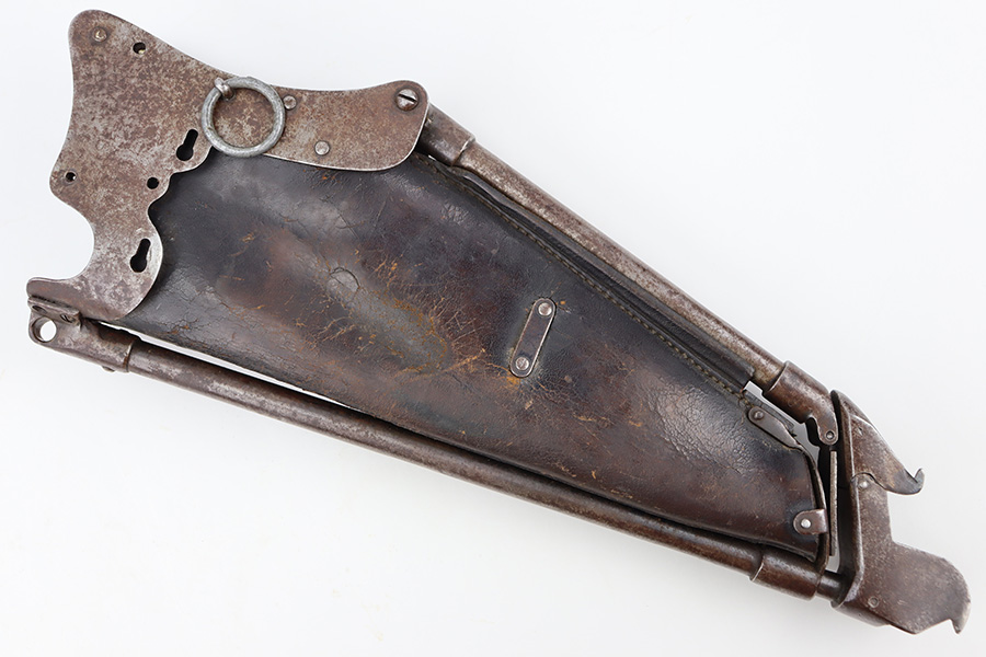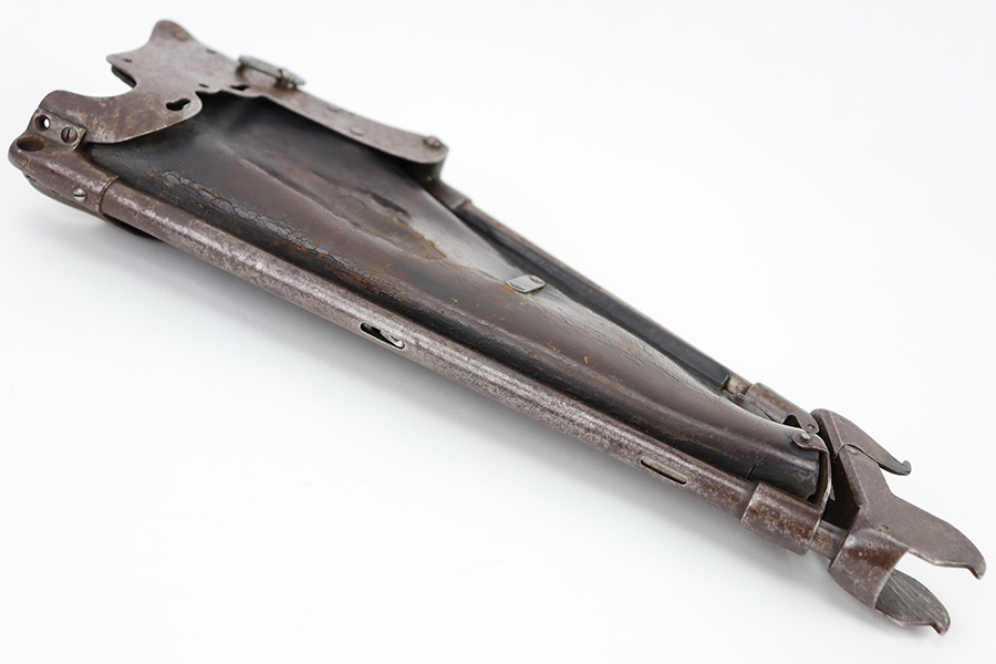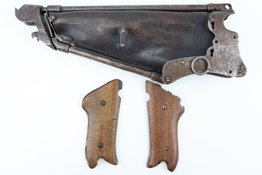 12/18/23 – This is an original, early Luger production “Ideal” Luger Grips and Stock. These were made in the early 1900’s (1904 was the first year of production) and uses the special grip design with metal locking surfaces to attach and detach the metal-framed stock. There are very few examples in existence today as these grips and stocks were not commercially viable, or at least too expensive to become popular. These are highly collectible in today’s market as a result. This example is functional and complete with both grips and stock. The metal on the stock has dark brown patina and natural aging throughout but no rust or pitting. The leather body is in great shape with normal surface wrinkling and mild cracking but no major issues.
