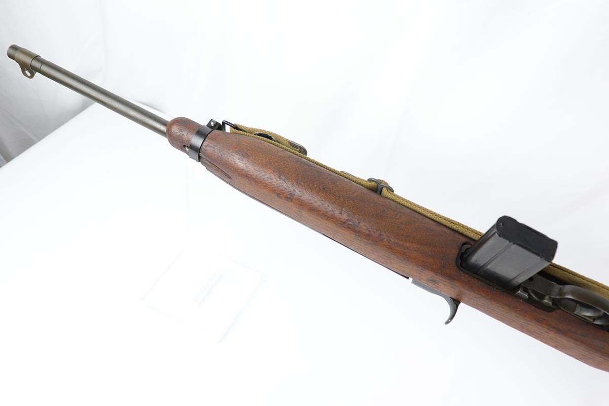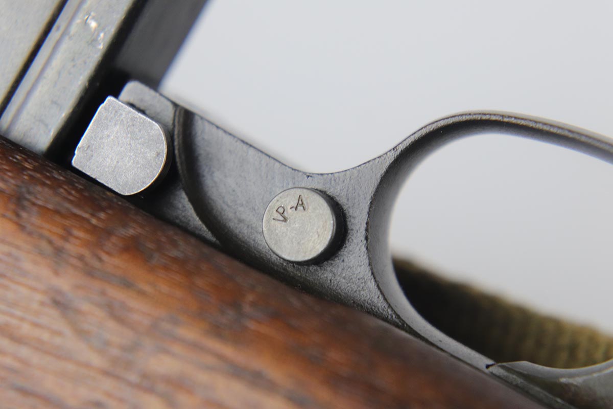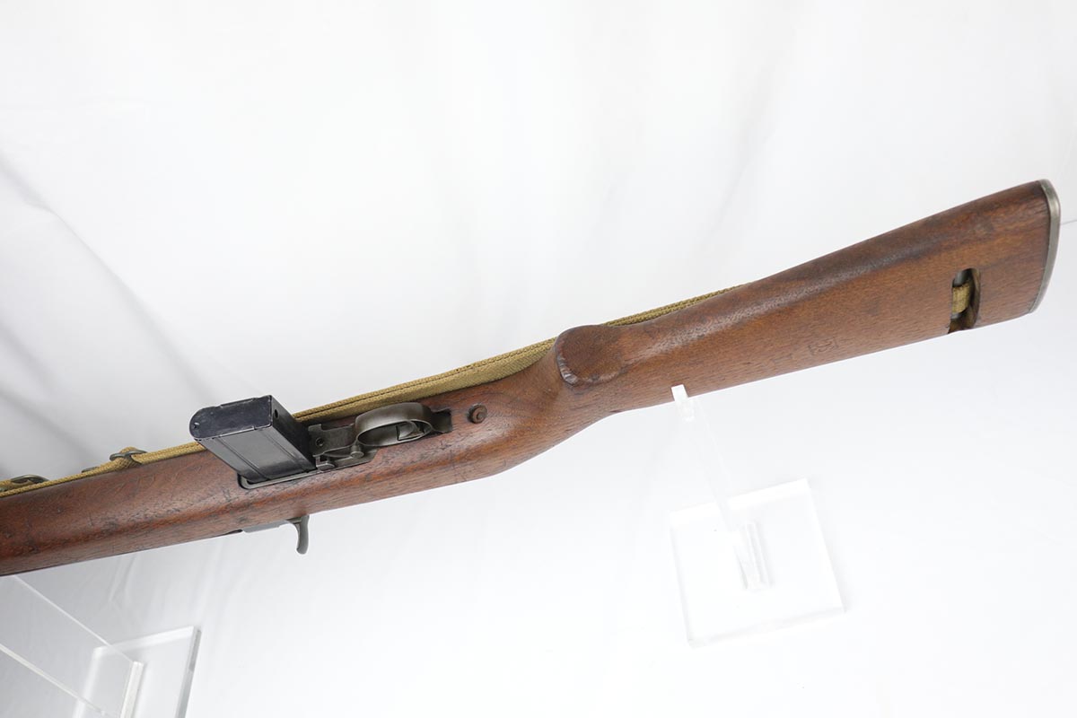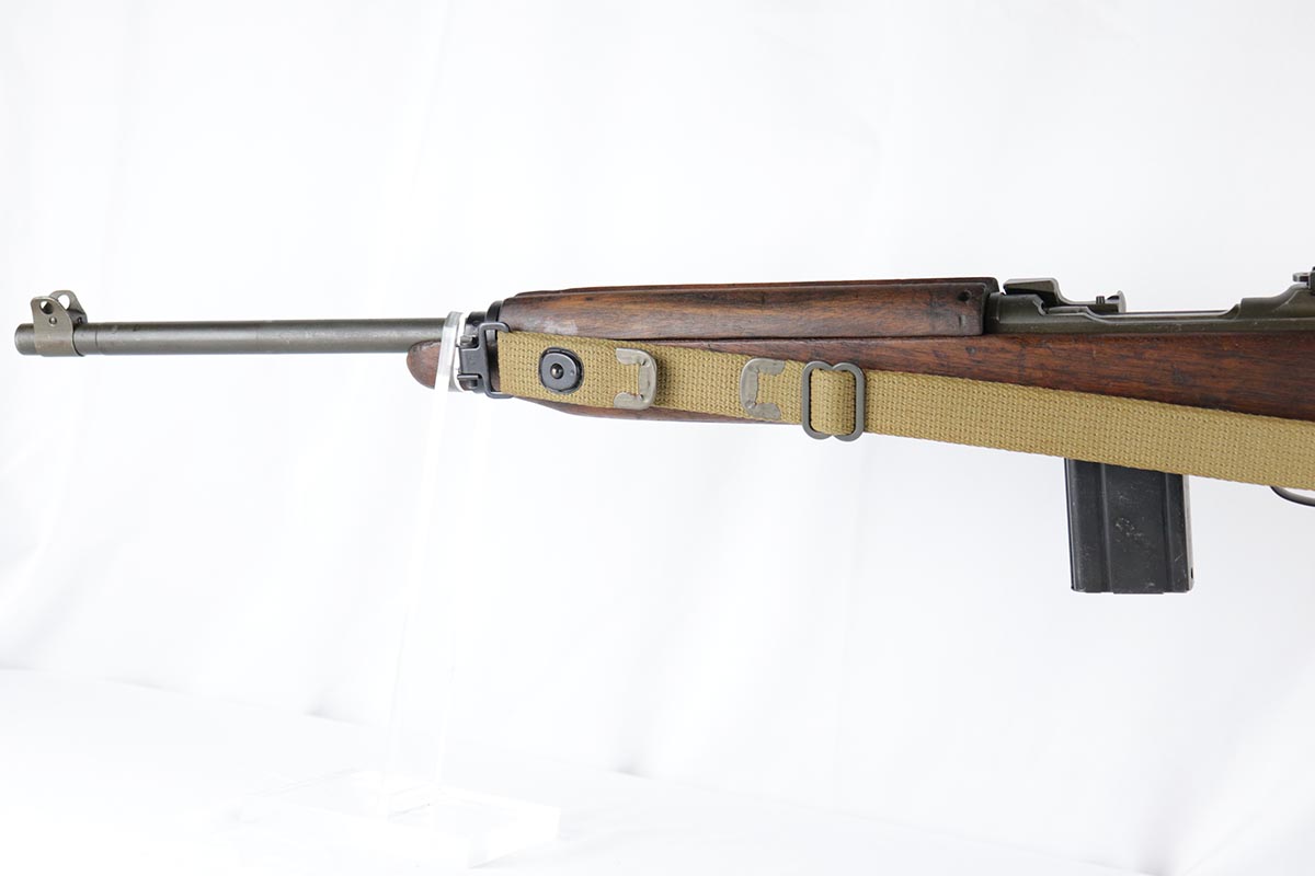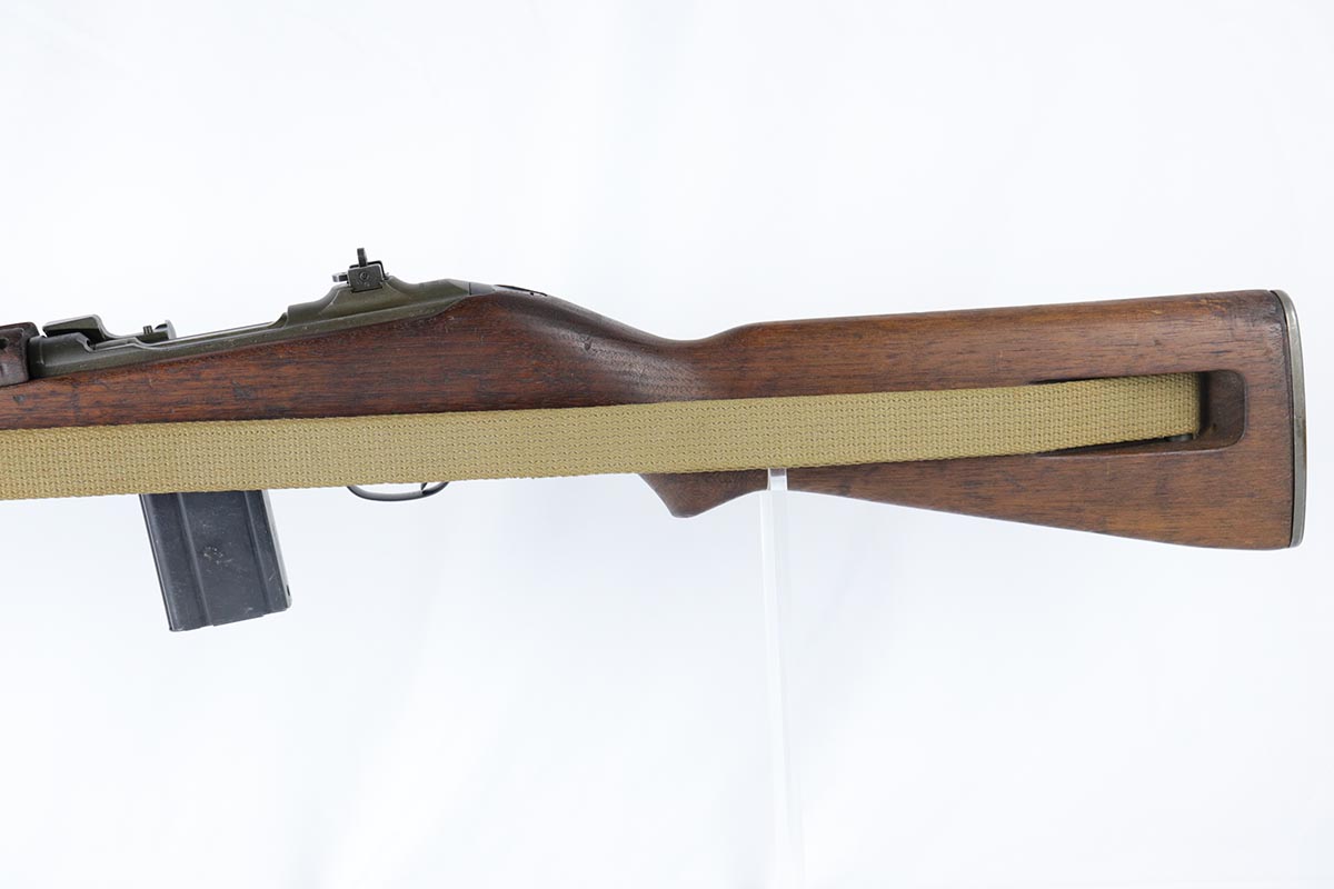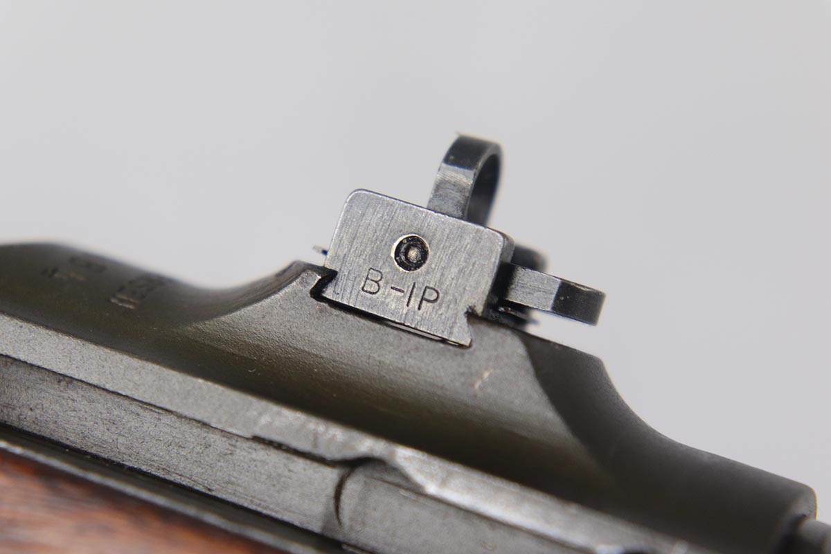 7/12/18 – The is an Irwin-Pedersen M1 Carbine – by far teh rarest maker from the World War II era. Most were put together with early parts from other contractors, and this is such a variant. It is a correct, type 1 S’G’ carbine with I-P receiver. Made in 1943, it has a B-IP marked rear site. Barrel is 1943 dated and Underwood marked. Safety is IP marked. The stock is S’G’ marked with high wood cut, and is RSG marked in the sling cut. It appears to have been lightly sanded at some point. The buttplate is S’G’ marked. Magazine is A1 marked and front sling swivel is marked UP. Comes with original sling, in original configuration. Excellent bore.