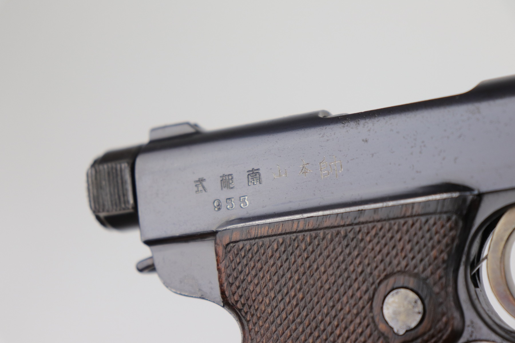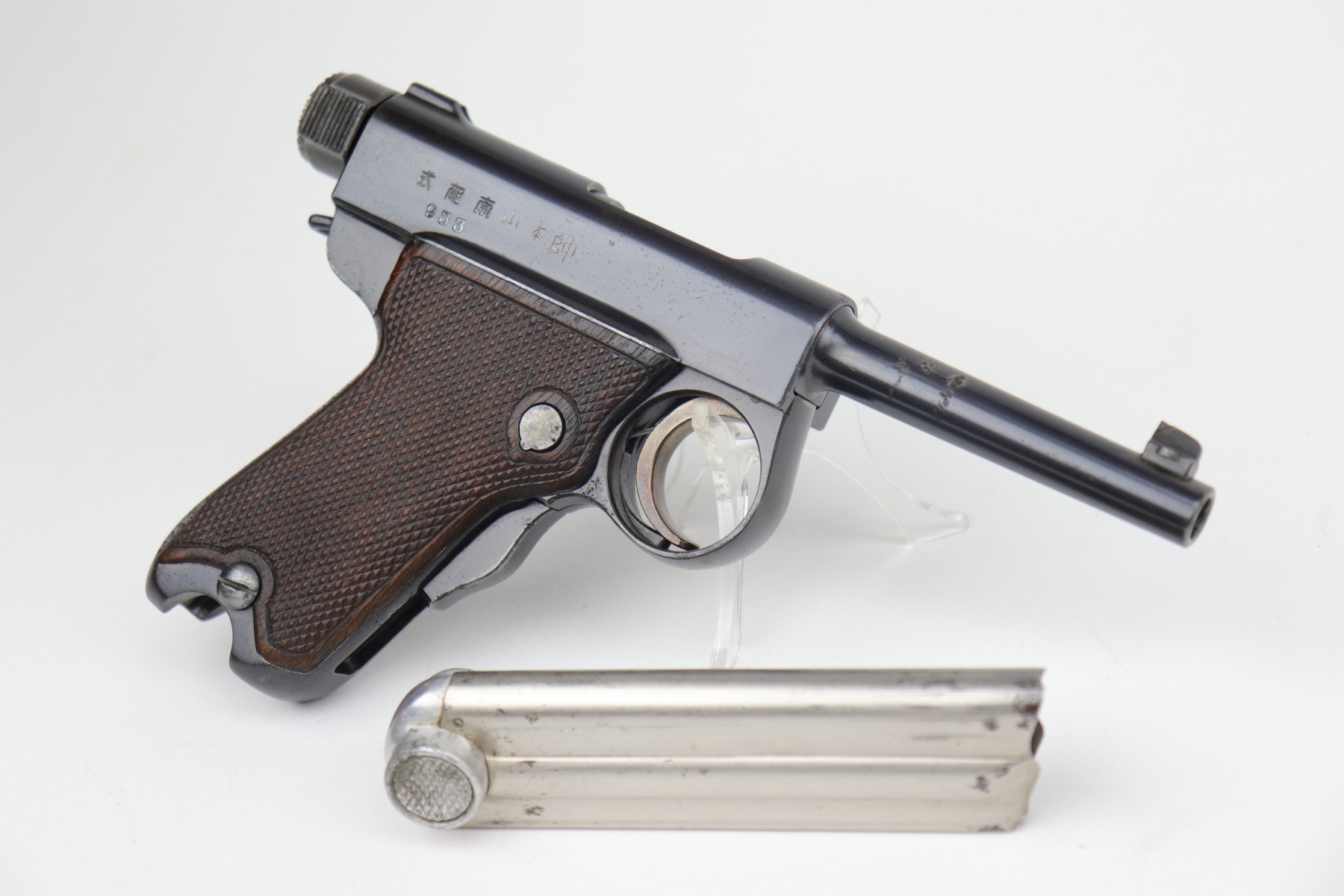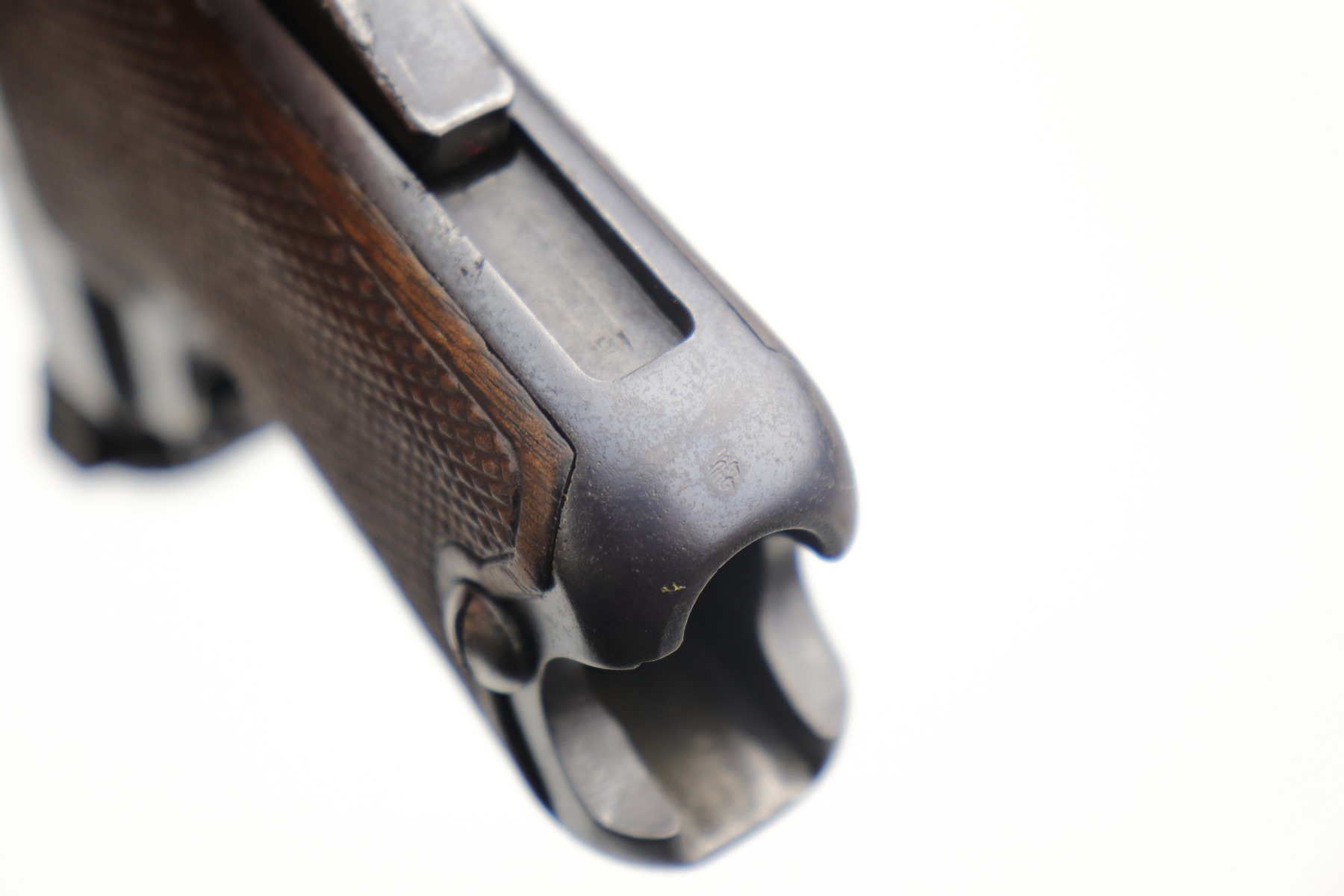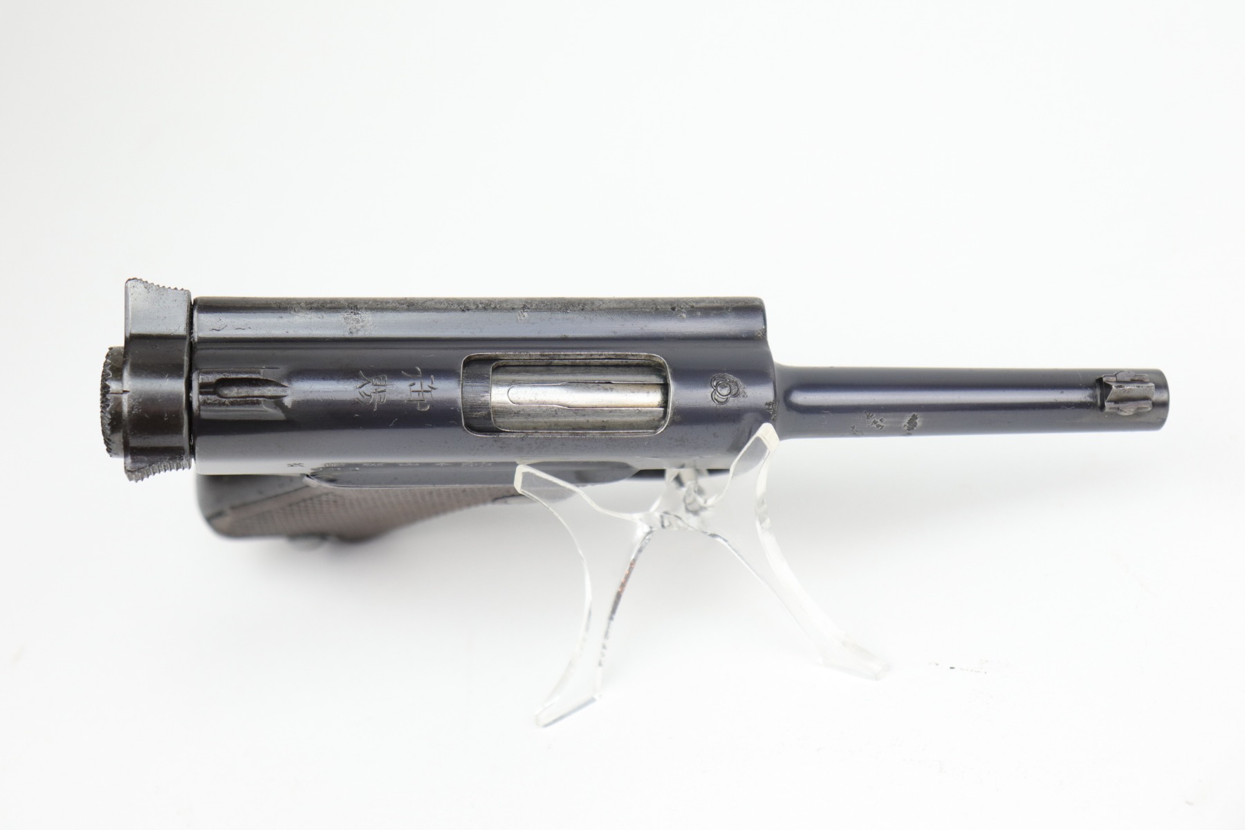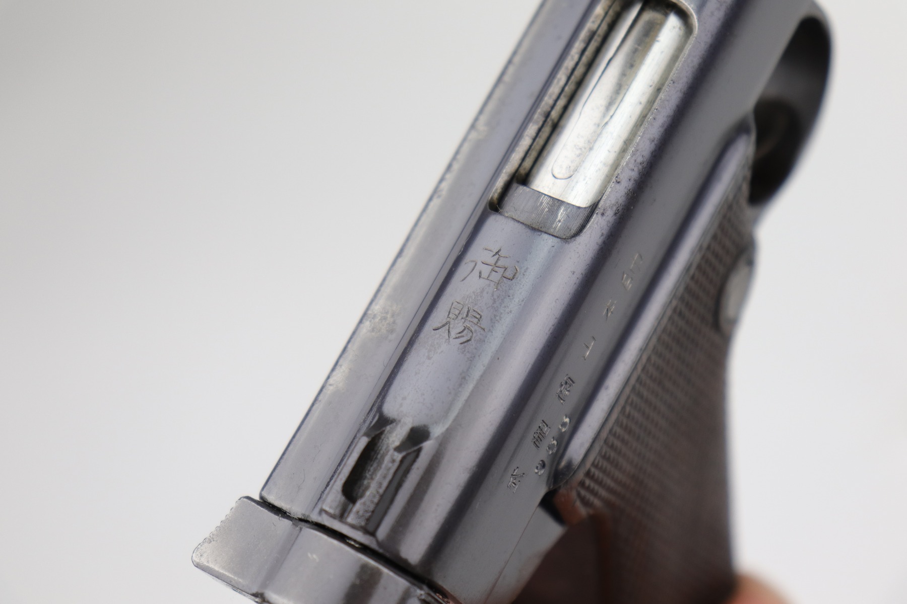 1/4/21 – This is a very nice example of a rare Japanese Baby Nambu. This one has a particularly early serial number and was manufactured in the early 1900’s. This one also has Kanji writing on the top and right side of the slide. It looks like it was added post-production. This one is all matching and has retained roughly 90% of its original finish. While there isn’t much actual finish loss there are areas of pitting throughout, most noticeable on the barrel, left side of the slide, and back strap. There is wear along the left edge of the slide. It has excellent grips (matching) and comes with one original matching magazine. The bore is very nice – shiny with decent rifling.