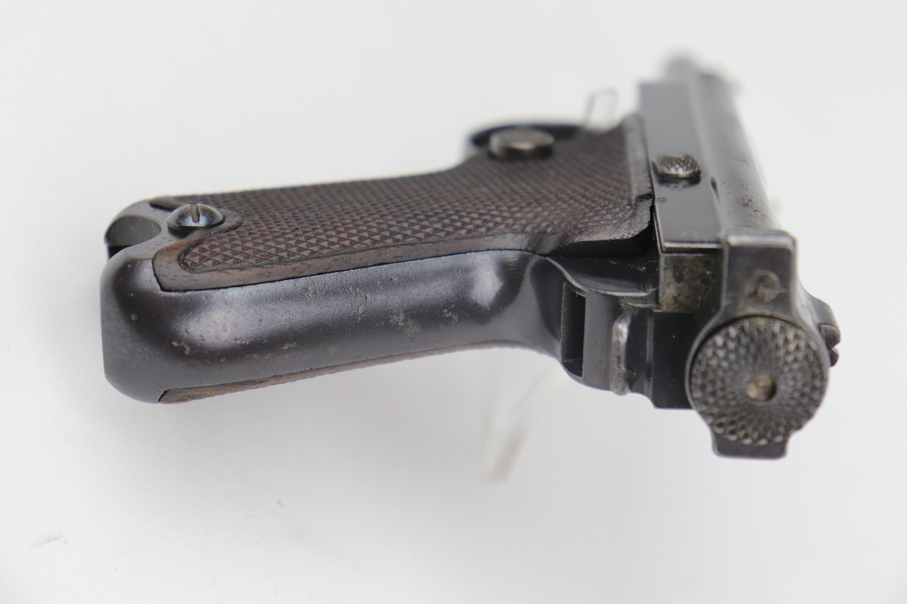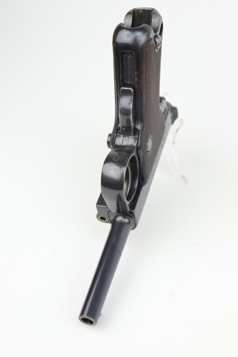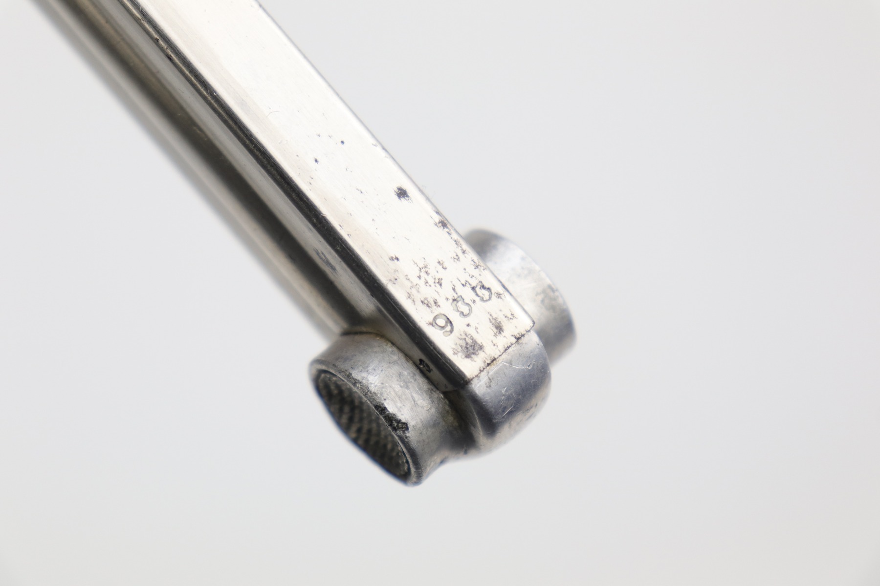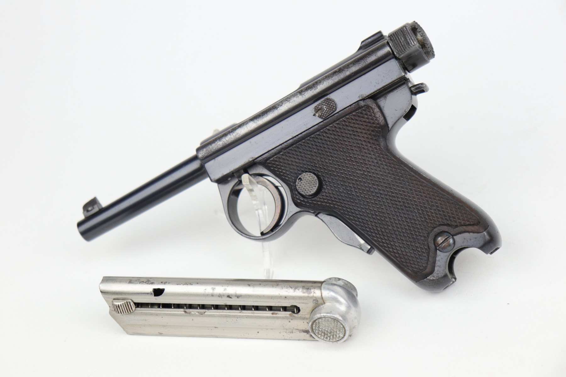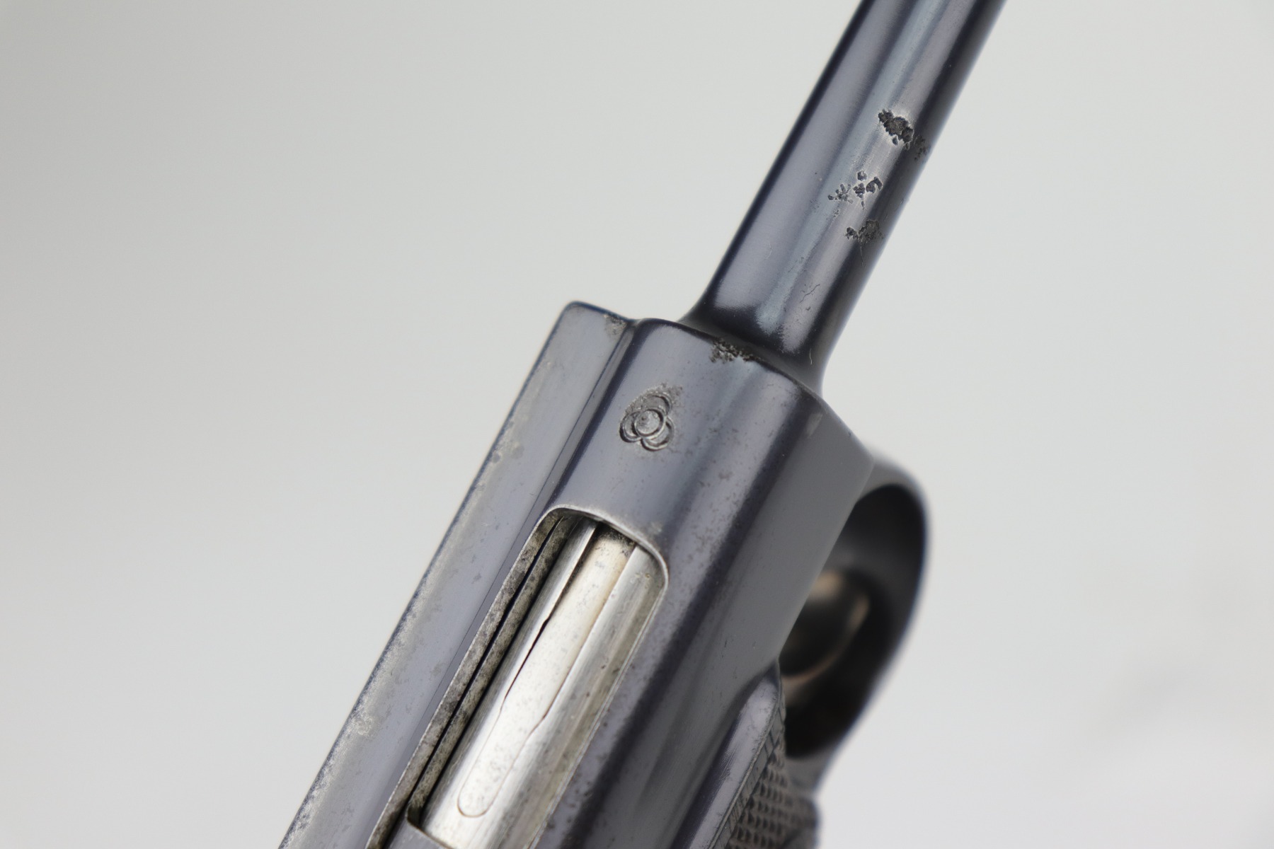 1/4/21 – This is a very nice example of a rare Japanese Baby Nambu. This one has a particularly early serial number and was manufactured in the early 1900’s. This one also has Kanji writing on the top and right side of the slide. It looks like it was added post-production. This one is all matching and has retained roughly 90% of its original finish. While there isn’t much actual finish loss there are areas of pitting throughout, most noticeable on the barrel, left side of the slide, and back strap. There is wear along the left edge of the slide. It has excellent grips (matching) and comes with one original matching magazine. The bore is very nice – shiny with decent rifling.