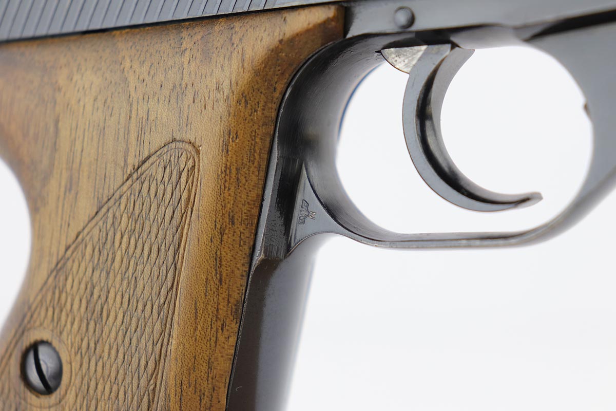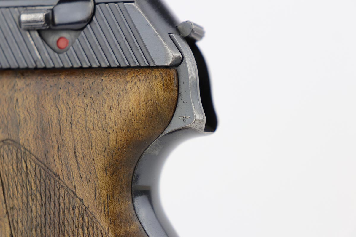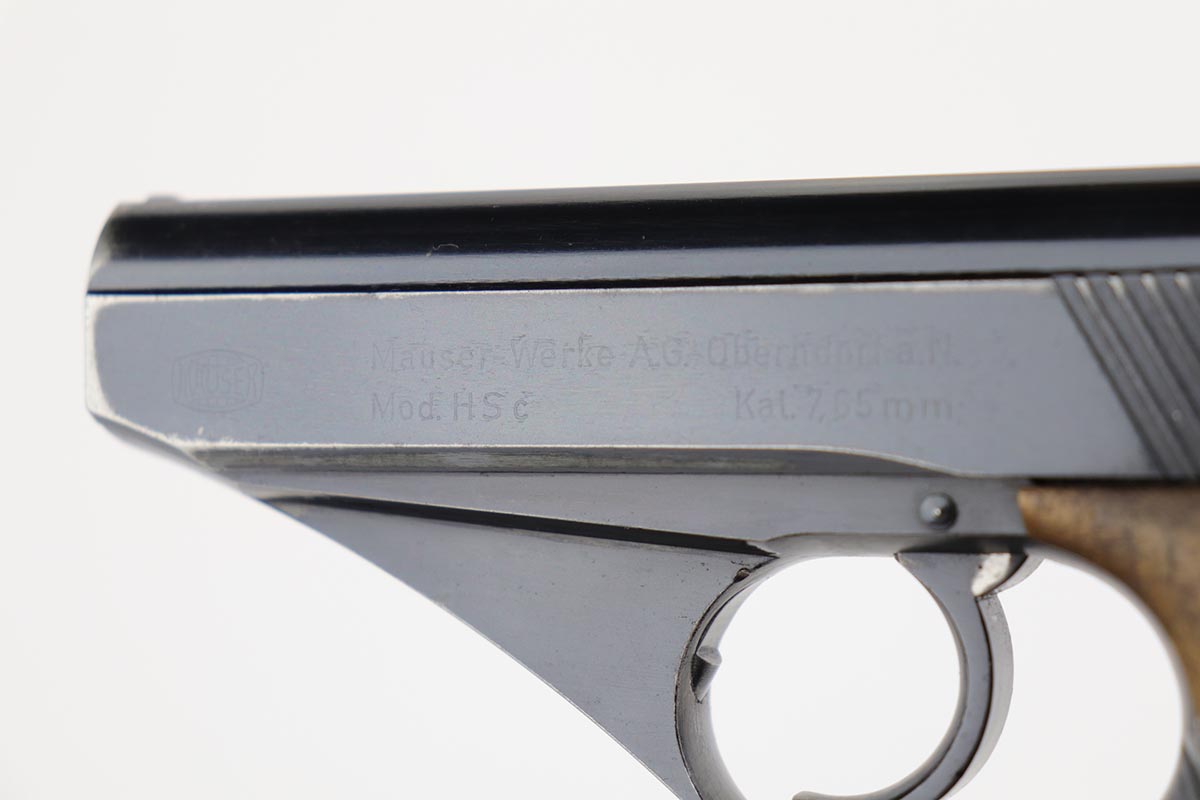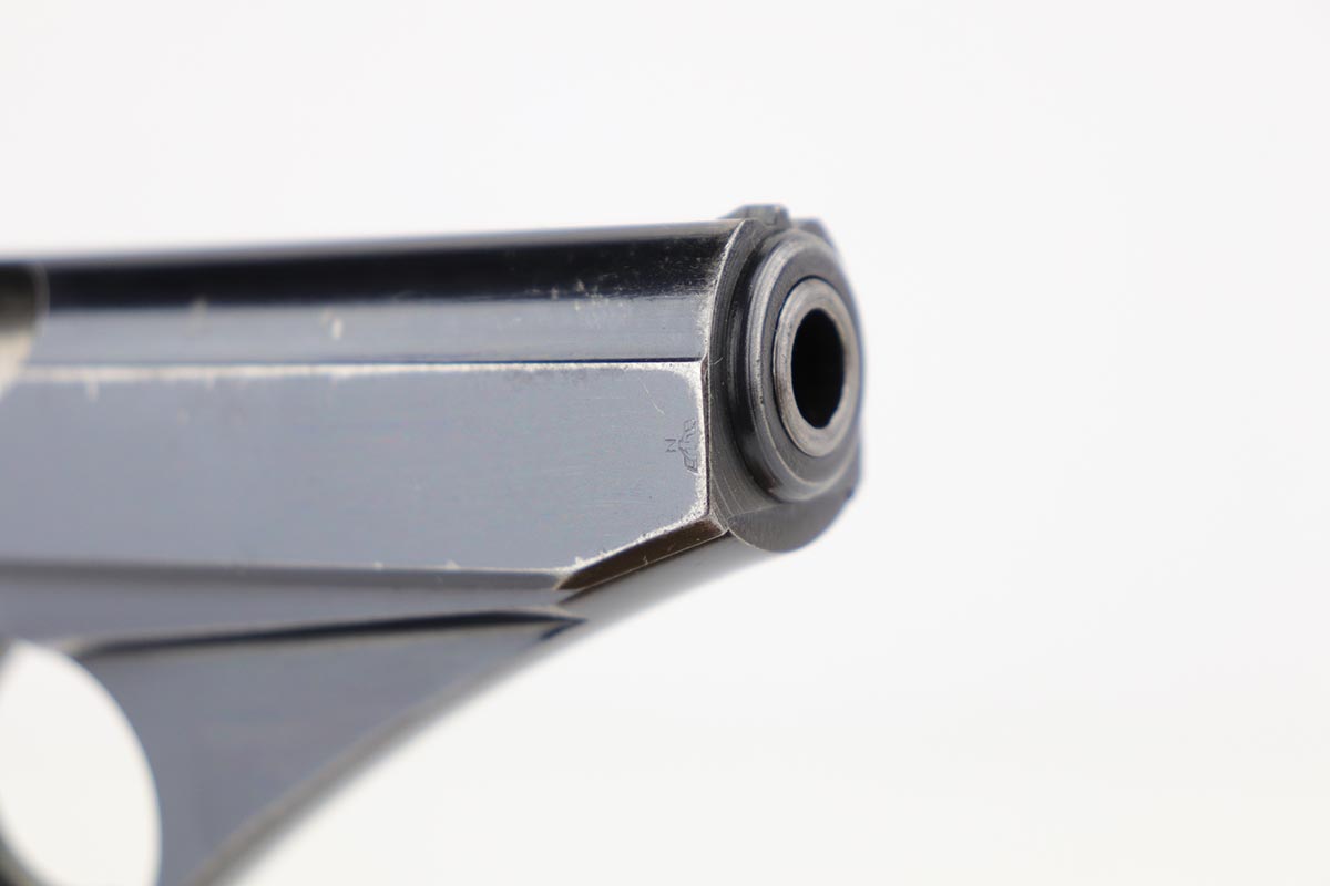 2/19/20 – This is the rarest of all the army issued Mauser HSc’s! One of only 3,000 produced, this is an early example with test eagle marking on left side tang. As production shifted from the M1934 to the HSc, the earliest examples were marked in the same fashion as the Army issued M1934s. This example is all original with about 92-94% high-polish blue remaining. There is minor patina/oxidation on the straps, and an area of finish loss on the bottom of the back strap. Both sides of the slide have common muzzle wear, and the right side of the slide has a few spots of finish loss mixed in. Minty bore and excellent grips. Banner magazine.