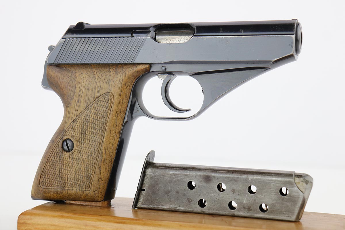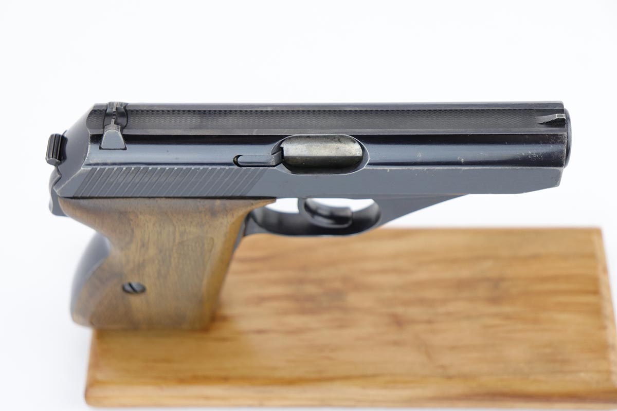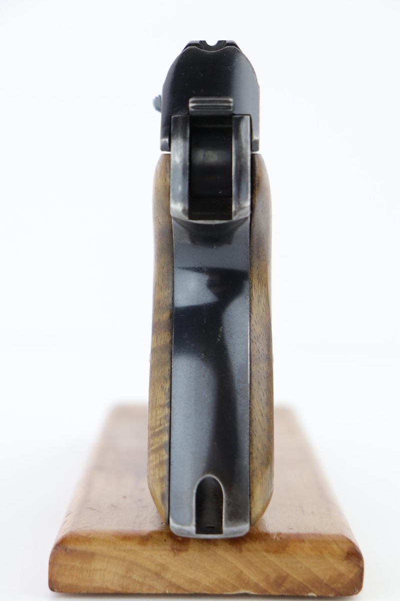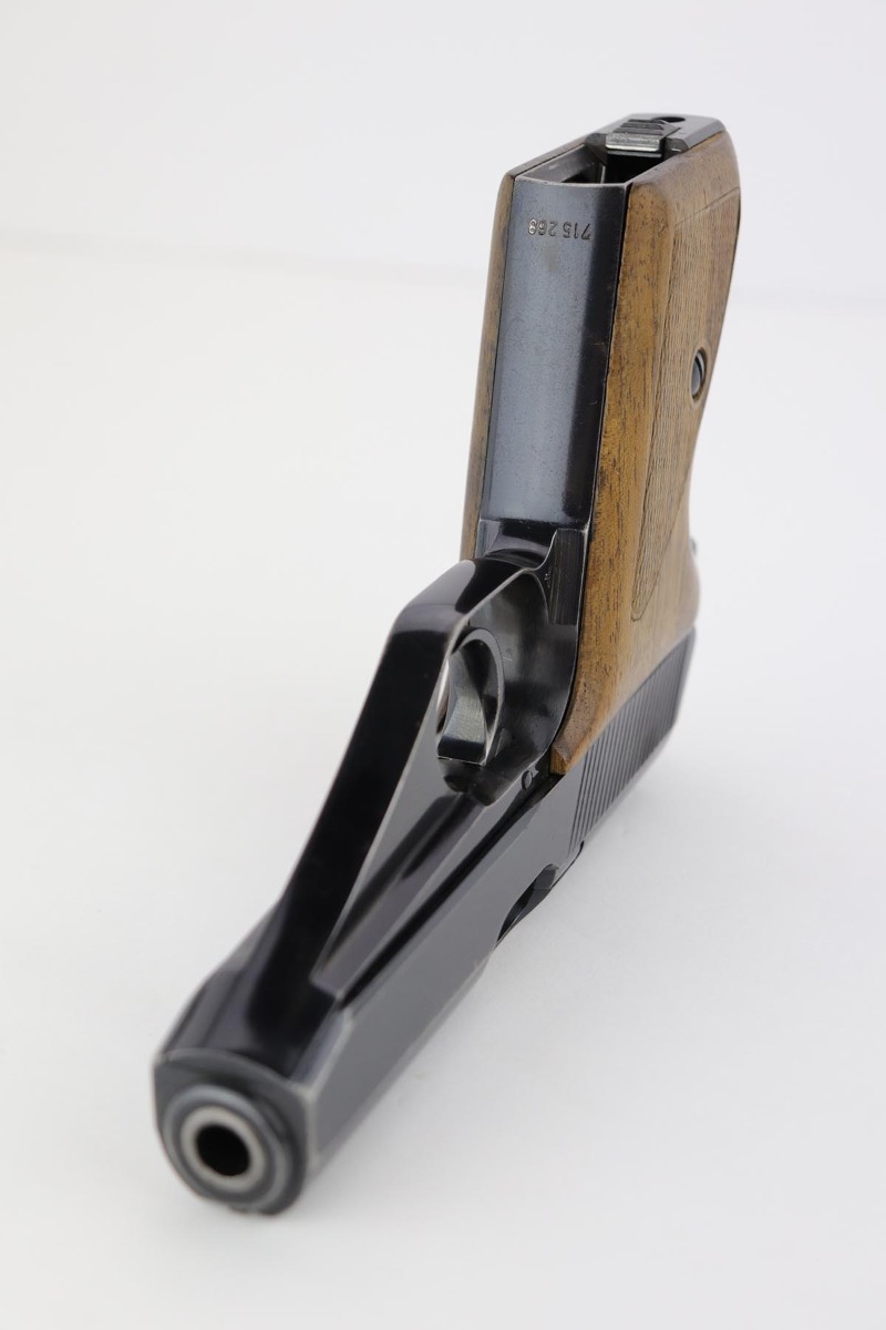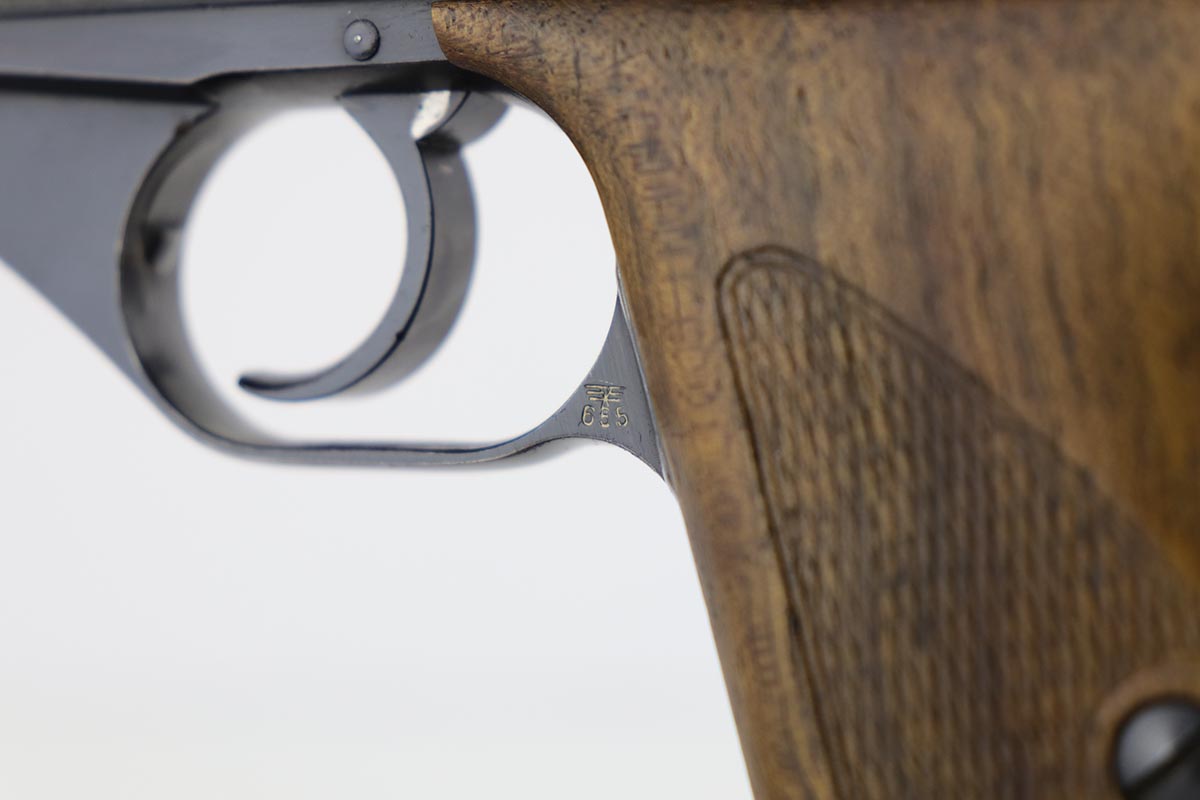 2/19/20 – This is the rarest of all the army issued Mauser HSc’s! One of only 3,000 produced, this is an early example with test eagle marking on left side tang. As production shifted from the M1934 to the HSc, the earliest examples were marked in the same fashion as the Army issued M1934s. This example is all original with about 92-94% high-polish blue remaining. There is minor patina/oxidation on the straps, and an area of finish loss on the bottom of the back strap. Both sides of the slide have common muzzle wear, and the right side of the slide has a few spots of finish loss mixed in. Minty bore and excellent grips. Banner magazine.