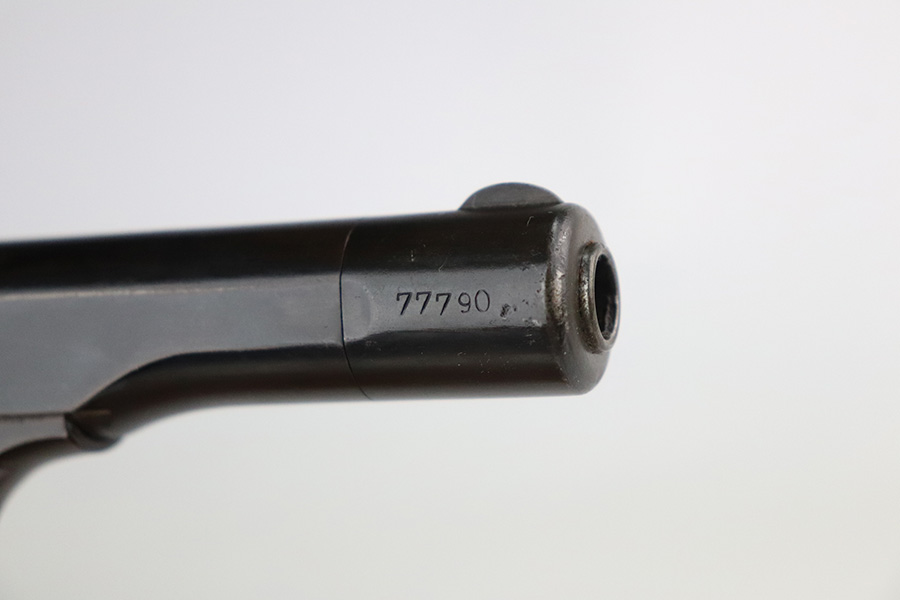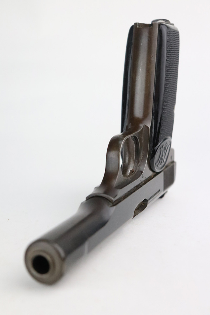 7/22/21 – This is a rare and highly desirable example of an early Nazi FN Browning M1922 pistol. It’s WaA613 proofed on slide and frame and chambered in 9mm Kurz. These pistols were assembled from prewar Dutch contract production but without the Wilhelmina crest or lanyard ring. Nice grips which are cut for the lanyard ring. The pistol is all matching but the finish was restored at some point, seemingly many years ago. Strong, shiny bore. Rare WaA613 proofed magazine.