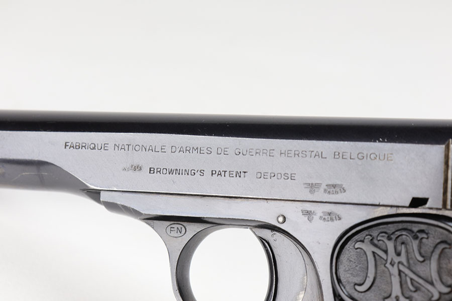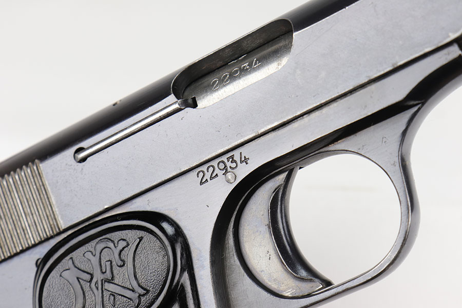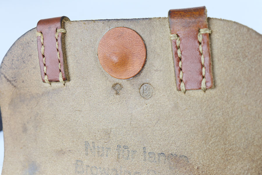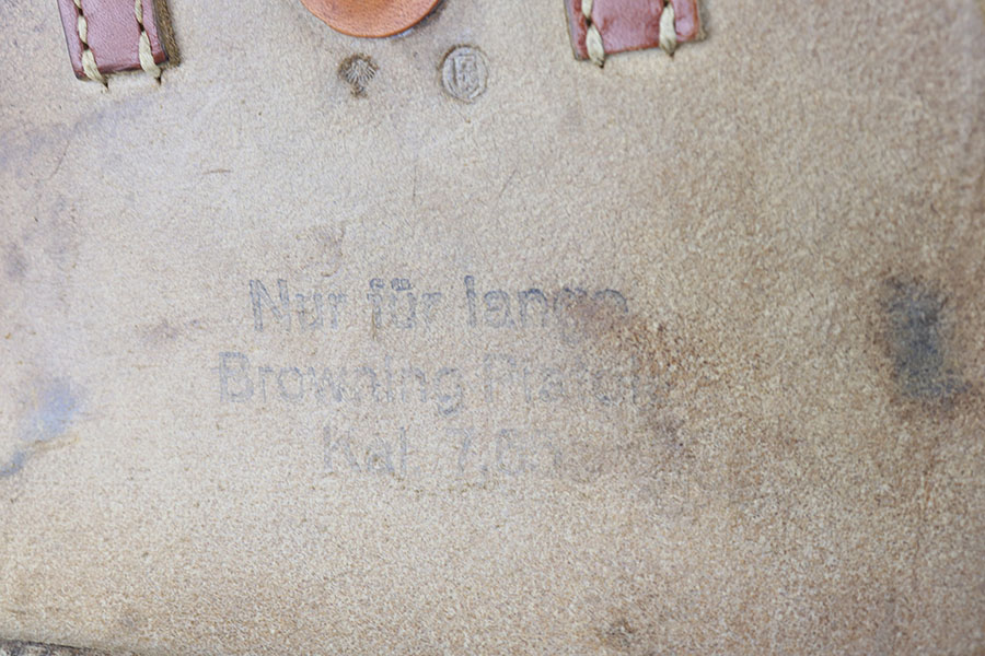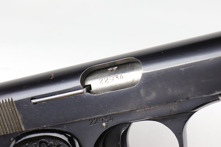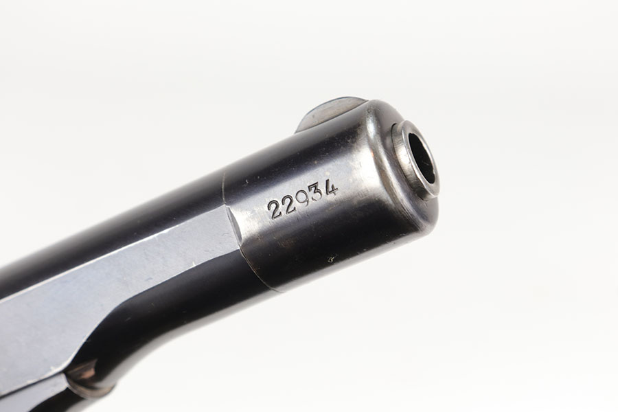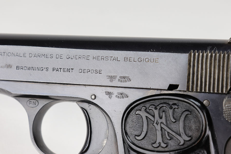 10/23/20 – This is a rare and very early Nazi FN Browning Model 1922 pistol rig with holster and spare magazine. Production of the Model 1922 by Germany began in late 1940 with serial number 20,000, and the first 5,000 were marked with WaA613 proofs on slide and frame. This is one of those pistols and it’s in the correct serial range. It has the correct early grips with cut for a lanyard ring in the left panel. The pistol is in very good condition with the standard muzzle wear from the tight holster, and some thinning/browning of the grip safety. Mint bore and excellent grips. Comes with an excellent Eagle/2 marked holster with internal inkstamp, Total of two original magazines, one of which has WaA613 proof on spine.