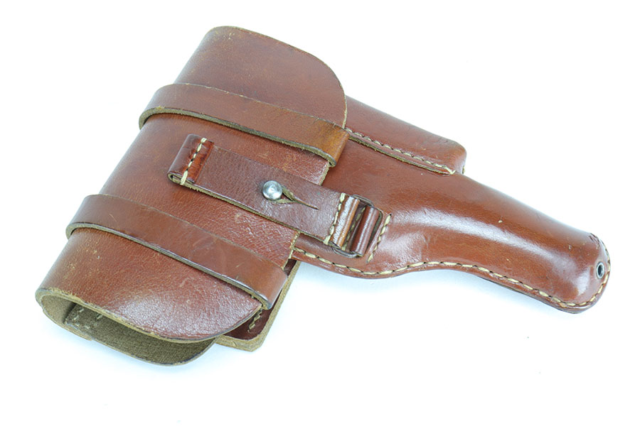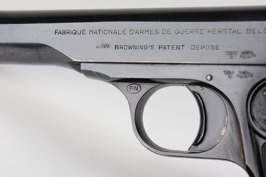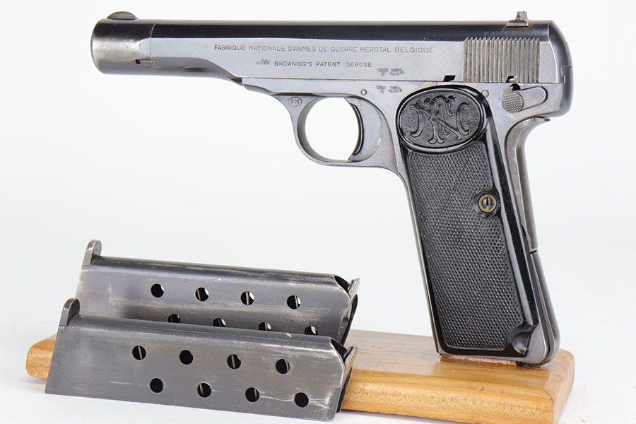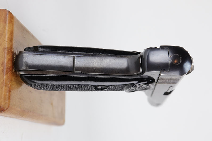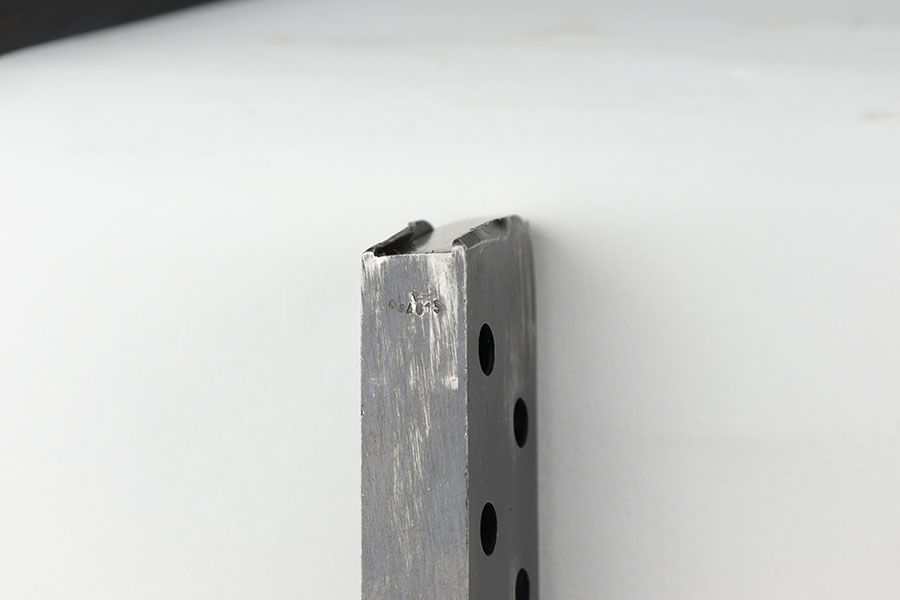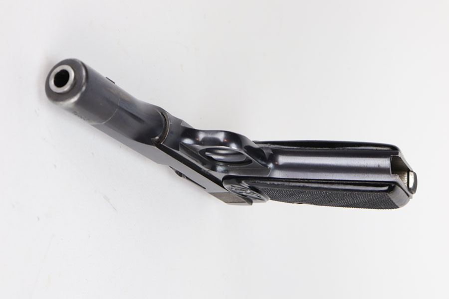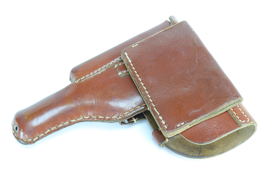 10/23/20 – This is a rare and very early Nazi FN Browning Model 1922 pistol rig with holster and spare magazine. Production of the Model 1922 by Germany began in late 1940 with serial number 20,000, and the first 5,000 were marked with WaA613 proofs on slide and frame. This is one of those pistols and it’s in the correct serial range. It has the correct early grips with cut for a lanyard ring in the left panel. The pistol is in very good condition with the standard muzzle wear from the tight holster, and some thinning/browning of the grip safety. Mint bore and excellent grips. Comes with an excellent Eagle/2 marked holster with internal inkstamp, Total of two original magazines, one of which has WaA613 proof on spine.
