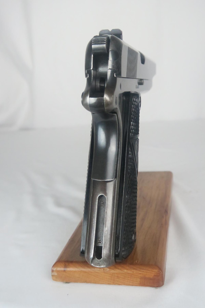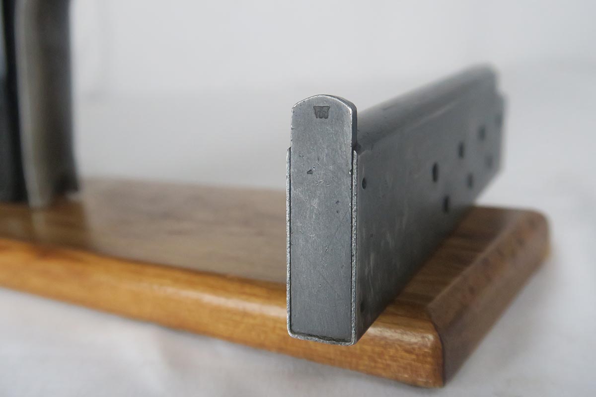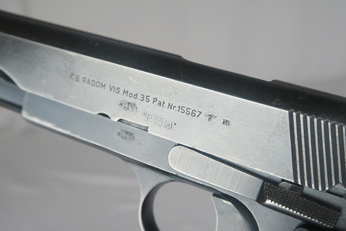 1/31/18 – This is a rare slotted Radom P.35 variation, with pre-alphabet serial number. There were only 12,000 of this variation produced, compared to the 47,000 later slotted Radoms produced. This scarce variation has no lanyard loop and no letter prefix to the serial number. This pistol is all matching and original with about 85% blue remaining. There is uniform thinning on the slide and front strap. The magazine is waffen proofed and the black plastic grips are in very good condition with no major chips or cracks. Bore shows minor use but is shiny with strong rifling.