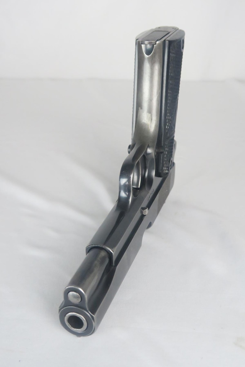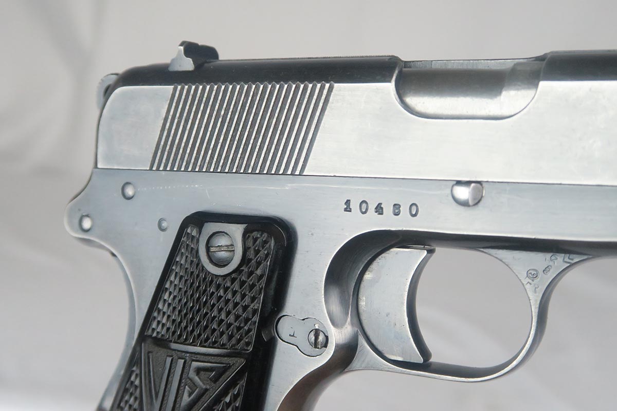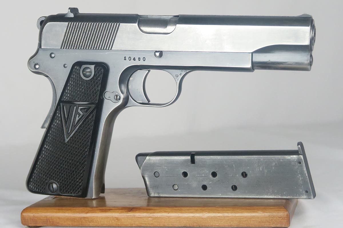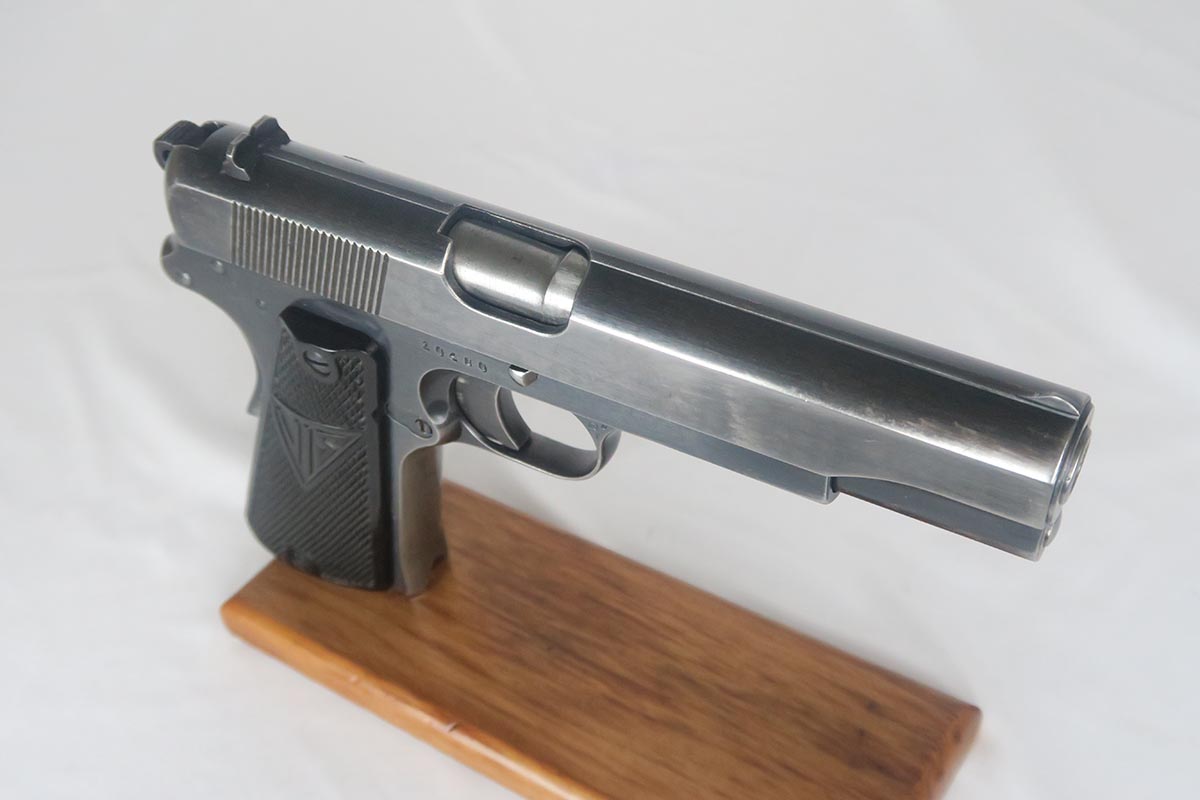 1/31/18 – This is a rare slotted Radom P.35 variation, with pre-alphabet serial number. There were only 12,000 of this variation produced, compared to the 47,000 later slotted Radoms produced. This scarce variation has no lanyard loop and no letter prefix to the serial number. This pistol is all matching and original with about 85% blue remaining. There is uniform thinning on the slide and front strap. The magazine is waffen proofed and the black plastic grips are in very good condition with no major chips or cracks. Bore shows minor use but is shiny with strong rifling.