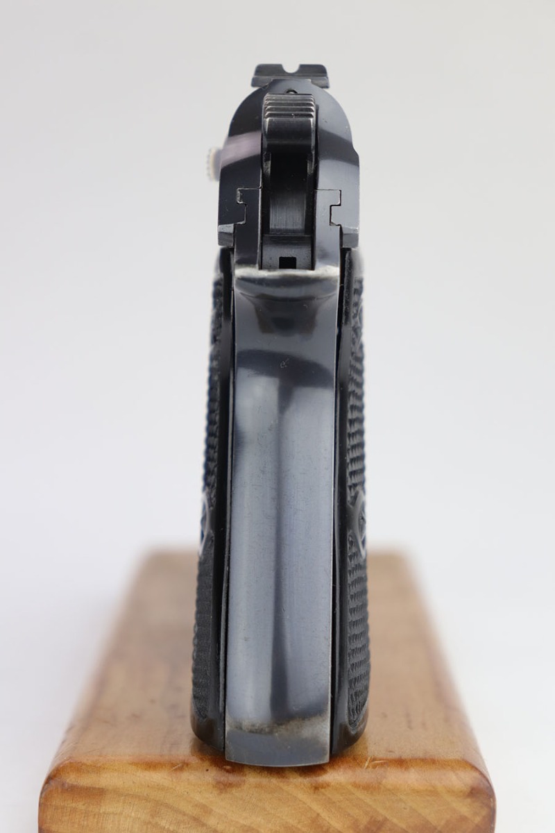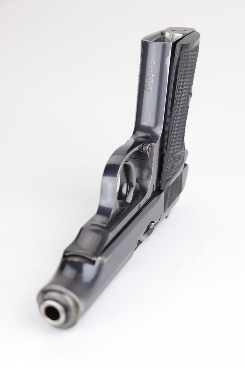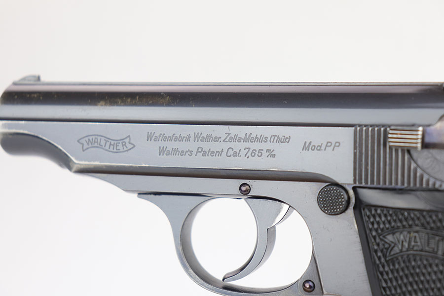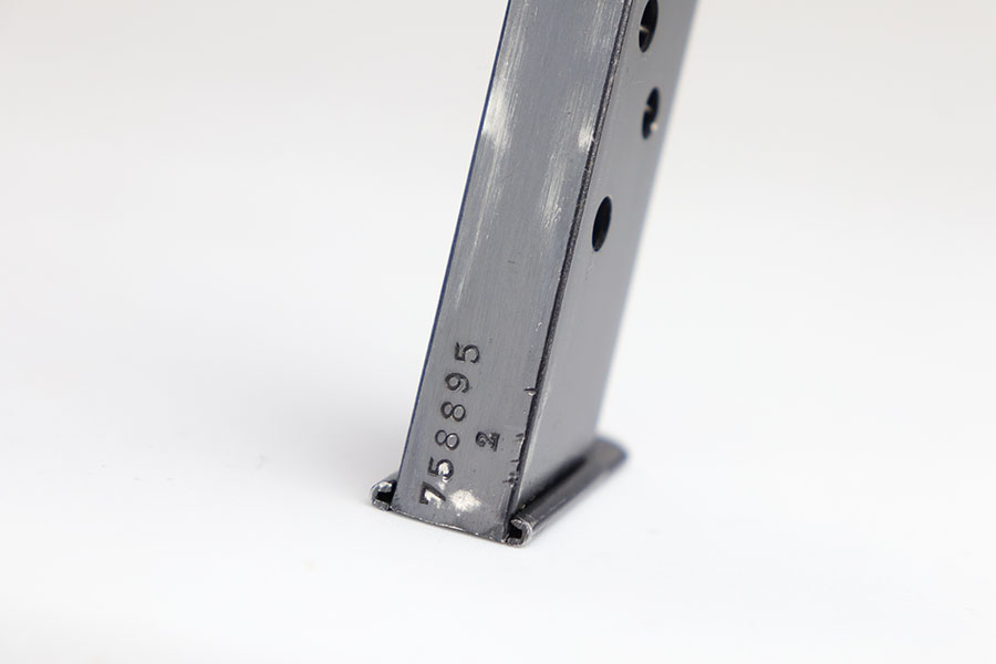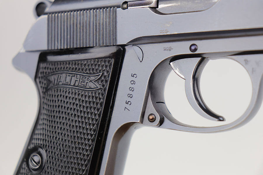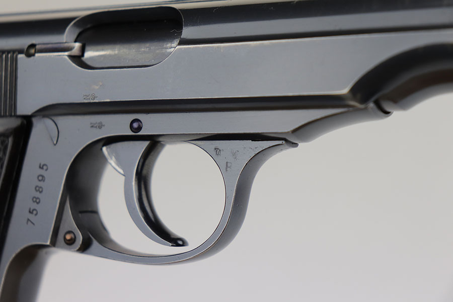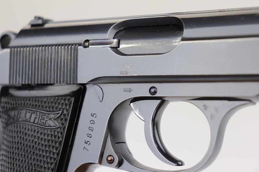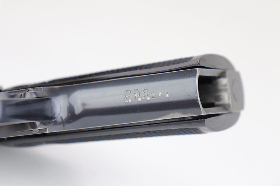 3/12/20 – This is a rare, early Walther PP that is marked ‘P.D.S.241’ on the front strap. It is believed this marking could indicate issue to the Police Department of Stuttgart, and there are several known examples in a similar serial range. The pistol is an early production Walther PP, either first or second year. The magazine is numbered in the police style and matching to the gun. It has early features such as the extended barrel, large ring hammer, reversed serial number and early weighted grips. Early two piece covered firing pin, too. The blue rates at about 94% with muzzle wear on both sides, an area of finish loss on the bottom of the back strap, and minor edge wear on the front strap. Terrific bore and excellent grips.