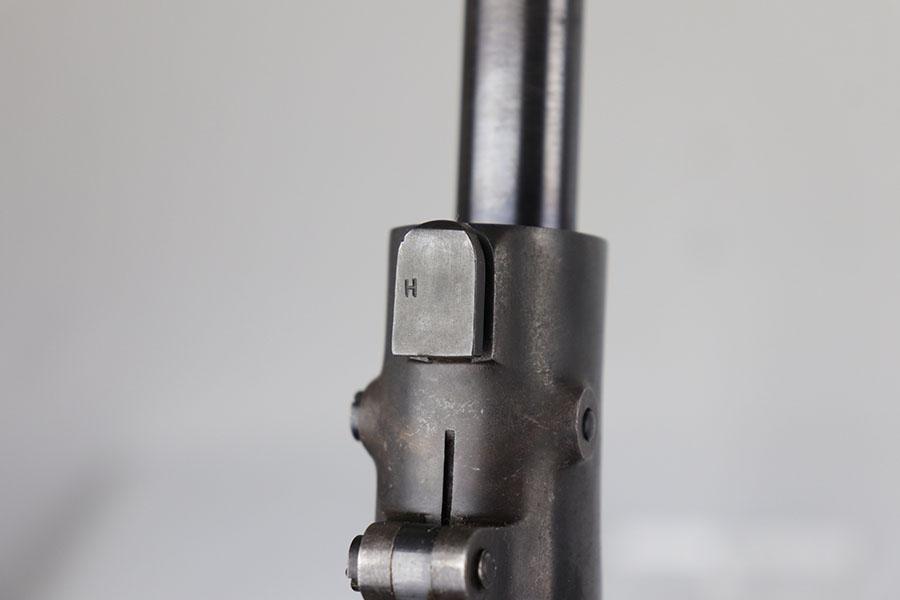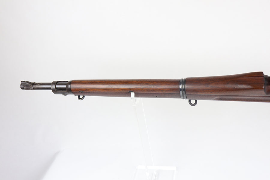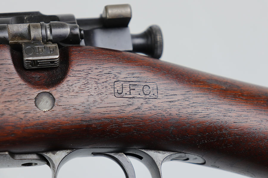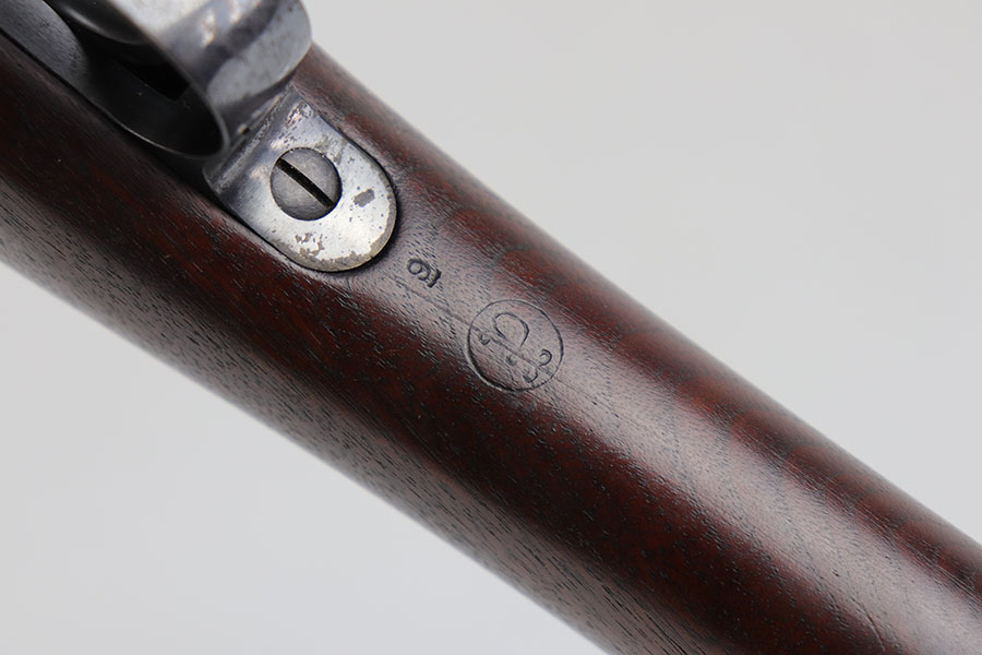 7/1/20 – This is a very early Springfield Model 1903 that is becoming harder and harder to find in original configuration. The barrel dates to November of 1910 when these rifles were still being blued, rather than parkerized. You can even see some of the original case hardening on the small parts. This one is in very good condition with most of the finish loss on the trigger group and the front sight. Excellent finish and all original which is extremely hard to find on these 1903 rifles. The rifle has a blued barrel, bolt, barrel bands, buttplate, trigger guard and floor plate. The receiver is case hardened with a dark, oil-quenched finish. The safety lock and magazine cut-off have a water-quenched, casehardened finish. The bayonet lug on the upper barrel band is stamped with the “H” found only on Springfield Armory bands. The “high-hump” hand guard has the sight relief cut and spring clips introduced in 1910. The stock is in fantastic condition with crisp JFC inspectors mark. A circled script “P” proof mark is stamped on the underside of the stock behind the trigger guard. Original cleaning kit in the buttstock. Excellent bore. Nearly impossible find for a WW1 US rifle collector.