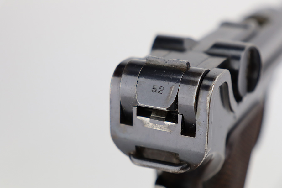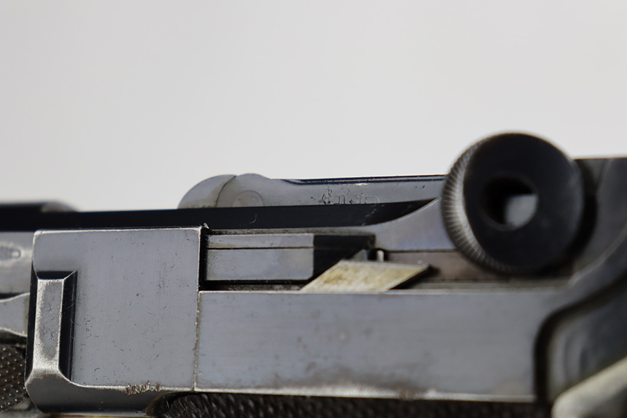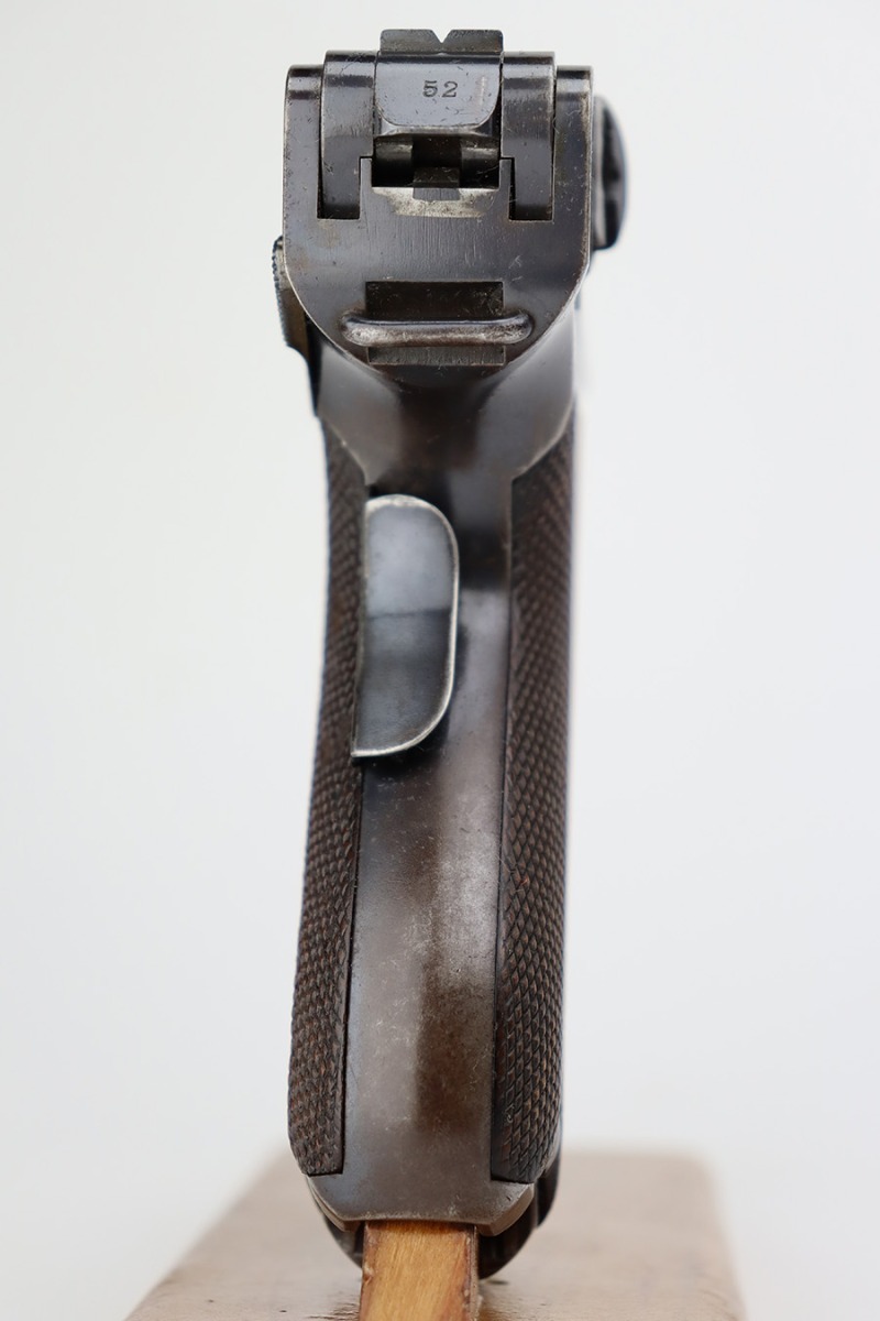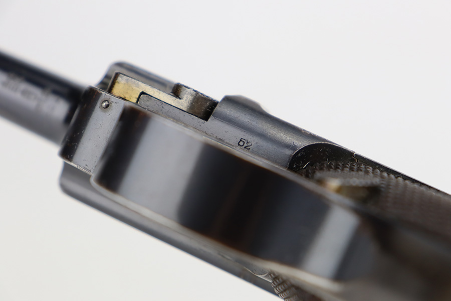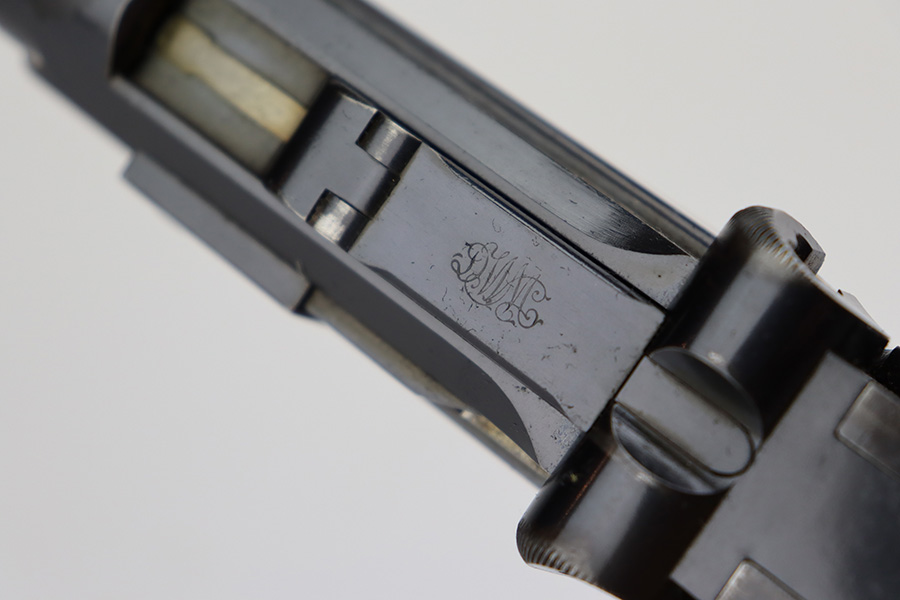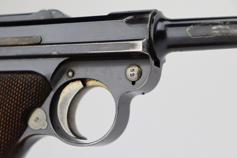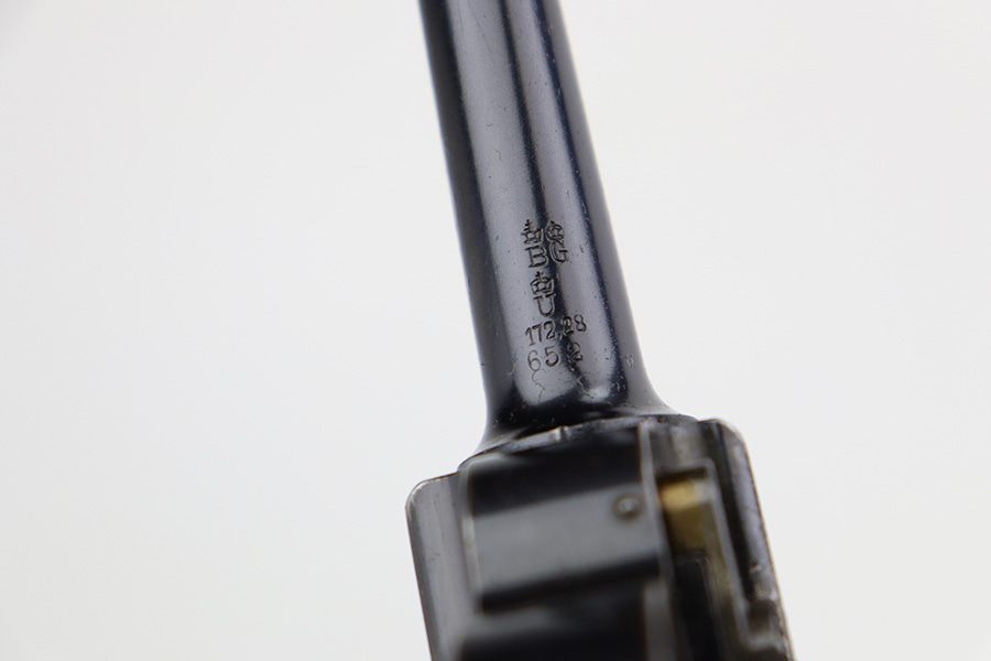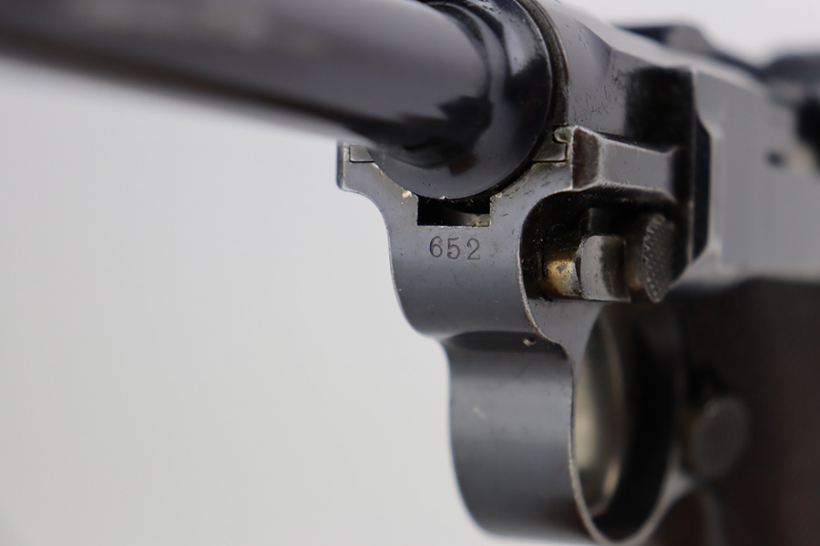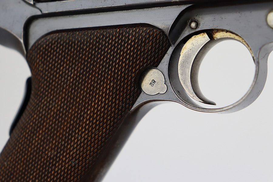 7/20/23 – This is a rare, super early 1900 Swiss DWM Luger with unrelieved frame. This is one of only 2,000 Model 1900 Swiss commercial Lugers manufactured with this specific pistol being a very early example with the very first “unrelieved type” frame with the early “wide checkered” safety lever and narrow trigger. These Lugers represent the very first commercial contract pistol sold by DWM and purchased by Switzerland. This Model 1900 Luger has all the early features such as: the dished toggles with toggle lock, a flat/recessed breech bolt, no stock lug, grip safety, early style, larger flat safety lever with coarse checkering, early narrow trigger, flat main spring and fast taper 4 3/4 inch barrel. The original finish rates at around 70% with notable wear on the straps and barrel. All numbered parts on the pistol match, including the original grips. Magazine is an early unmarked example with wood base but the base has a crack in it. The grips show minor handling wear but no cracks. Unfortunately the bore shows heavy use and has some pitting throughout.