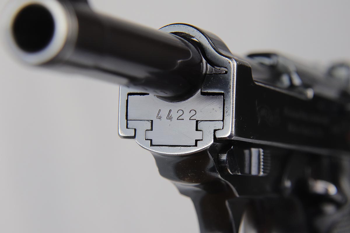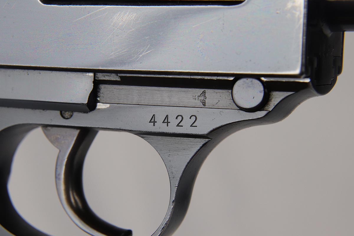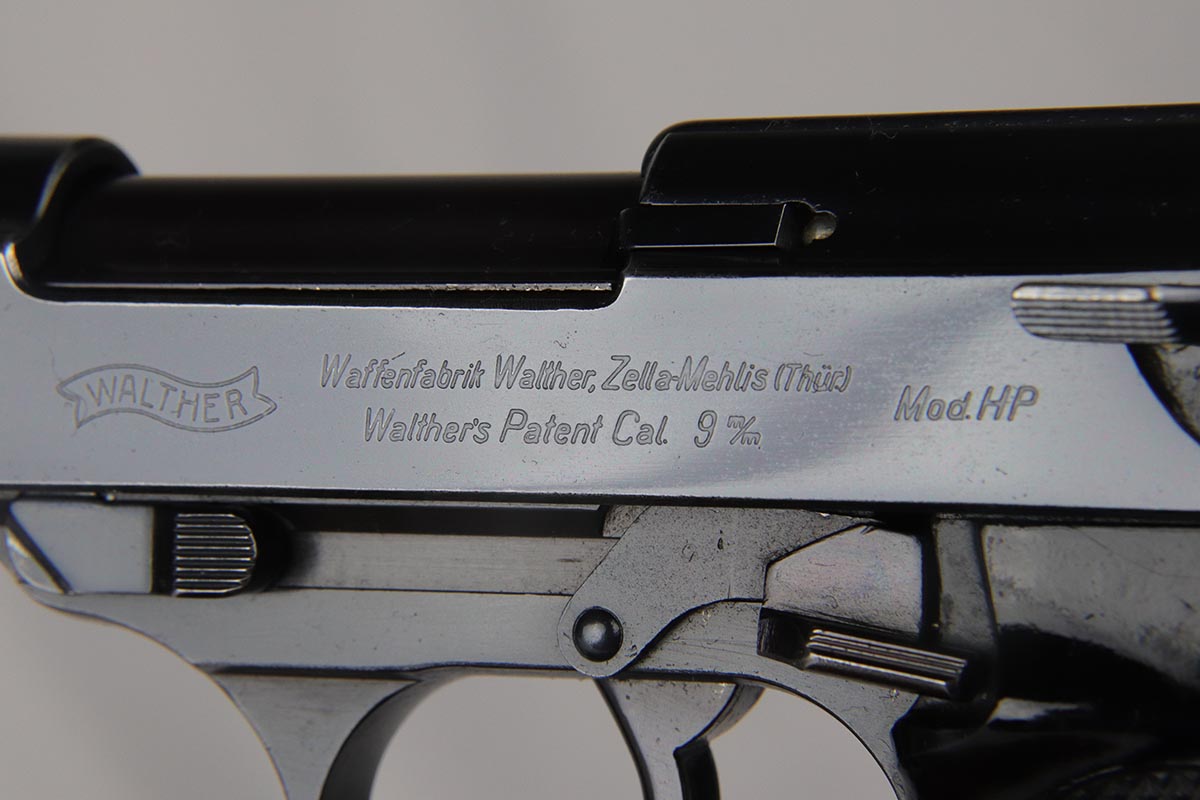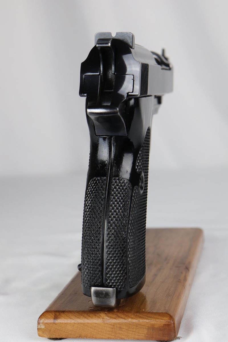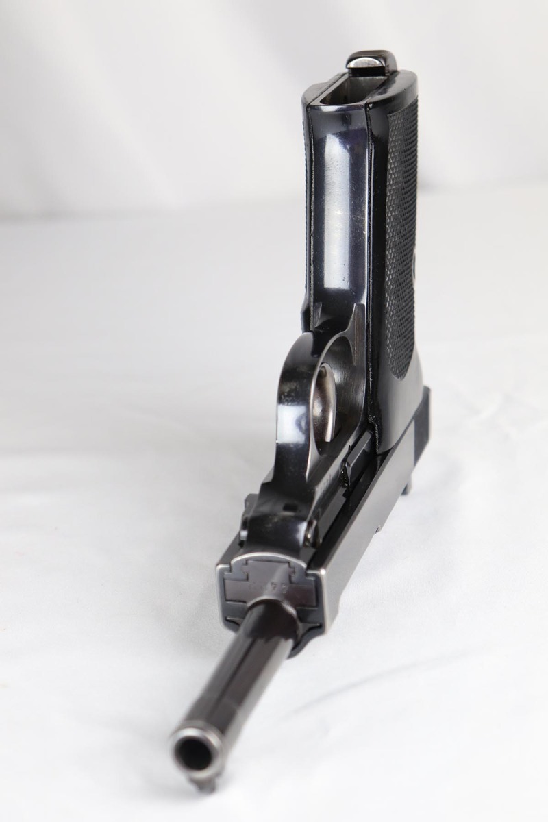 3/5/18 – This is a rarely seen, very early Mod HP with high-polish finish. I looked the serial up in Buxtons book and it cites only a few known in this serial range. They were made in the fall of 1940 and also in the similar range that they made a few .30 caliber guns and dural frame guns. This pistol has about 95+% of its original high polish finish on it. The bore is excellent – shiny, mirror-like. The numbers are all matching including on the inside of the slide, on the frame , barrel and locking block. Each part also has a crisp Eagle/N commercial proof including on the barrel and locking block. Mechanically excellent with the de-cocking feature intact. It has correct commercial, early grips.