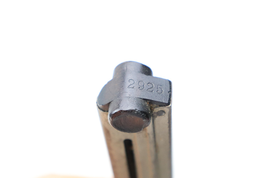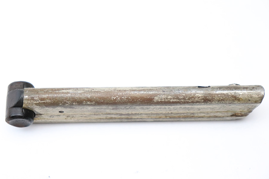 6/15/22 – This is a rare, early style pre/early WW1 Luger magazine. The wood base of the magazine has serial numbers that run vertically from the front spine to the back. This was only practiced in the first run of military production magazines, making these very desirable for collectors. The magazine base is in great condition with only one small chip on the right “ear”. The tube has some surface patina throughout as shown in photos, but no deep rust or pitting. The spring is fully functional.