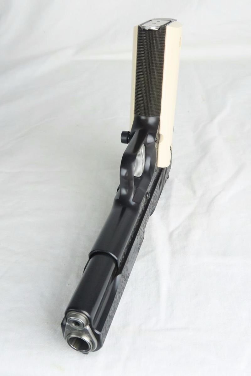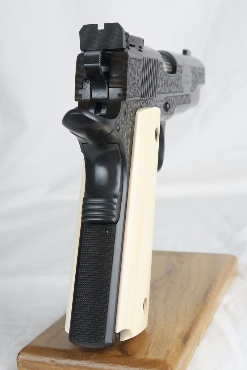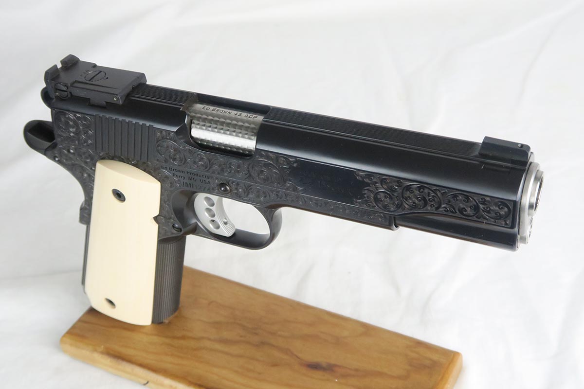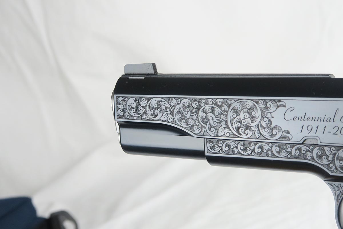 •  Hand relief engraved package (includes flats of slide and frame, grip screws, and flats of thumb safety, grip safety, slide stop, and mag release).