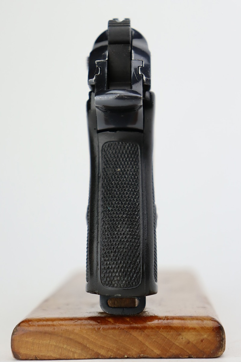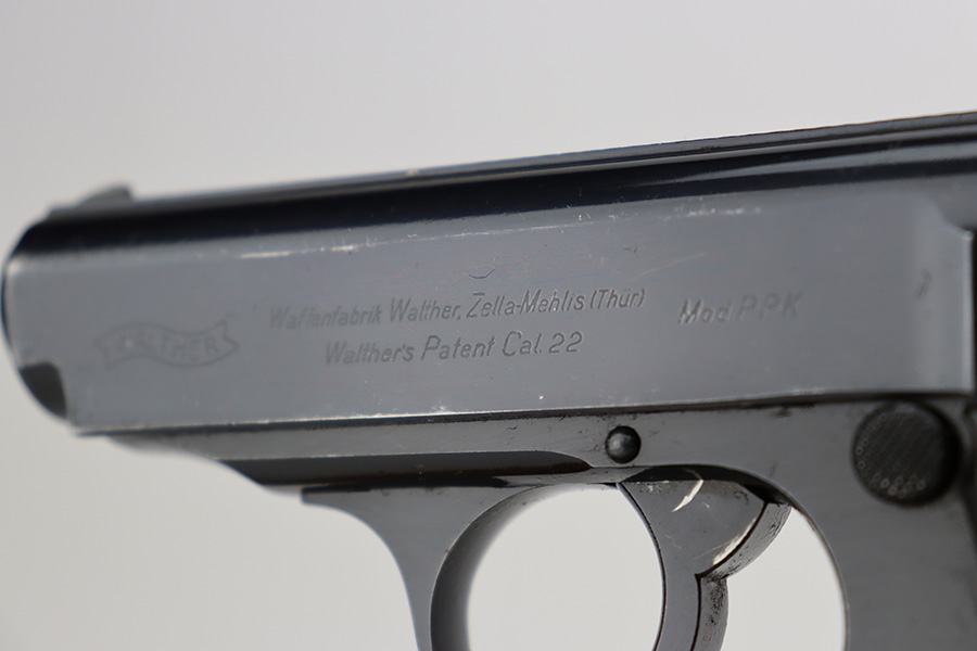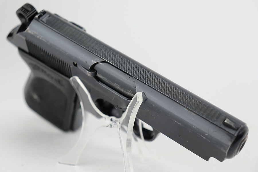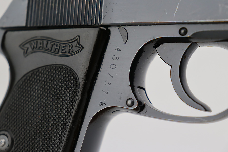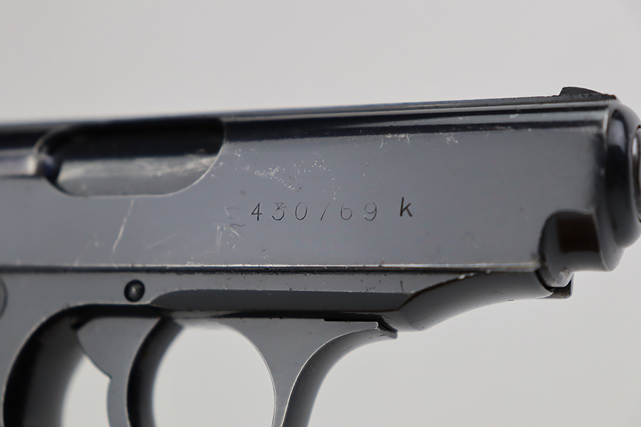 7/11/23 – This is a rare end-of-production Walther PPK, chambered in .22 LR. This is likely a GI put-together gun when the factory was liberated at the end of WW2. The slide and frame are mismatched but both have an extremely late serial number. What makes this gun even more desirable is that it has an original high polish finish. It has retained about 96% of its bluing with very light scratchy wear along both sides of the slide, more noticeable on the right side. Fitted with a late-war black plastic grip and comes with a post-war magazine. Mint bore.