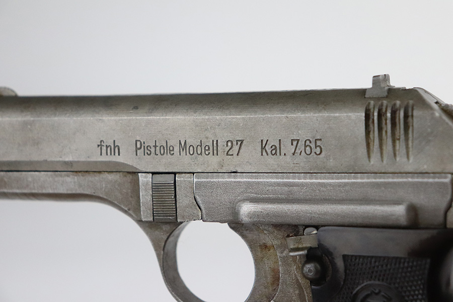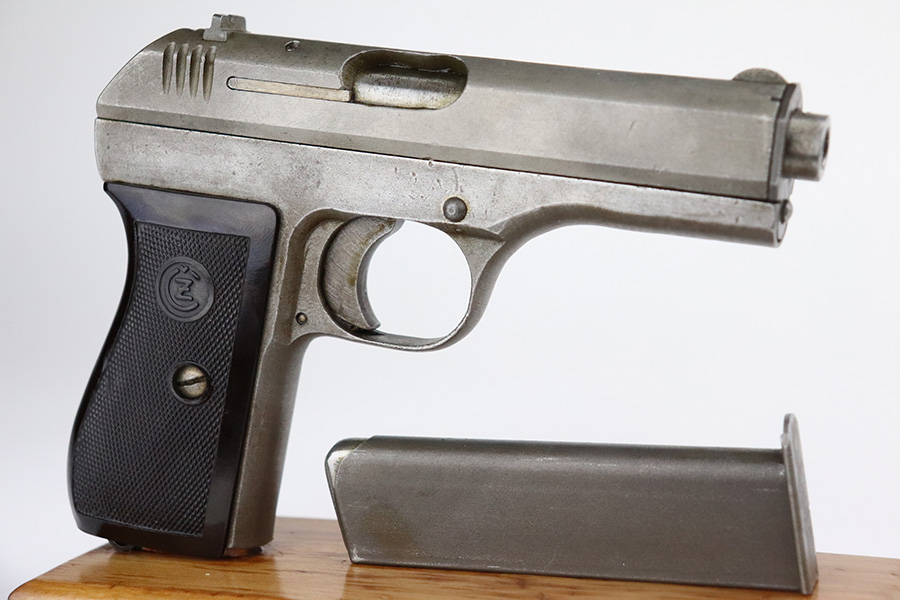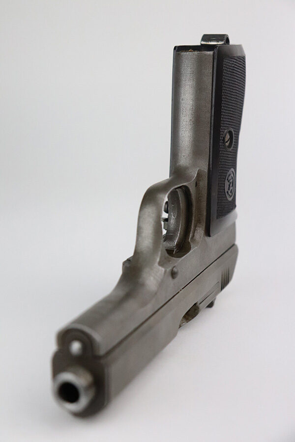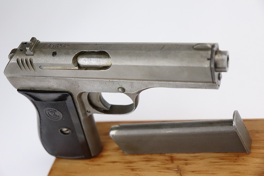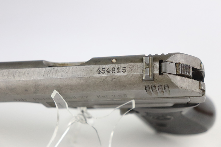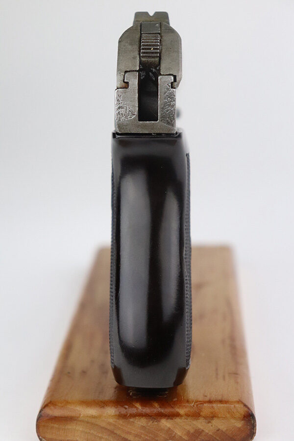 7/9/21 – This is an excellent example of a rare end-of-war CZ Model 27. It is matching, has no slide legend, and has no proofs. It also has an all-phosphate finish. It likely never issued to the Nazi military. These phosphate guns are difficult to rate but we estimate it has retained about 95% of its finish with tiny spots of oxidation throughout. Comes with an excellent grip – no chips or cracks. Also comes with a period-correct all-phosphate magazine. Mint bore.