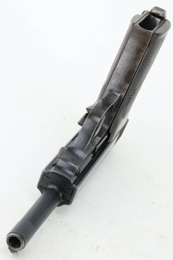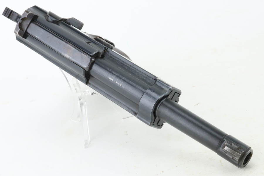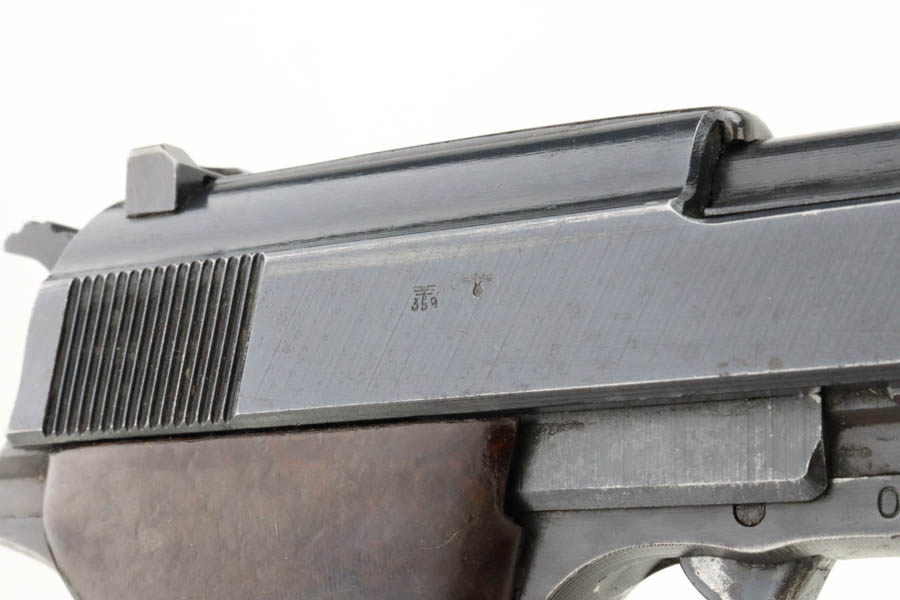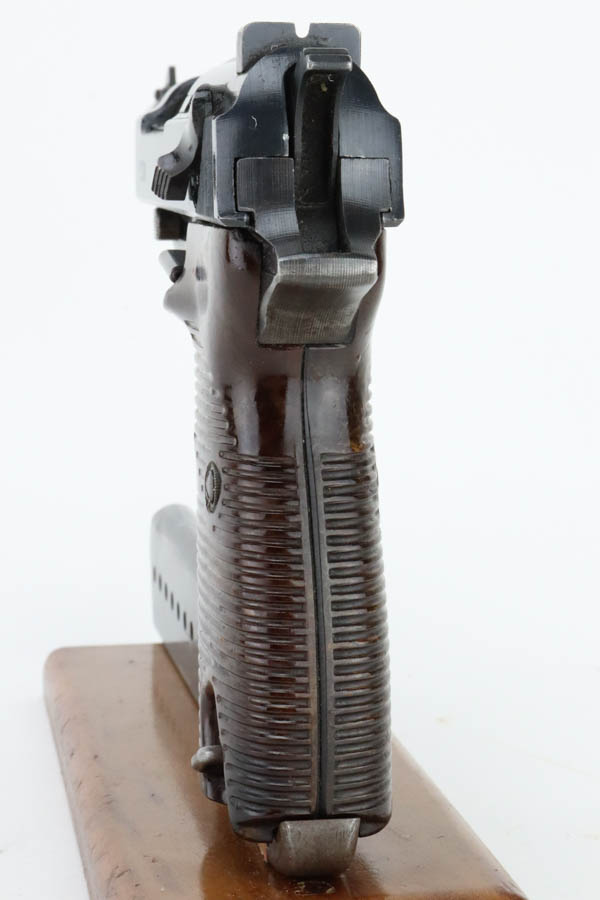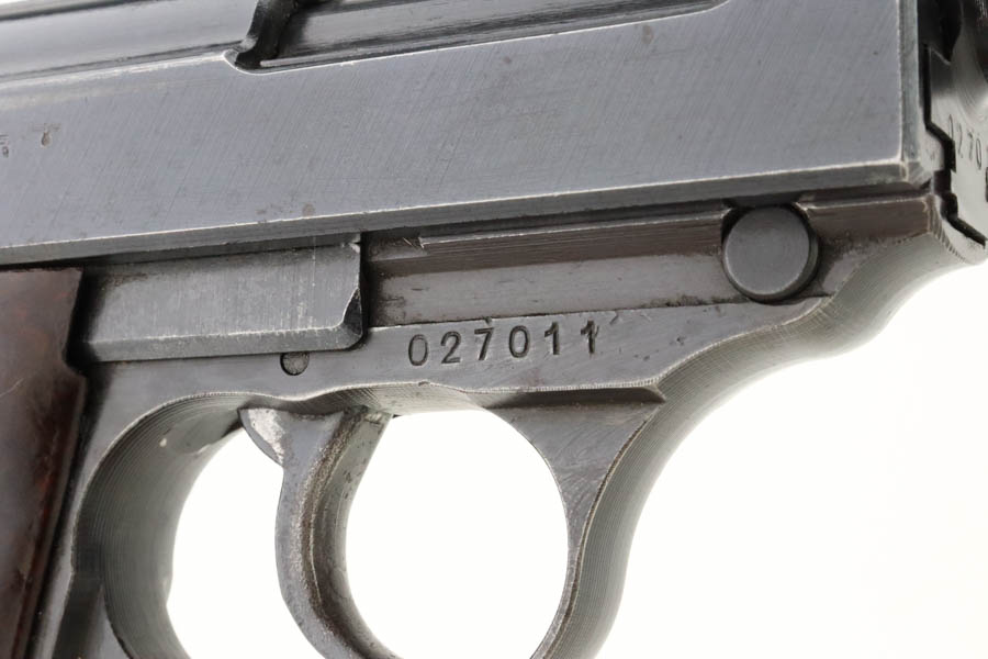 7/8/24 – This is a very nice example of a very rare “Zero Series” Walther P.38, manufactured in 1945. They are called a zero series because the serial numbers start with a zero. Only 1,750 of these were produced according to Whittington’s book. This one is all matching and has “Eagle 359” military acceptance proofs. Late-war cog-style hammer. It has retained about 93% of its original finish. Almost all of the wear is on the front strap. Fitted with reddish bakelite grips and comes with a scarce “ac” marked Walther magazine. Nice bore with good rifling. De-cocker is functional.
