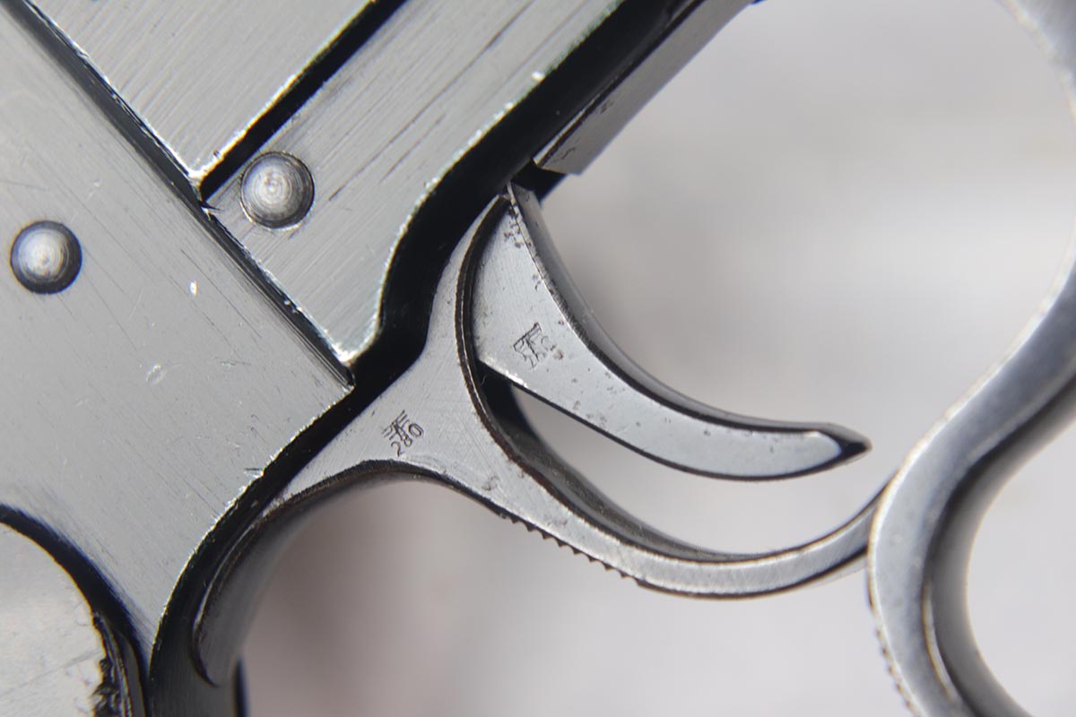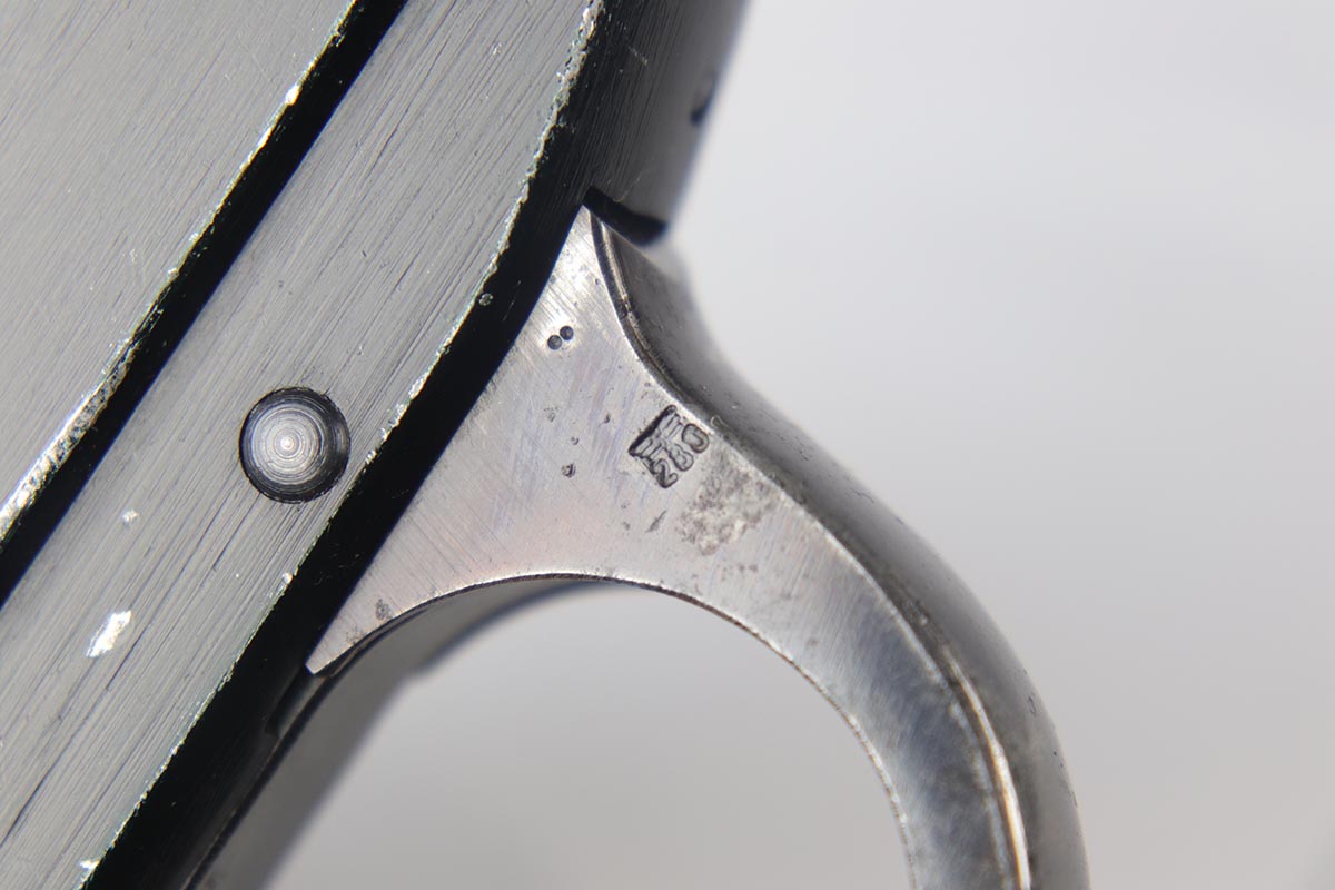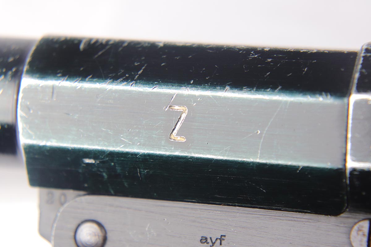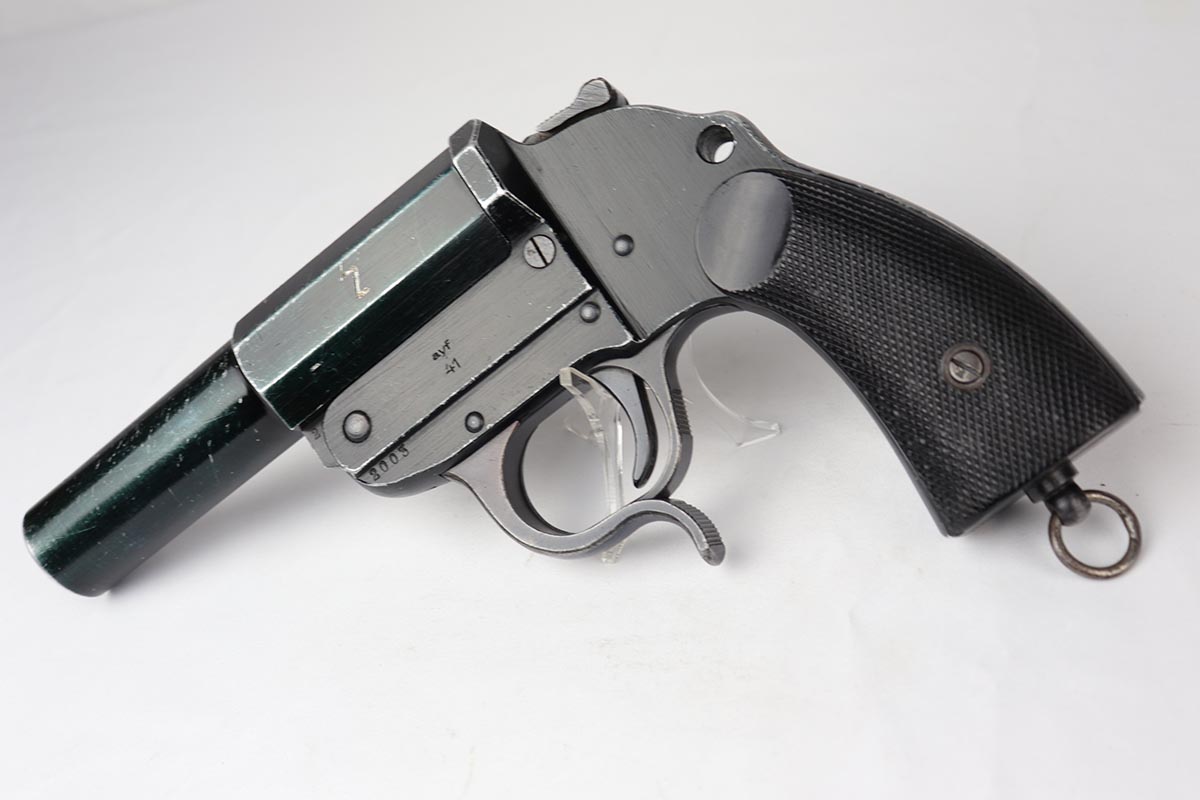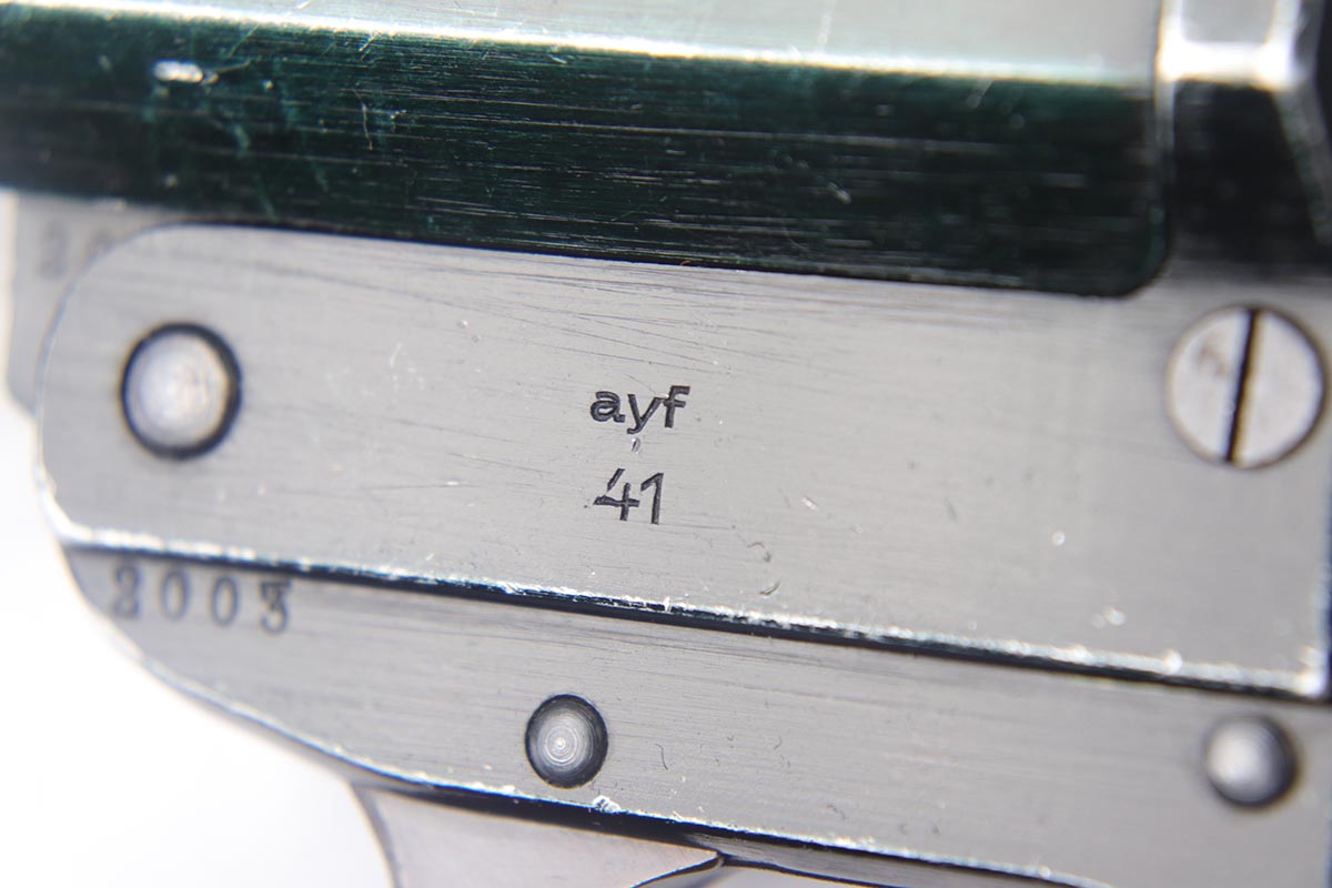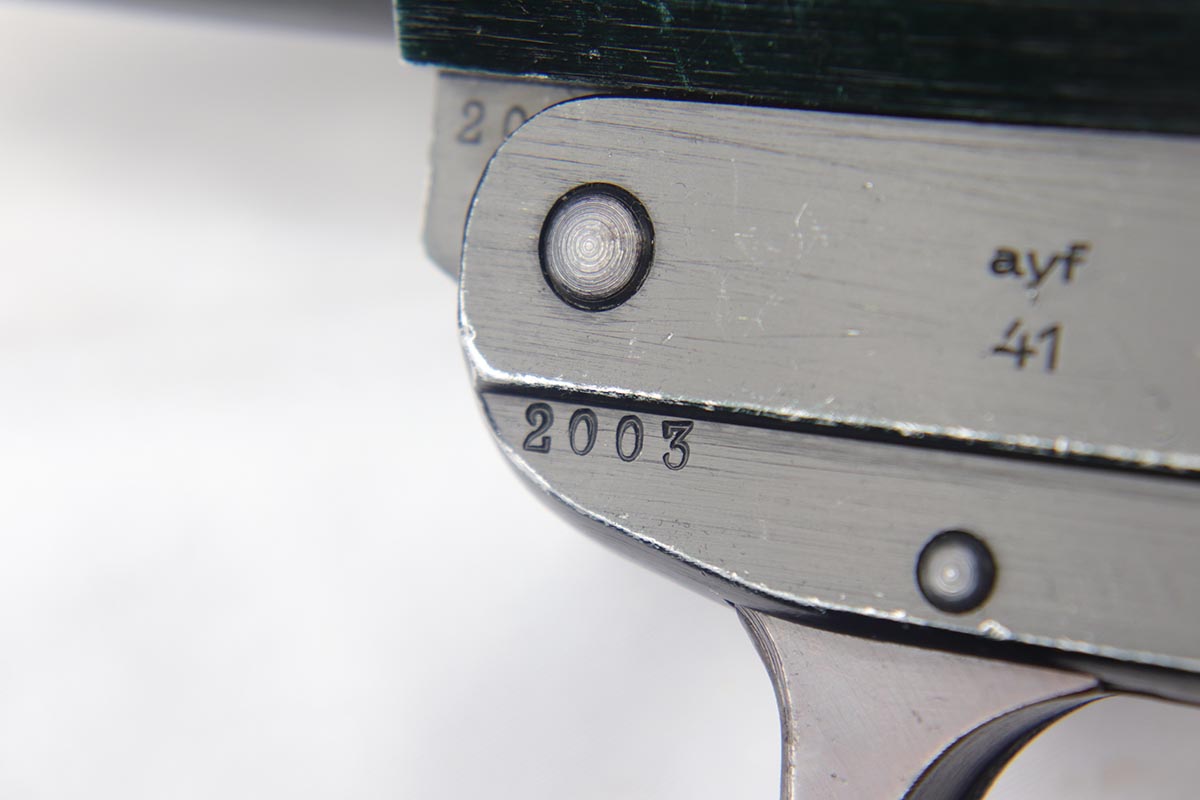 8/14/18 – This is a rare Erma Kampfpistole from 1941, also referred to as the Model Z. There were only 15,000 produced by Erma from 1939 to 1942. It was a modified flare gun that has a rifled bore and requires an FFL/C&R, as it could be used for both flares and grenades. Though marginal in an anti-armor role, the payloads could be deadly to lighter vehicles and fortifications. The ‘Z’ proof on the left side denotes ‘zuege’, and it is white phosphorescent to identify in the dark. The proof sits above the factory ‘ayf 41’ proof. Waffen marks are visible on barrel, frame and trigger assembly (280 proof). The pistol is in excellent condition with excellent original finish on the frame, while the anodized barrel shows a green tinge. Comes with two original spent flare casings.