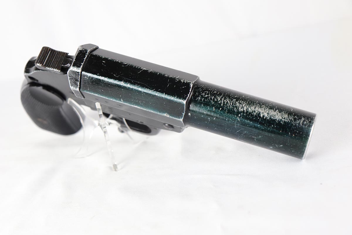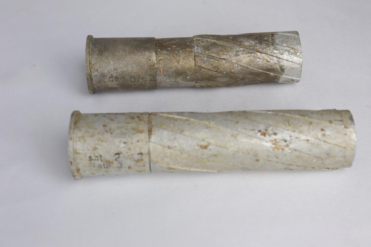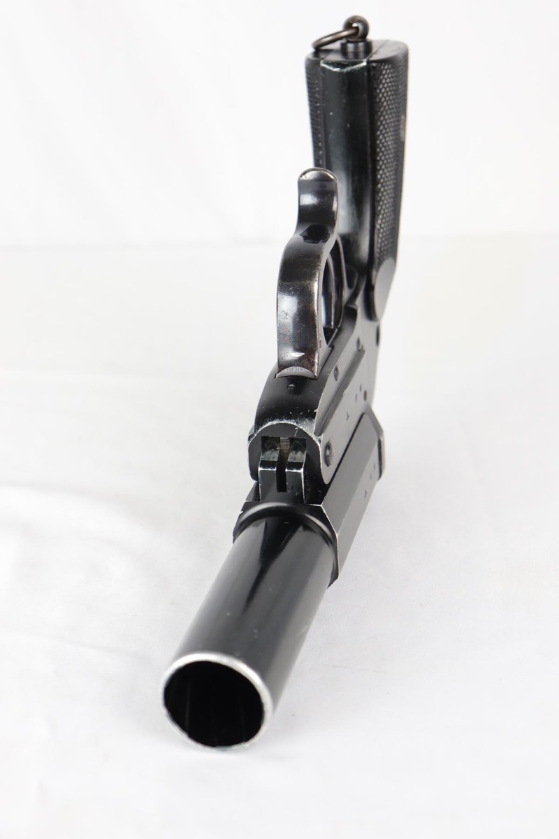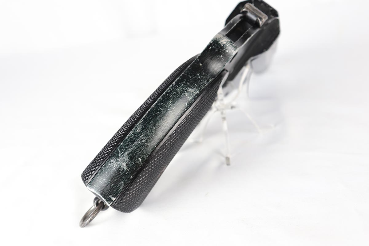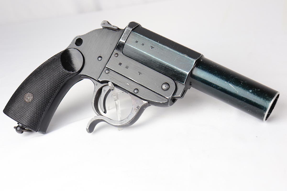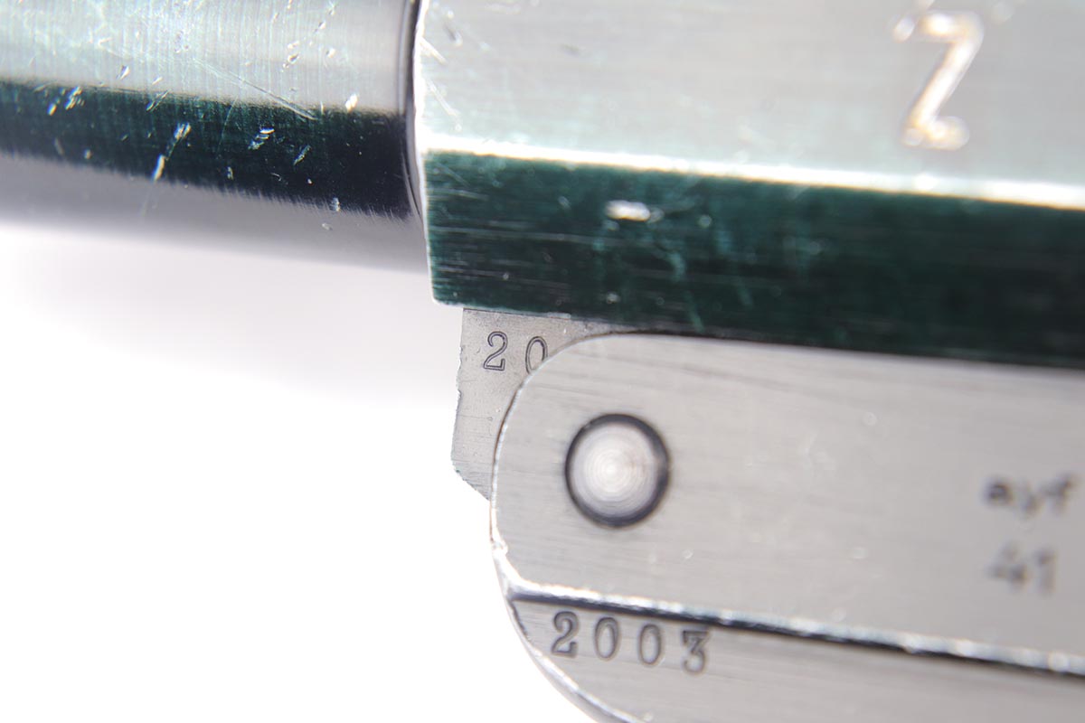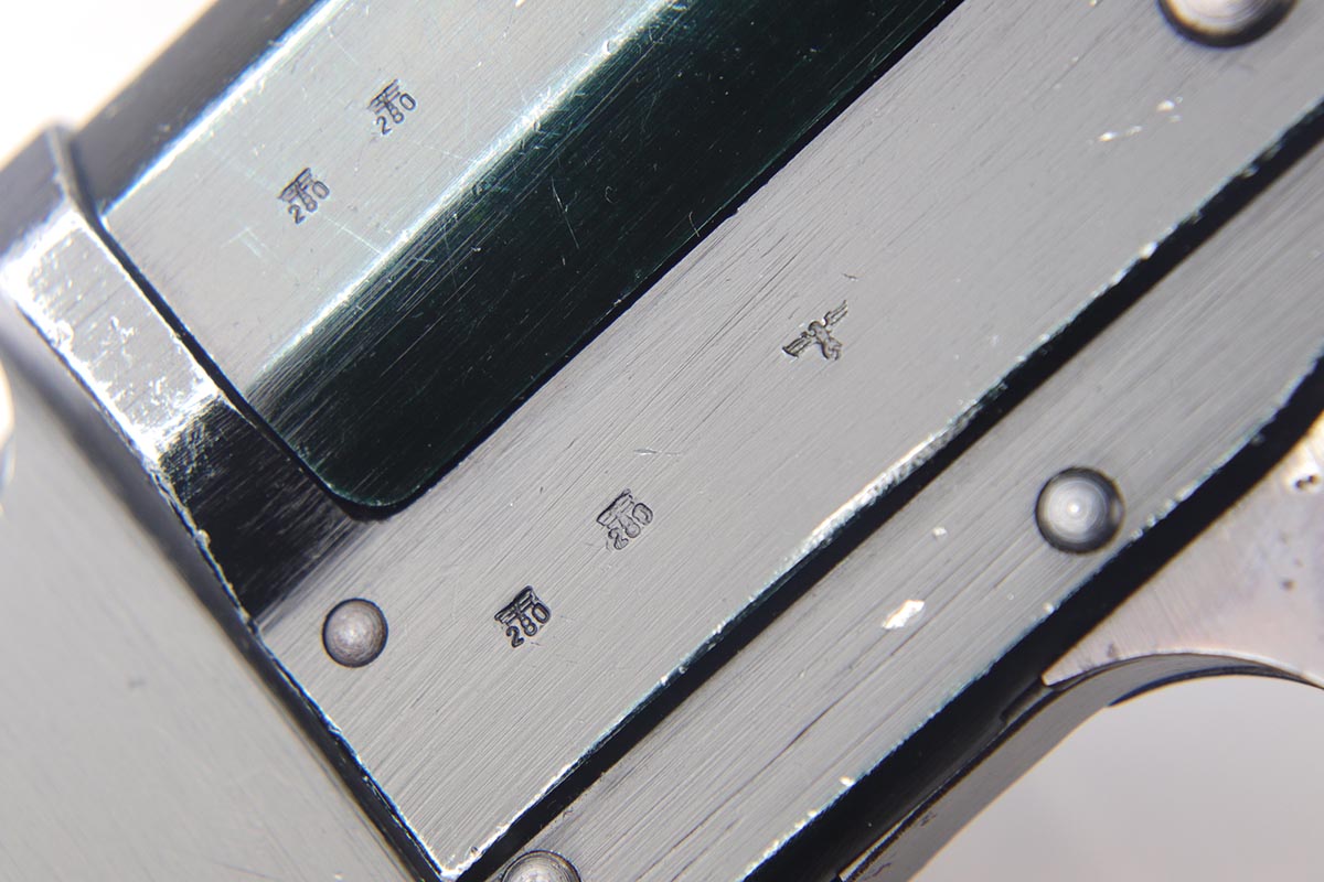 8/14/18 – This is a rare Erma Kampfpistole from 1941, also referred to as the Model Z. There were only 15,000 produced by Erma from 1939 to 1942. It was a modified flare gun that has a rifled bore and requires an FFL/C&R, as it could be used for both flares and grenades. Though marginal in an anti-armor role, the payloads could be deadly to lighter vehicles and fortifications. The ‘Z’ proof on the left side denotes ‘zuege’, and it is white phosphorescent to identify in the dark. The proof sits above the factory ‘ayf 41’ proof. Waffen marks are visible on barrel, frame and trigger assembly (280 proof). The pistol is in excellent condition with excellent original finish on the frame, while the anodized barrel shows a green tinge. Comes with two original spent flare casings.