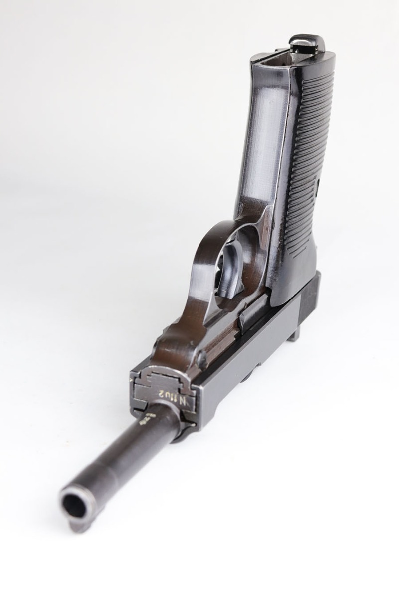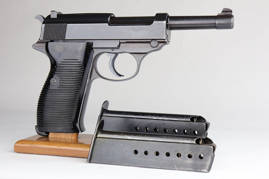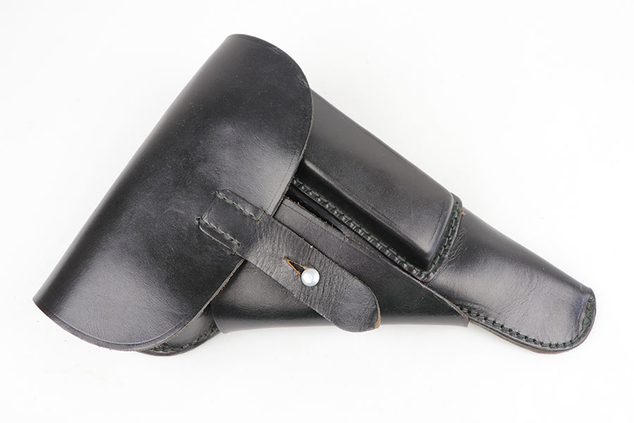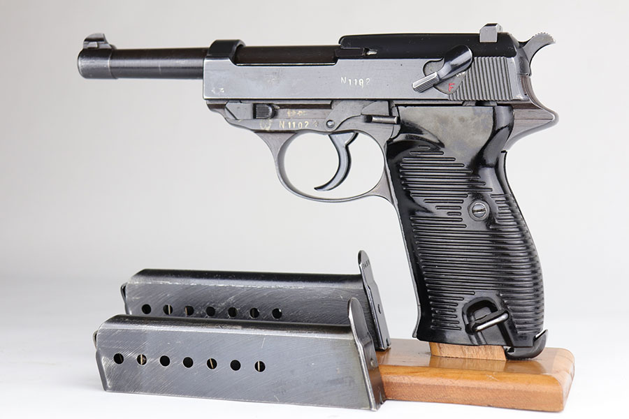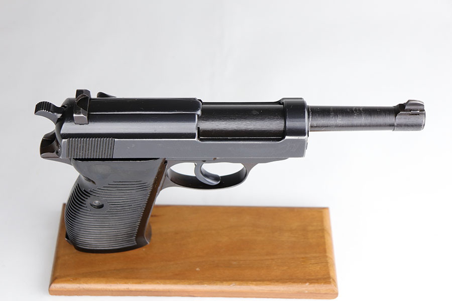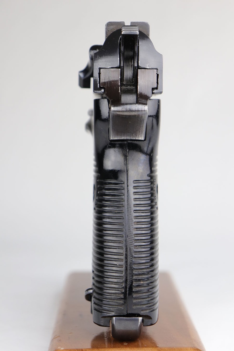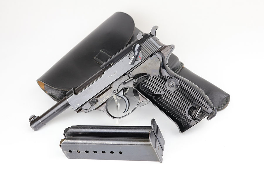 4/29/20 – This is a very unusual and rare P.38, made by the East Germans at the Ernst Thalmann Werk in Suhl. There was a very short run of P.38s, Lugers and PPs made in 1953, of around one hundred pistols each. It is speculated that this was a tool-up trial for full production until the Soviets put an end to it. Regardless, based on the serial numbers known there were only 121 of these P.38’s made. There are a number of subtle and not-so-subtle differences from the Walther-produced war-era pistols. One of the most obvious differences is the lack of a P.38 stamping on the slide. Warren Buxton describes these pistols in detail in Volume III of his 3-volume P38 book. Aside from the unique characteristics that set this variation apart from all other P.38’s, the serial number is prefaced with an “N” and falls in a range from N1000 to N1120. It appears that the East Germans manufactured all the parts new with the exception of the barrel, which was made by Ceska Zbrojovka aka CZ (WW2 code “fnh”) using WW2 tooling, and possibly the locking block. Where the lock block type is known, they appear to be re-used/re-numbered WW2 lock blocks. This pistol (N1102) has a completely blank block which was probably a parts-bin leftover from WW2.