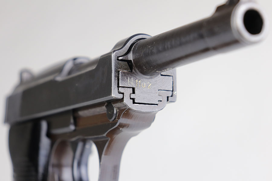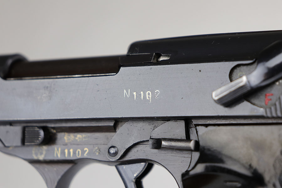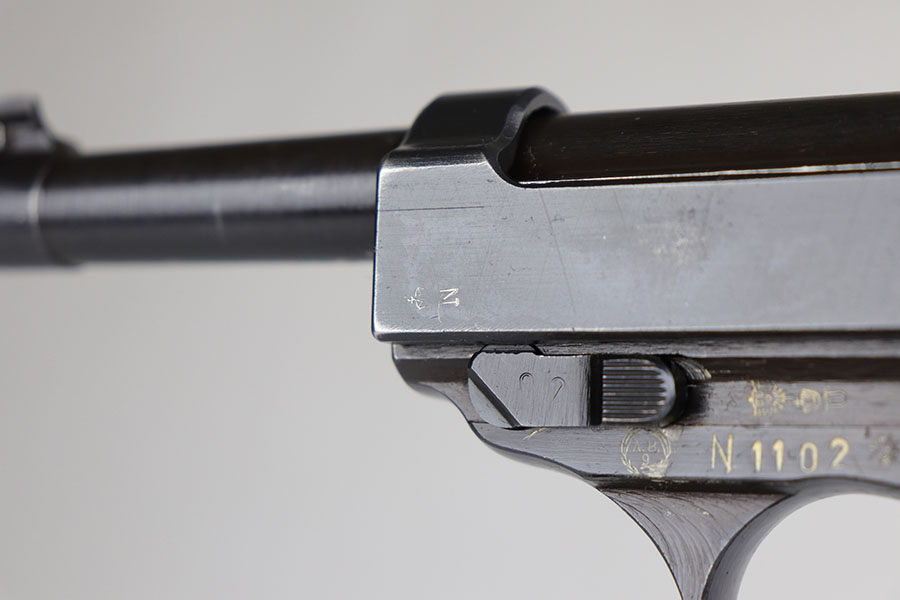 The A.B.9 inspection stamp is on the left side of frame, along with the “State Eagle” proof, Crown/U proof and “daisy” final proof marking. An Crown/N proof is on the left front slide and underside of the barrel, along with the barrel date of 8/53 (August 1953). The serial number is stamped on the left side of the frame, left side of slide, and barrel face in positions similar to Walther WW2 pistols. The barrel latch has “02” (last 2 digits of S/N) stamped on it, similar to other known examples. The lock block is unnumbered and unmarked; there are no indications it was ever marked, and there are no grinding marks. There is a noticeable rough appearance to this pistol both in the machining and the parts fitment. The poor fit of the barrel at the front is typical for these.