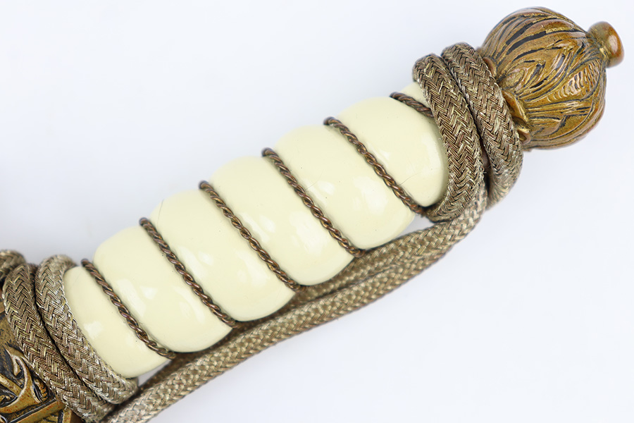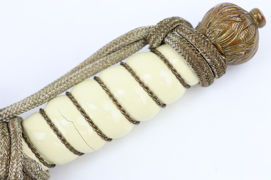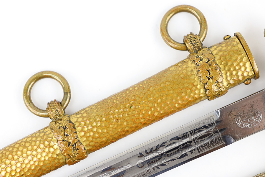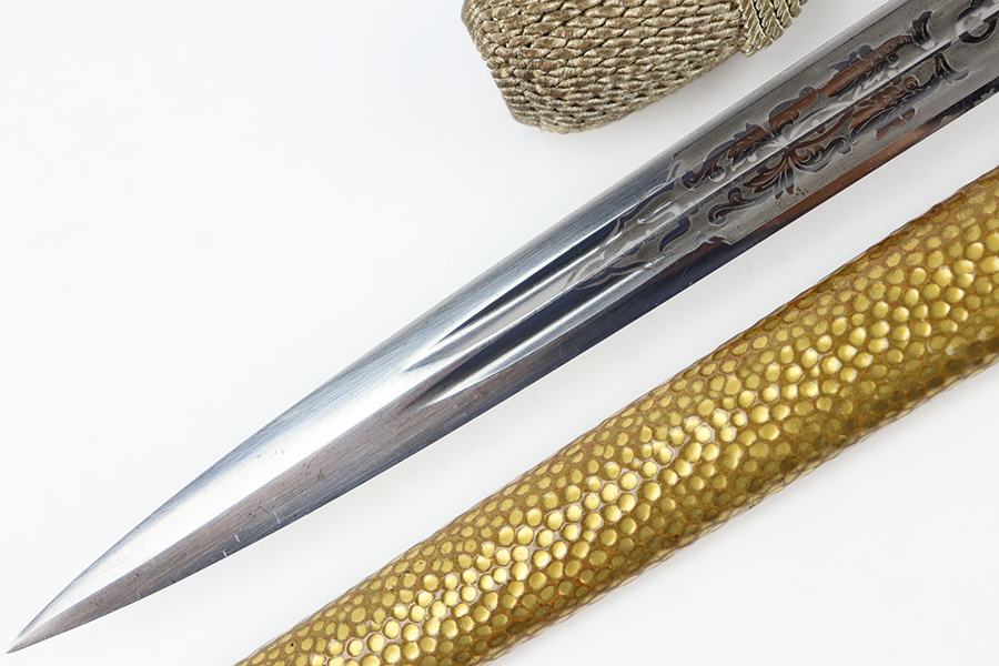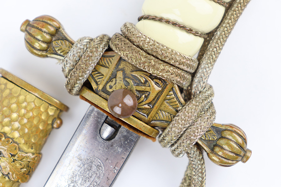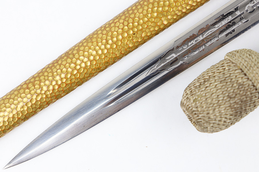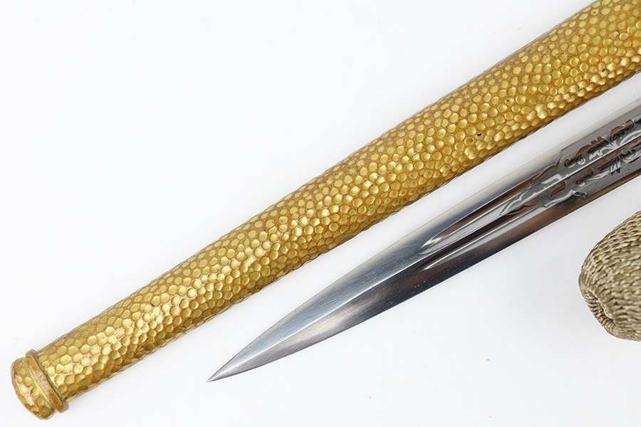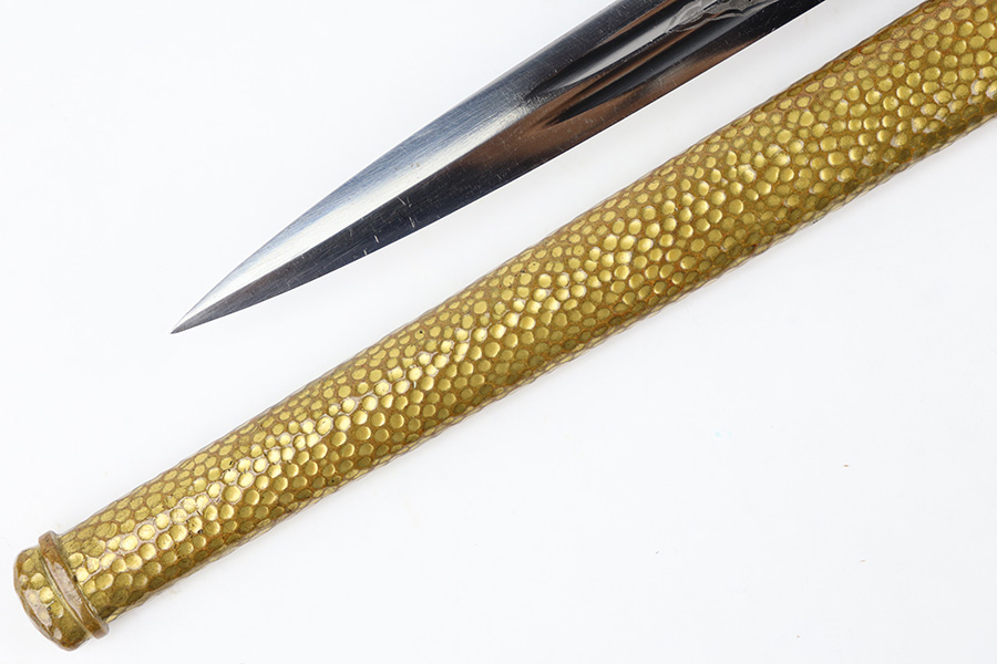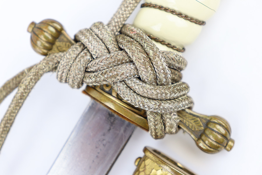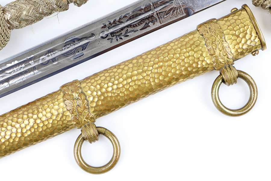 9/6/23 – This is a rare variation 1st model Kriegsmarine dagger with an etched blade, gold-silver colored portepee, and a hammered scabbard. The blade is etched on each side with anchors and floral patterns. Crisp detail and a few small areas of mild discoloration. Double-fullered with no signs of sharpening along the edges. One side of the blade is Eickhorn maker stamped with an oval shape, indicative of 1933-1935 production. The original felt stopper is intact, and the push-button release is functional. The hand guard and pommel have mild surface patina and handling wear. The beige handle has a tightly wrapped chord, but there are a few hairline cracks in the grip. The portepee is in great overall condition with a few small areas of fraying and rub wear on the chord, and a tight knot. Correct gold-silver colored for Kriegsmarine officers. The hammered scabbard is rare and in excellent overall condition.