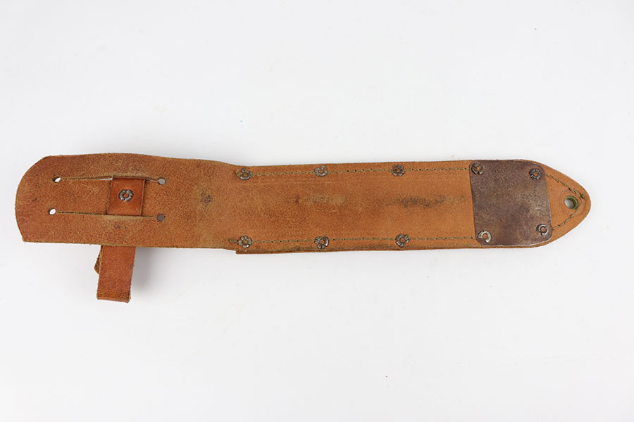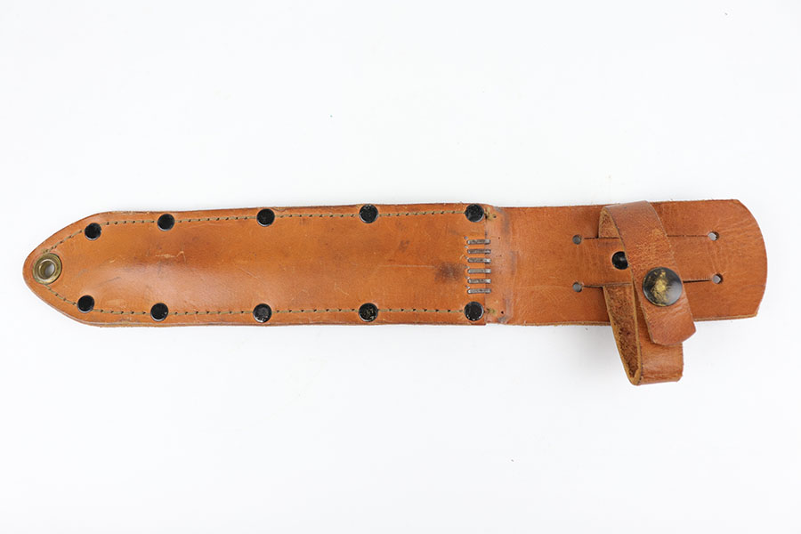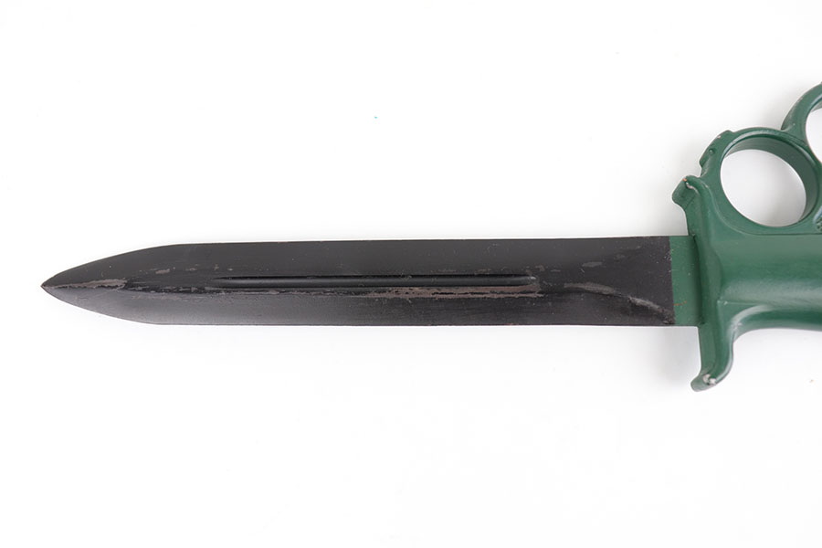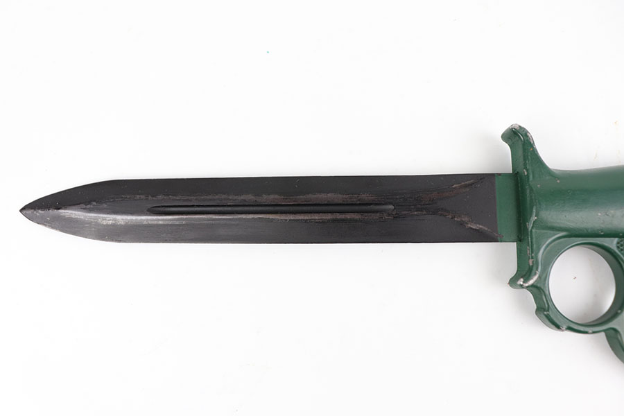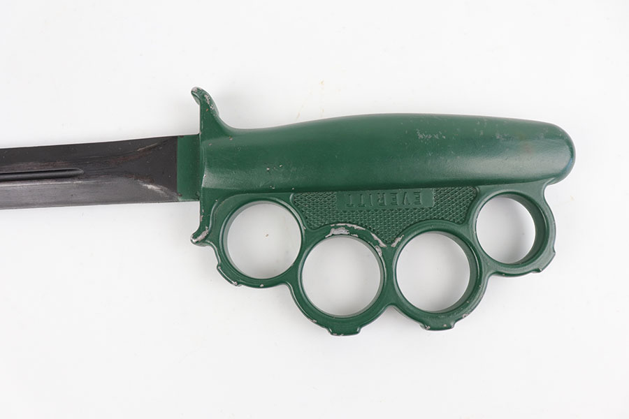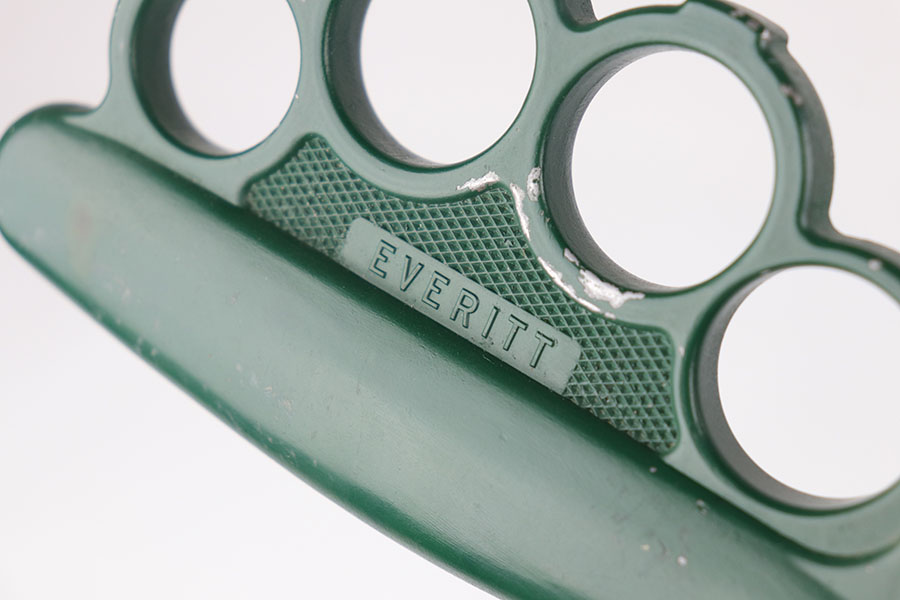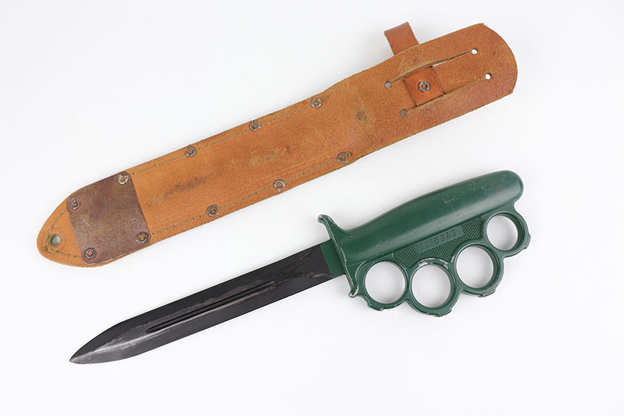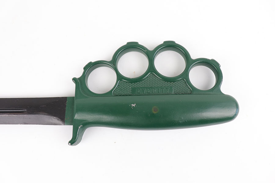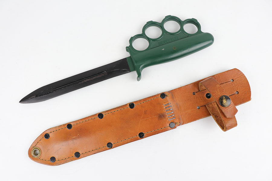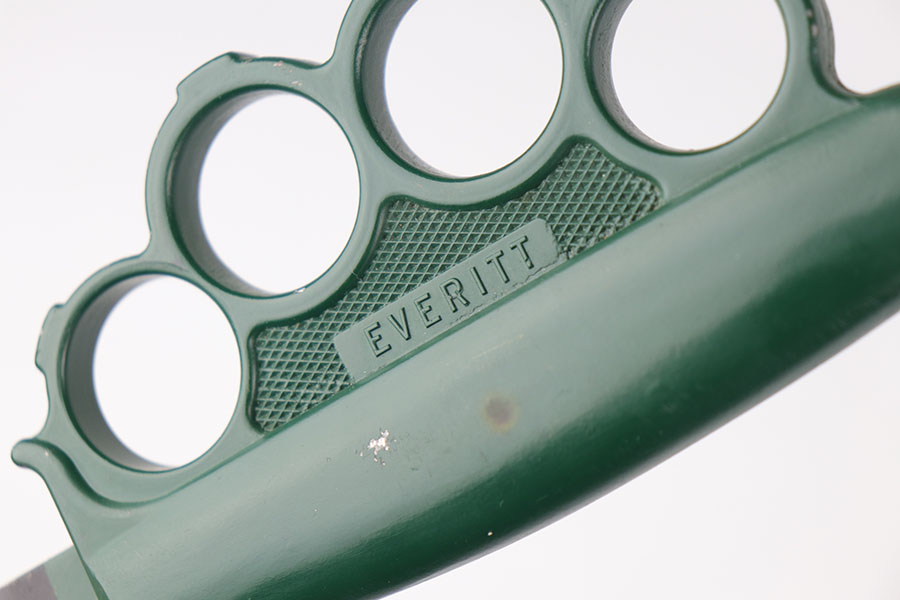 6/24/20 – This is a rare and especially nice example of the Everitt Knuckle knife & sheath from the World War II era. It is believed these knives were used by US soldiers during WWII as a trench knife in the Pacific theater, but this isn’t confirmed. The handles were finished with either black or green enamel paint, and this one is obviously green. The blades were painted black. This example is nearly as nice as you’ll find them, with just a bit of finish loss on the blade and bits of edge wear on the handle. Original sheath is in fantastic condition and unmarked.
