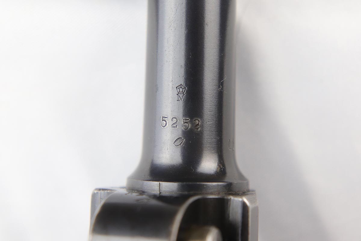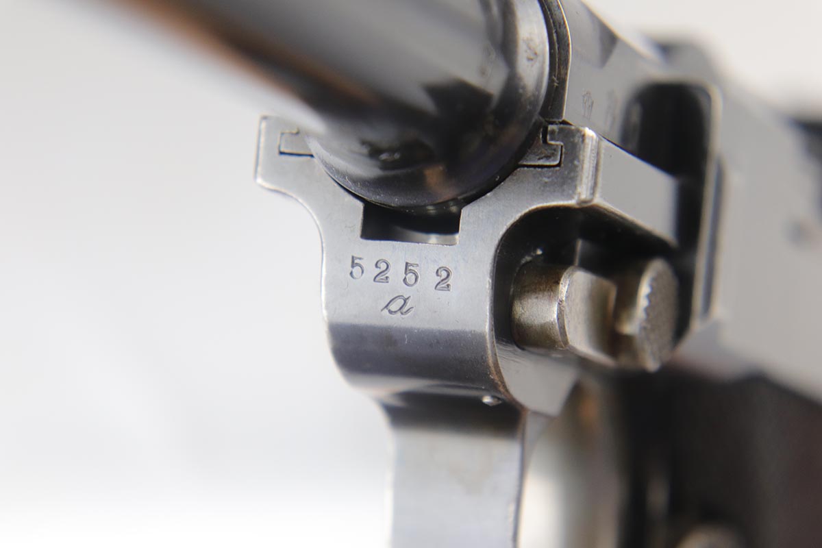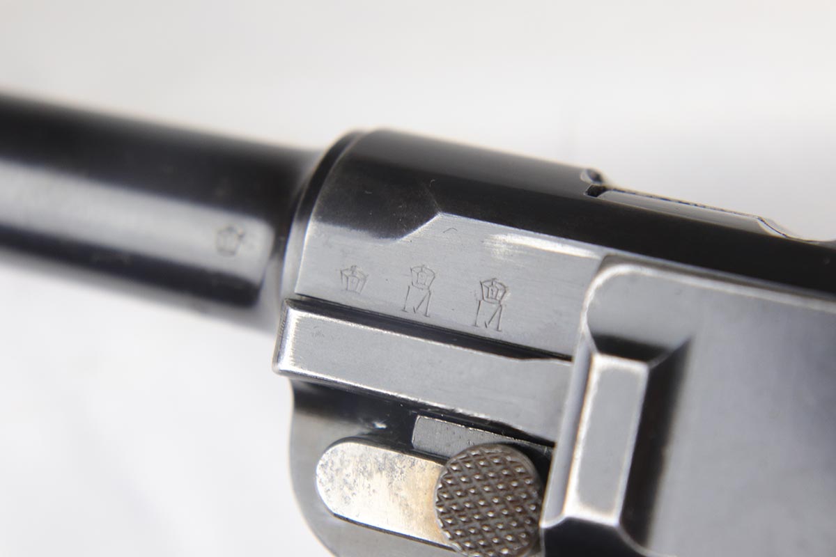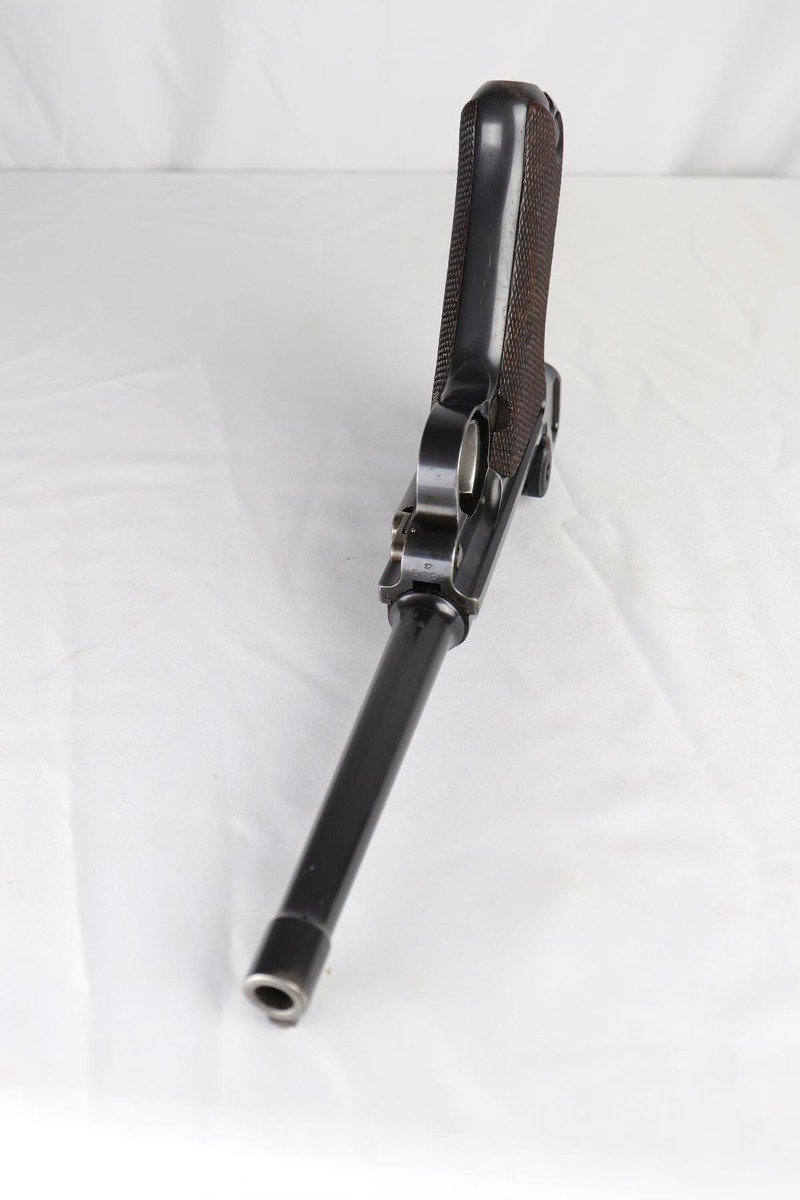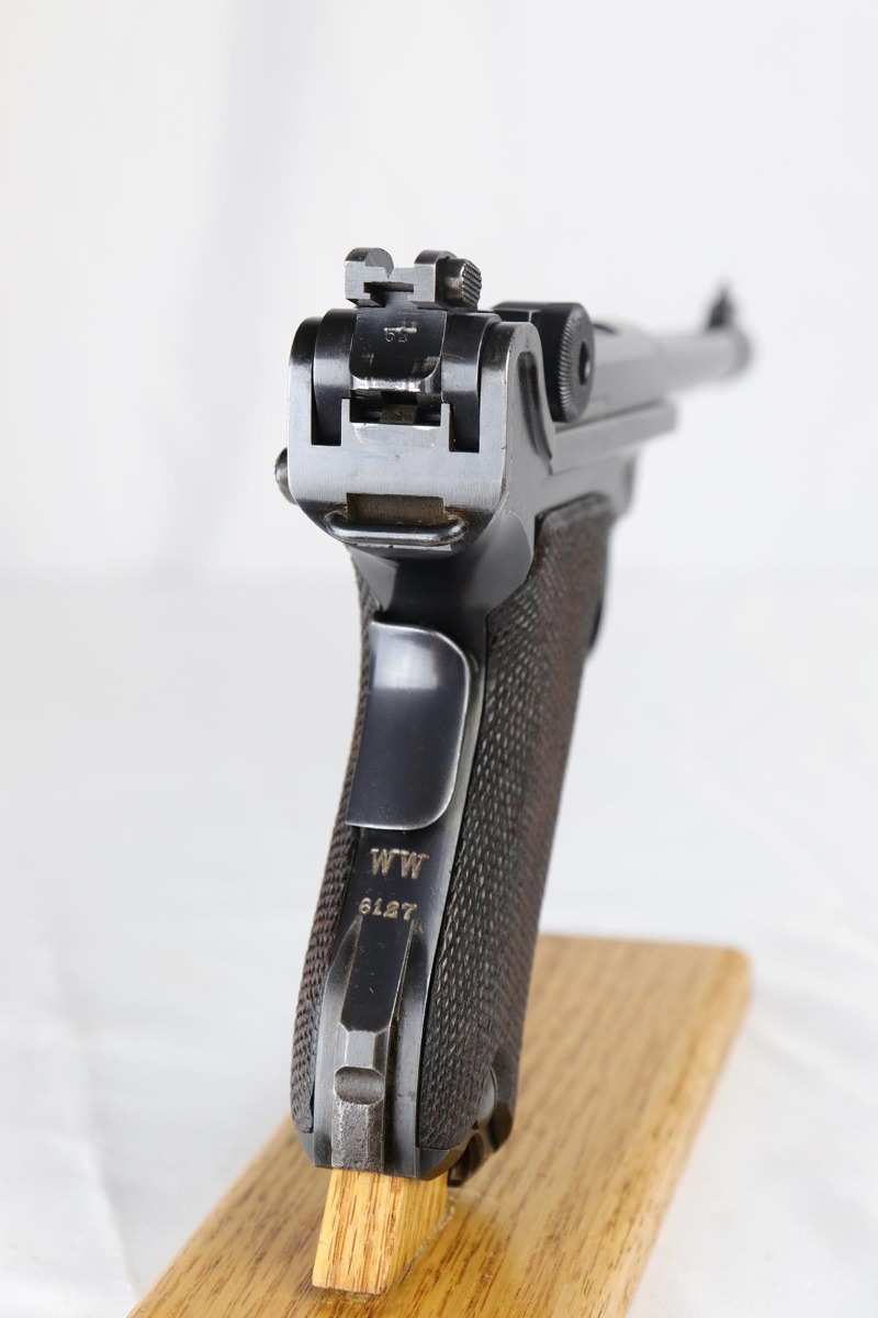 5/1/18 – This is an excellent example of a rare 1906 DWM Navy Luger. It has a nice high polish finish covering about 96% of the gun, with the straps being particularly nice. There is some tiny pin pricking around the Naval Property mark and on the lug stock. Fairly common and somewhat expected in an all original Navy gun due to a salt mist environment. The numbers on this gun are ALL matching with the exception of the correct Navy Magazine. The safety position is altered (2nd variation) so that the “Gesichert” is in the upper position. It is also WW 6127 property marked signifying that it was issued to the Wilhelmshaven Navy Base in the pre-WW1 to WW1 time period. The finish and all parts are original and authentic. It has some oxidation on the bluing and straw parts but better than most Navy lugers offered as it is over 100 years old!. Bore has strong rifling and shows minor use.