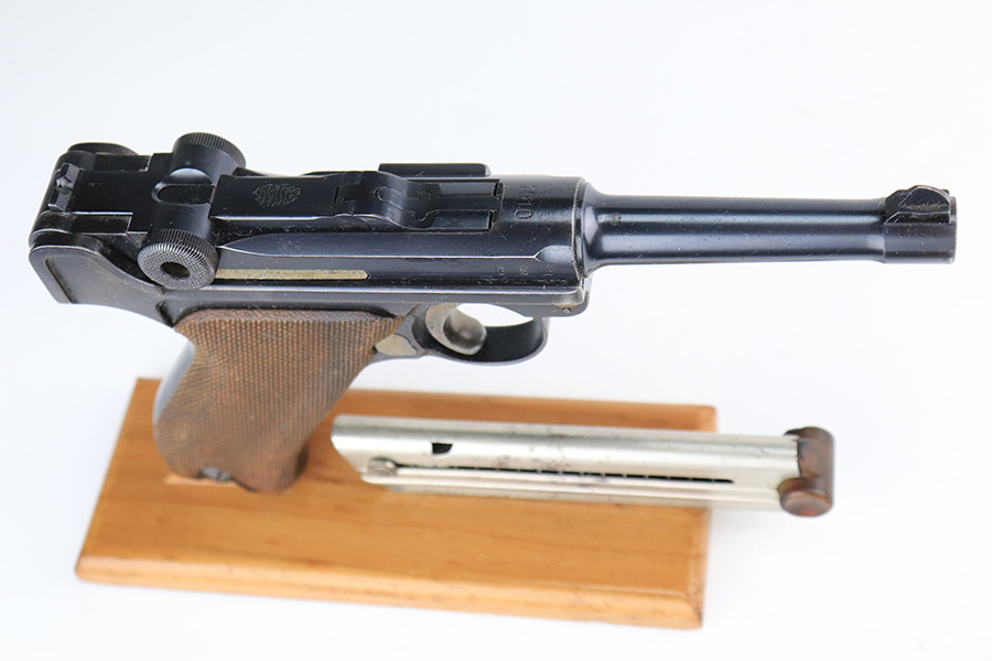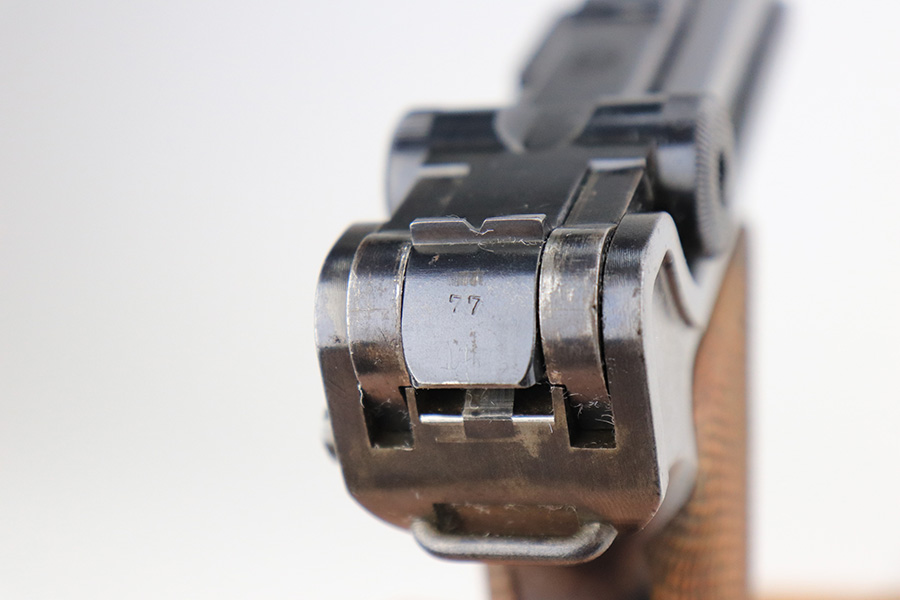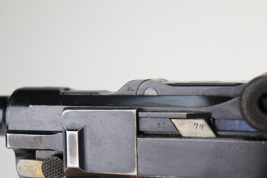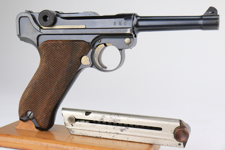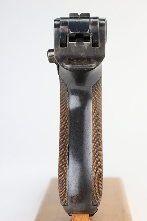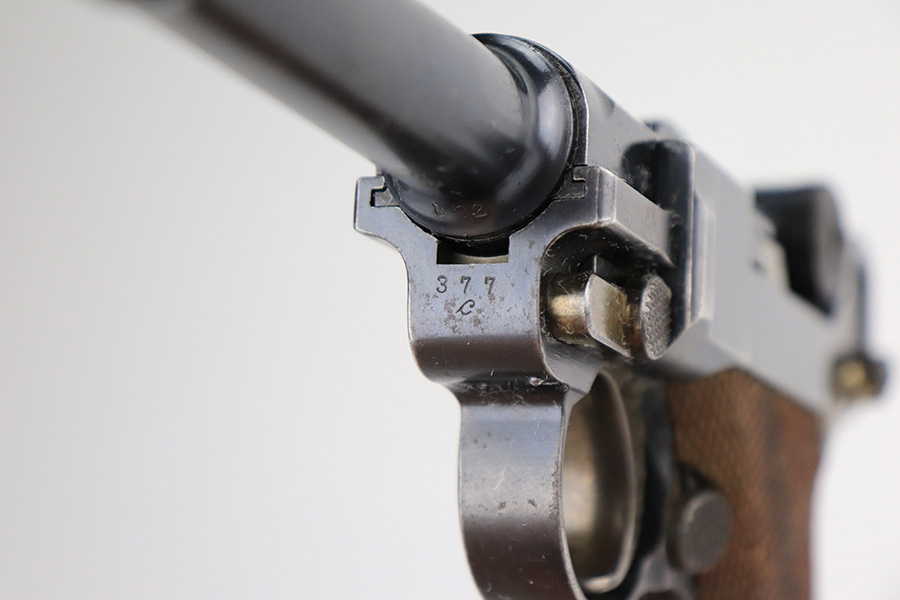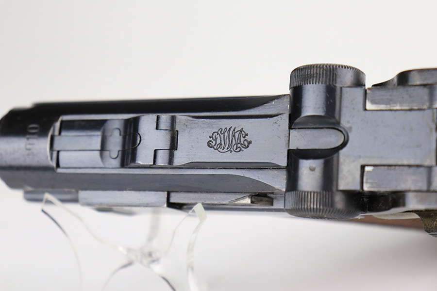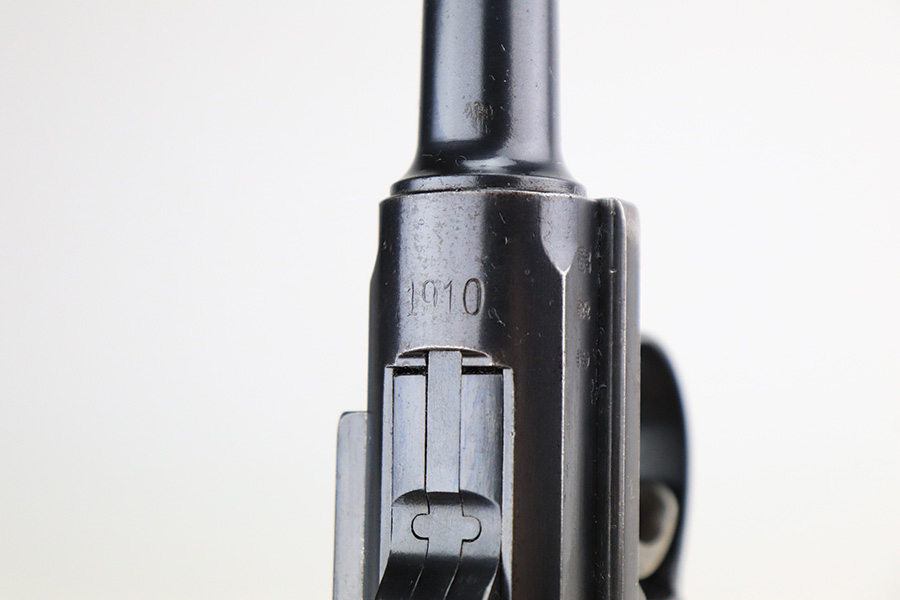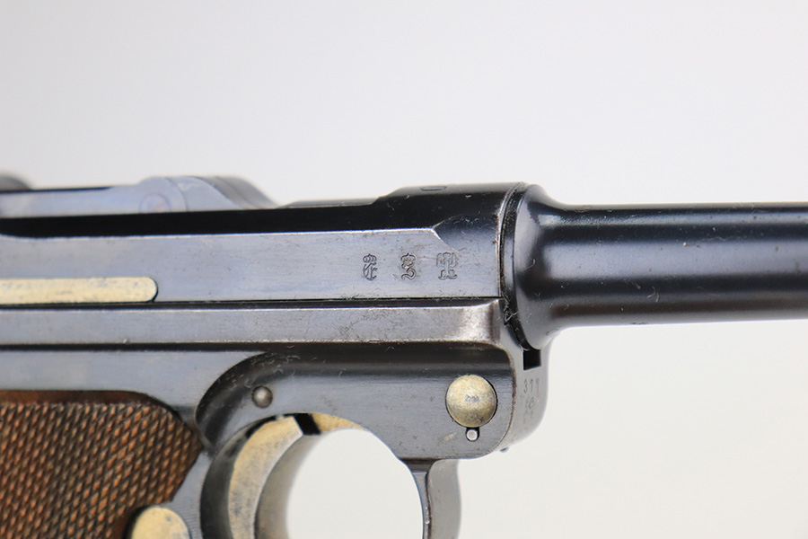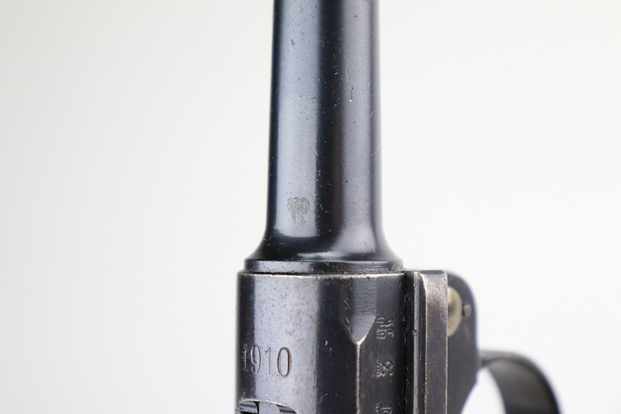 3/28/23 – This is an excellent example of a rare DWM Luger issued to the Imperial German Army in 1910. The gun is all matching and has the proper Imperial proofs. It also has an Imperial German military regiment marking on the front strap. It has no stock lug and no hold-open, both correct for a gun this early. It has retained about 96% of its original bluing with hints of wear on the side plate, side rails, front strap, and around the muzzle. Tiny dots of oxidation on both straps and underside of the frame. Comes with excellent matching grips and a mismatched period-correct magazine. The bore has good rifling with pin-pricking throughout.