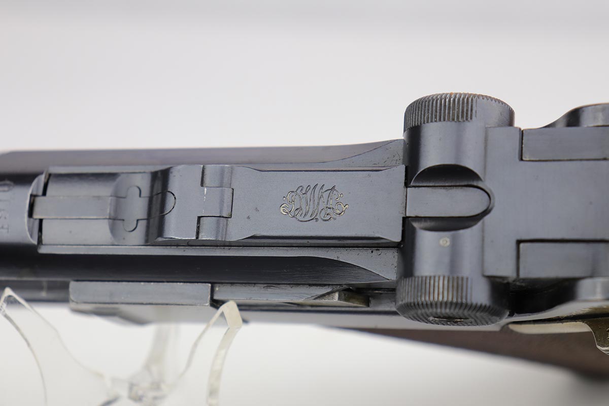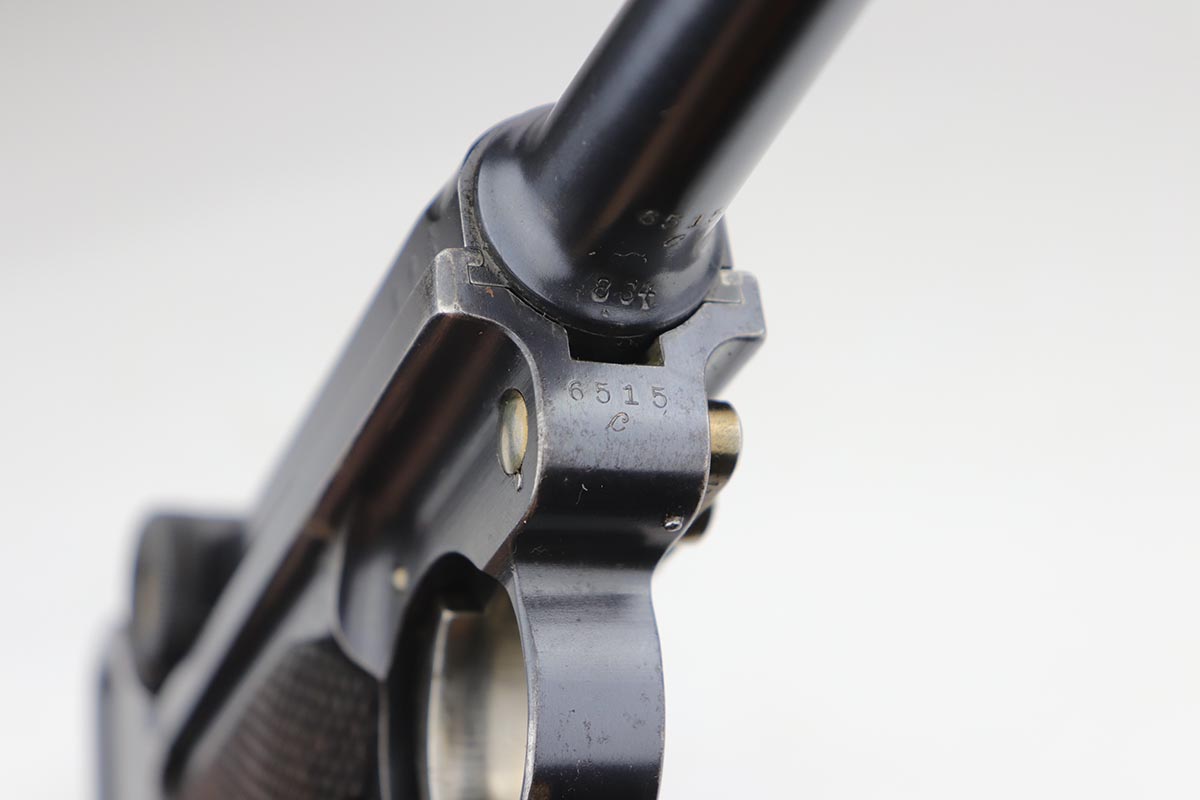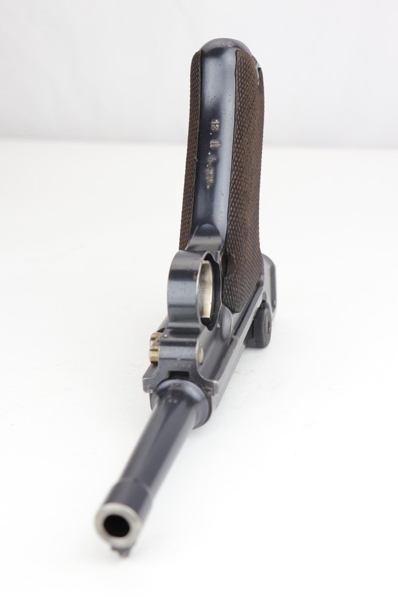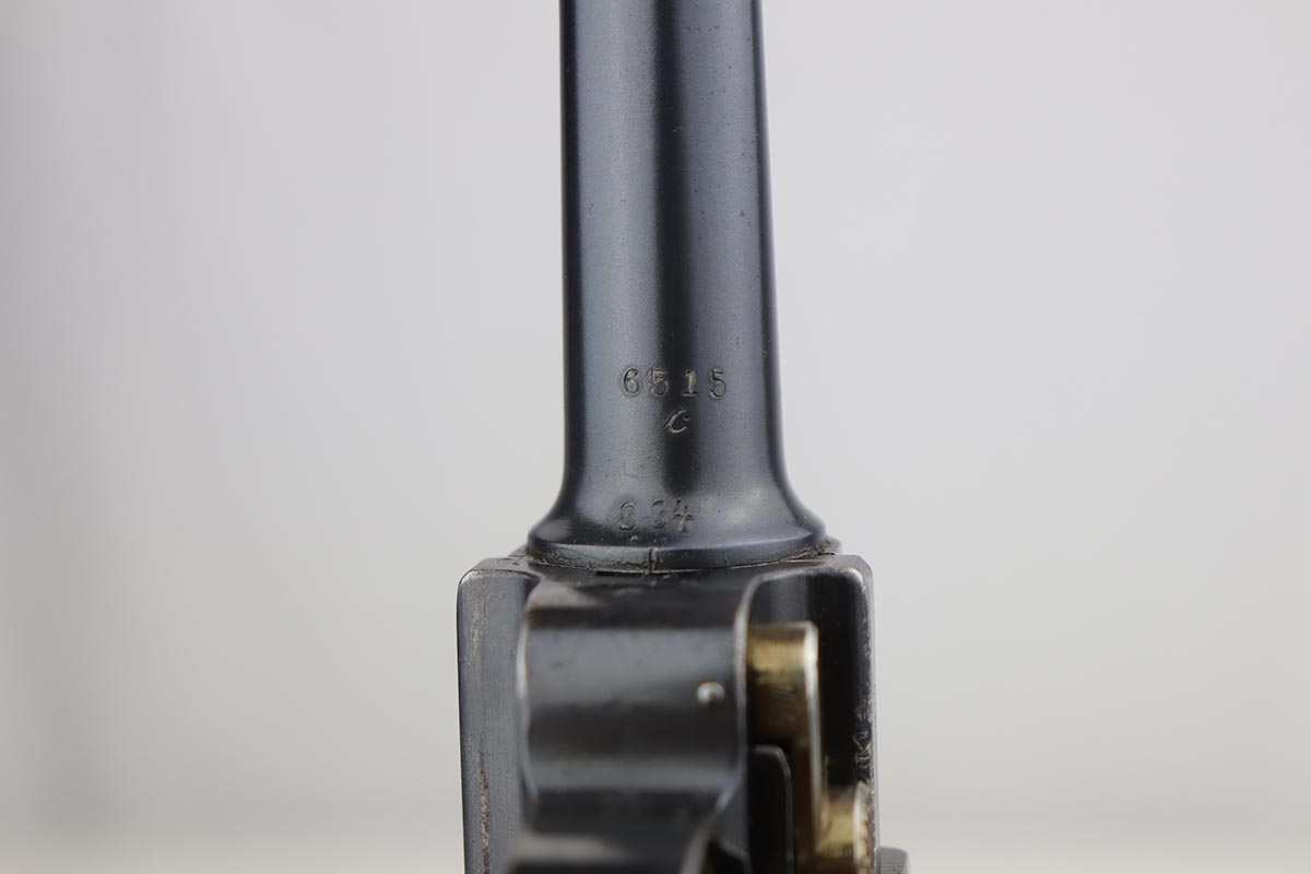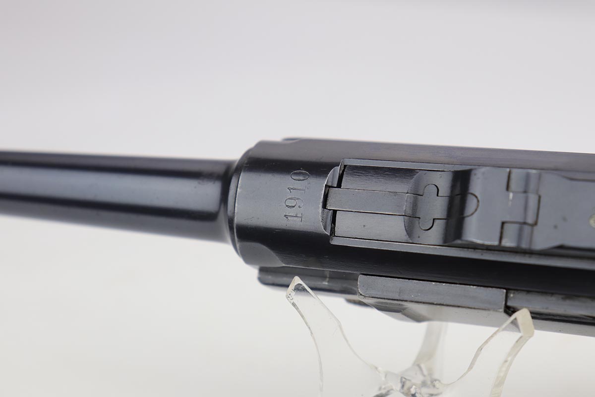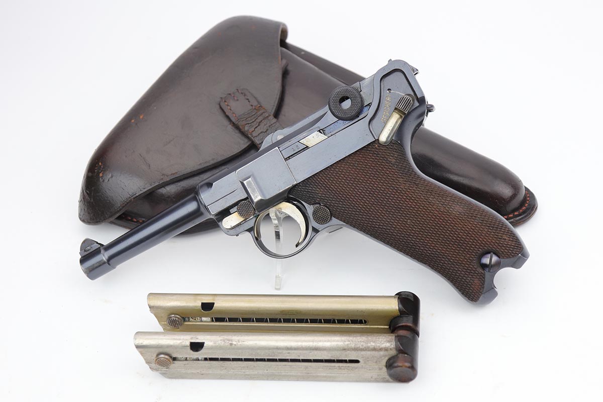9/18/19 – This is a terrifc example of an early DWM Luger rig from 1910. It has both original, matching magazines and Becker & Co. holster. This pistol exhibits several features that are unique to early DWM Lugers, such as the magazines being numbered vertically. This example was also retrofitted for the hold-open at the Erfurt factory by a 1913 directive, and bears a small inspection stamp where the work was done. There were only 20,000 DWM Lugers produced that year, and this is one of the ~20% that were unit marked, with the front strap reading ’12.H.4.22′. This pistol is all matching with about 96-97% blue remaining, with standard holster wear on the high edges and a spot of finish loss on the bottom of the front strap. The original straw rates at about 60%. Both matching magazines are present, and the grips are matching, as well. Bore has some frost throughout but is in good shape and has no corrosion. The holster is dated 1910 and is Berlin marked and in great shape, with only minor cracking on the top flap. This is a rare find that we almost never come across, especially in this condition.