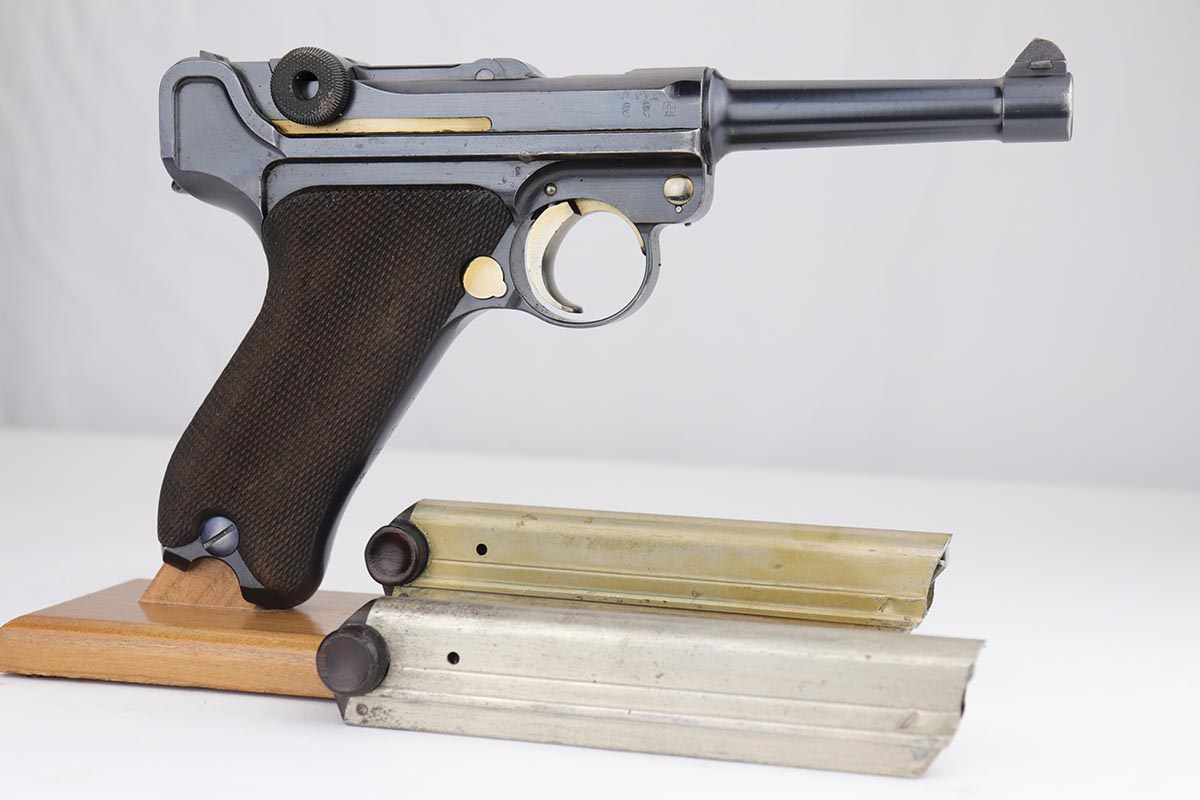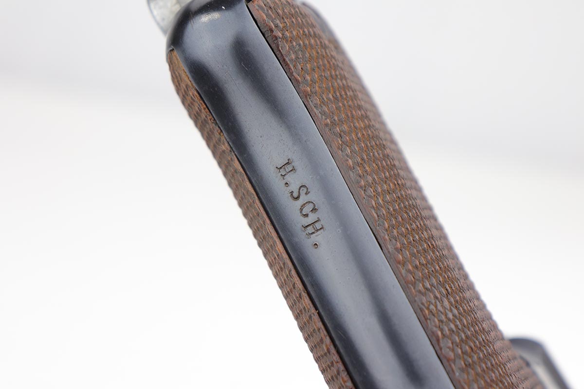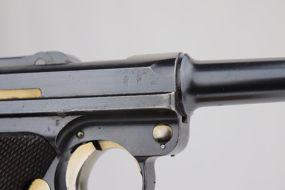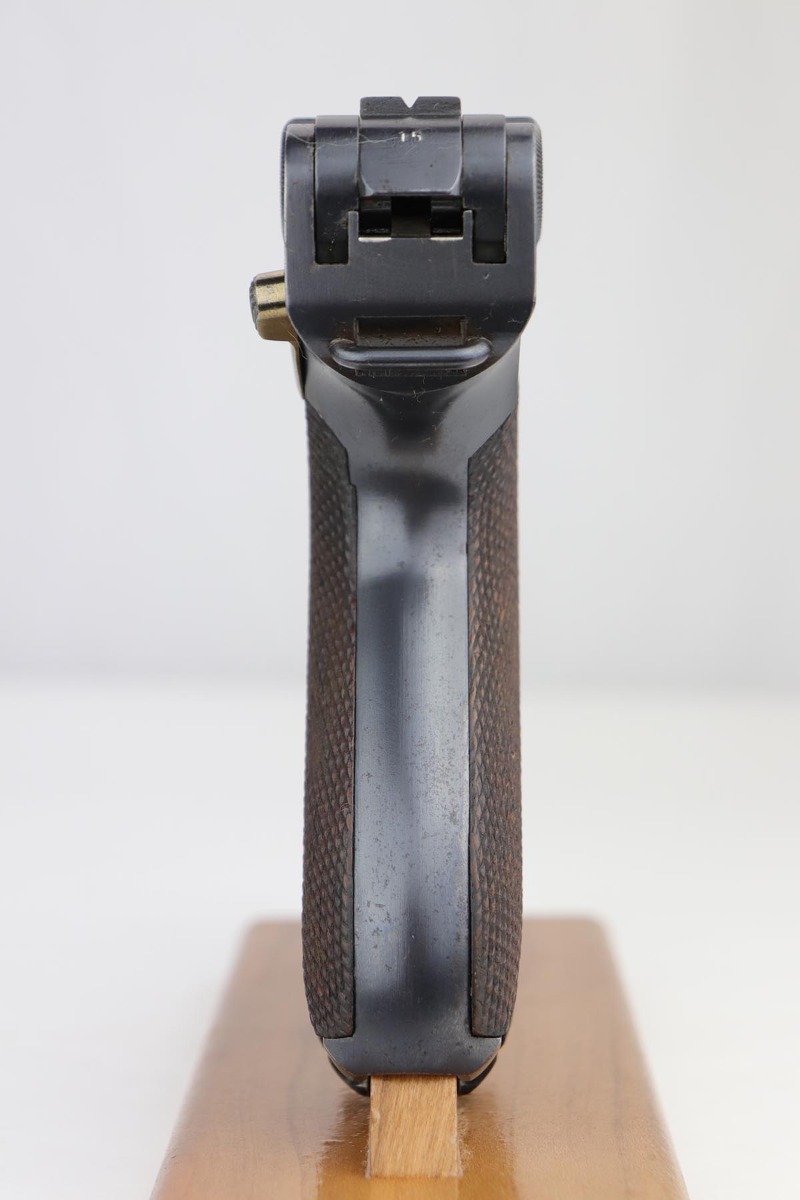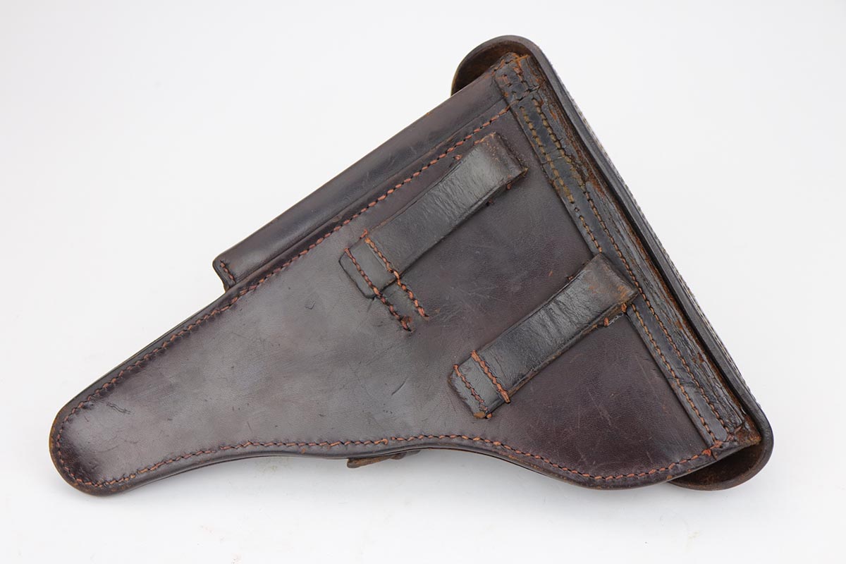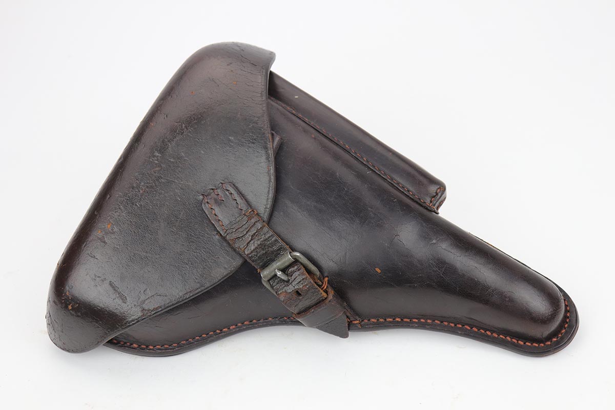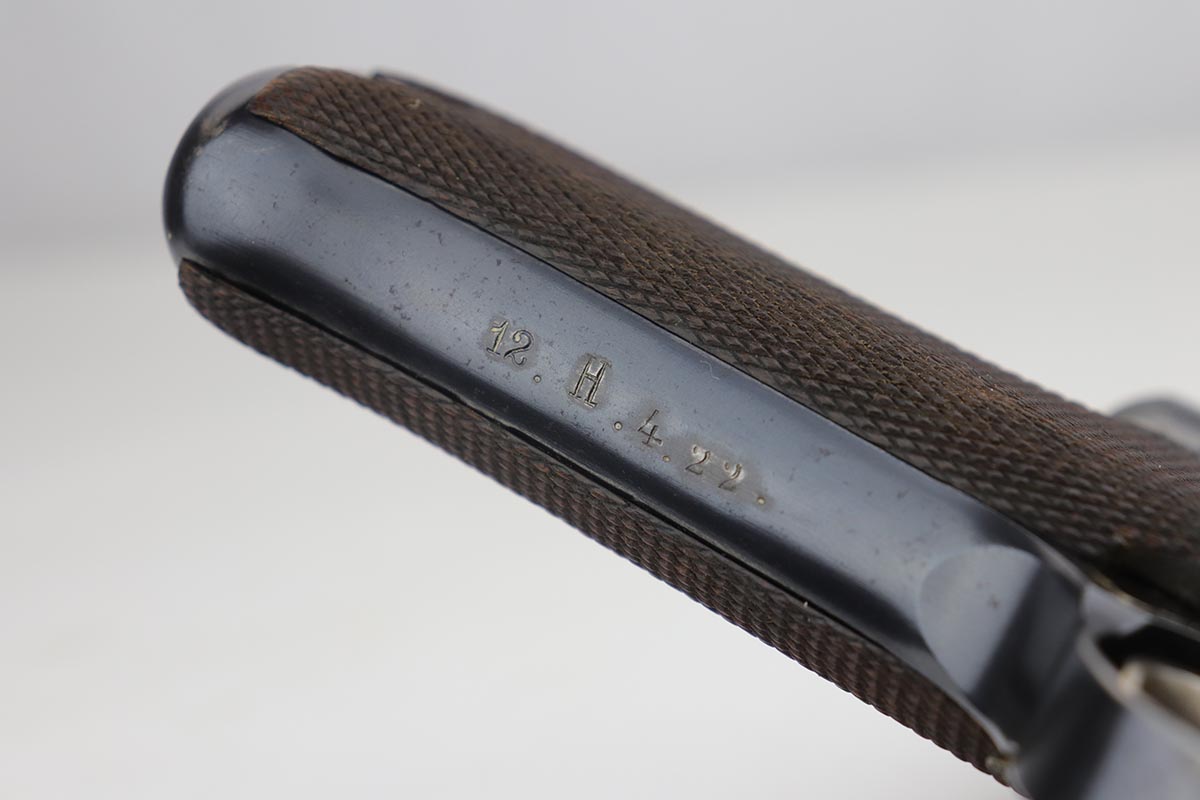9/18/19 – This is a terrifc example of an early DWM Luger rig from 1910. It has both original, matching magazines and Becker & Co. holster. This pistol exhibits several features that are unique to early DWM Lugers, such as the magazines being numbered vertically. This example was also retrofitted for the hold-open at the Erfurt factory by a 1913 directive, and bears a small inspection stamp where the work was done. There were only 20,000 DWM Lugers produced that year, and this is one of the ~20% that were unit marked, with the front strap reading ’12.H.4.22′. This pistol is all matching with about 96-97% blue remaining, with standard holster wear on the high edges and a spot of finish loss on the bottom of the front strap. The original straw rates at about 60%. Both matching magazines are present, and the grips are matching, as well. Bore has some frost throughout but is in good shape and has no corrosion. The holster is dated 1910 and is Berlin marked and in great shape, with only minor cracking on the top flap. This is a rare find that we almost never come across, especially in this condition.
