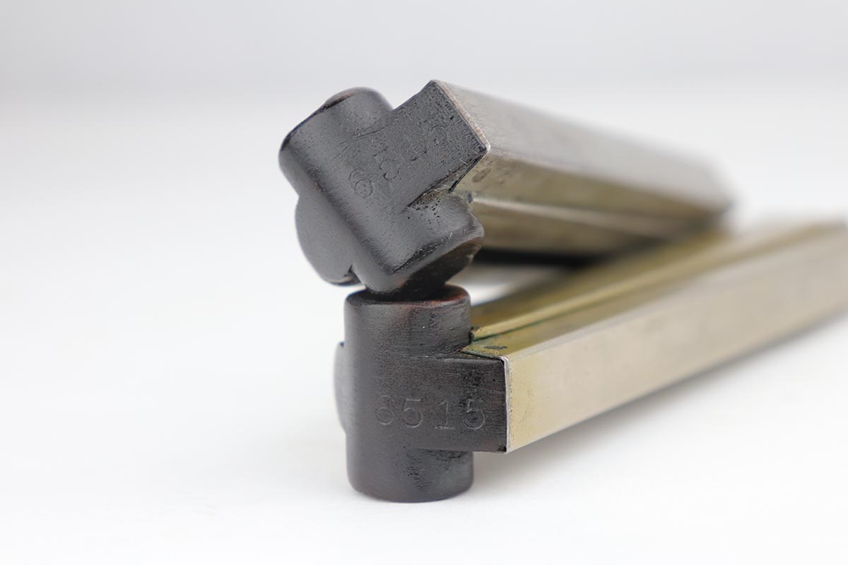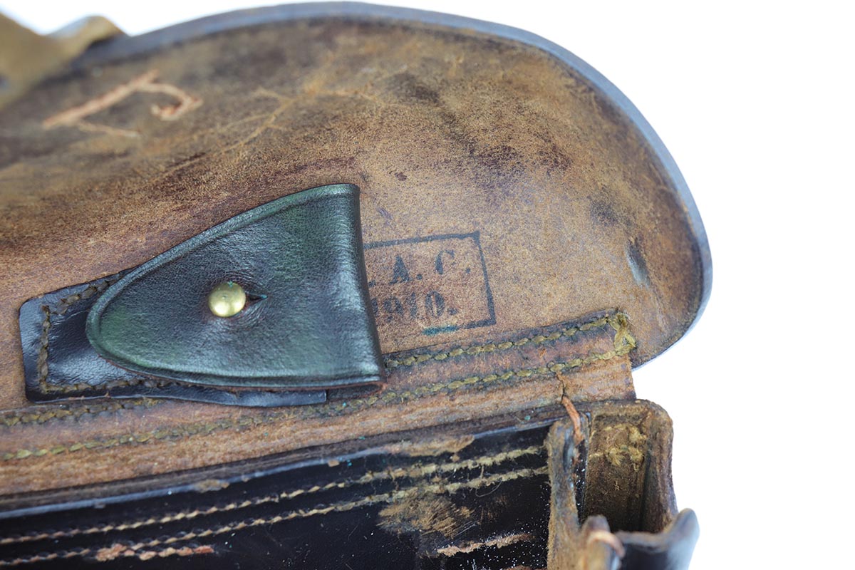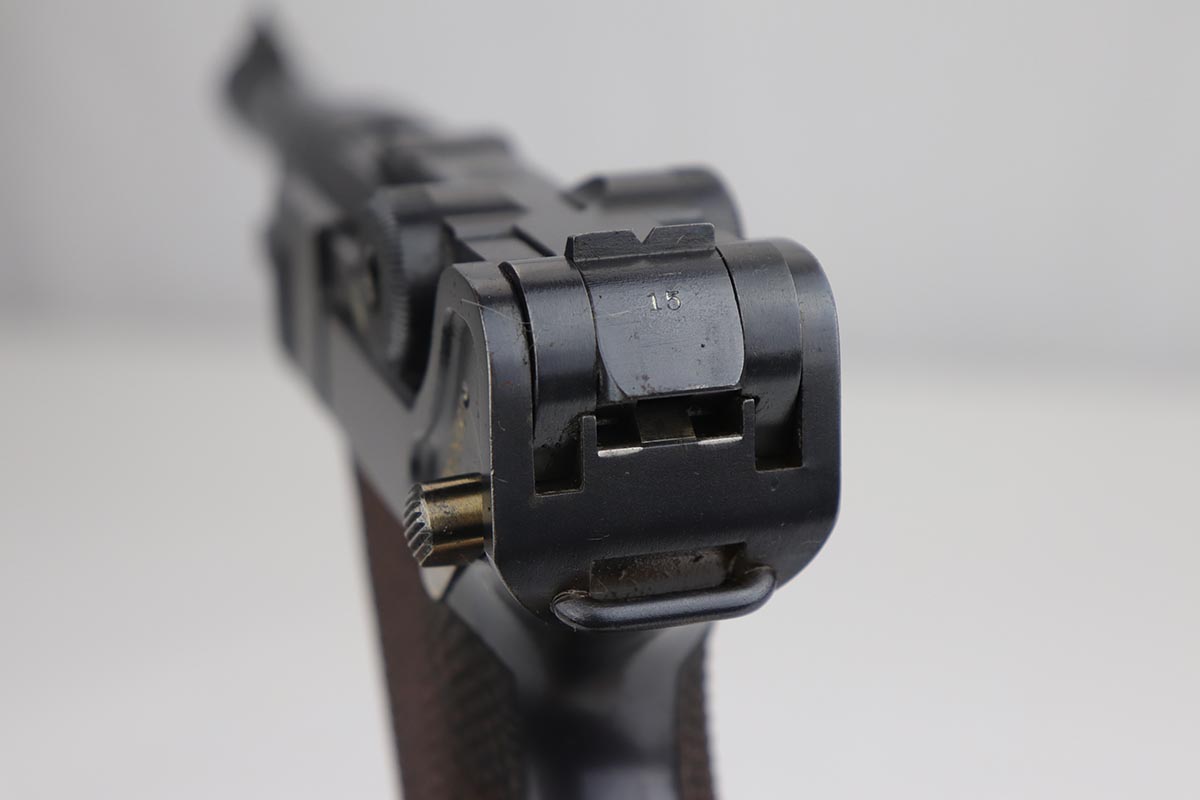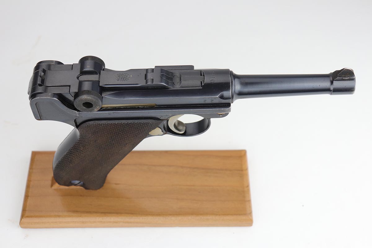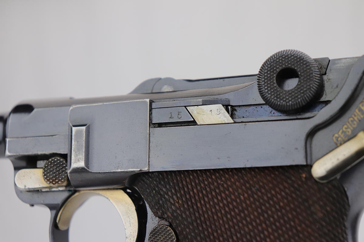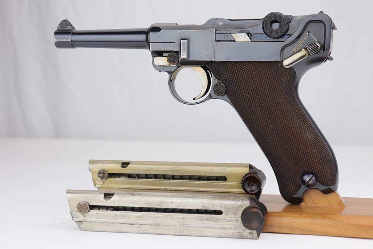 9/18/19 – This is a terrifc example of an early DWM Luger rig from 1910. It has both original, matching magazines and Becker & Co. holster. This pistol exhibits several features that are unique to early DWM Lugers, such as the magazines being numbered vertically. This example was also retrofitted for the hold-open at the Erfurt factory by a 1913 directive, and bears a small inspection stamp where the work was done. There were only 20,000 DWM Lugers produced that year, and this is one of the ~20% that were unit marked, with the front strap reading ’12.H.4.22′. This pistol is all matching with about 96-97% blue remaining, with standard holster wear on the high edges and a spot of finish loss on the bottom of the front strap. The original straw rates at about 60%. Both matching magazines are present, and the grips are matching, as well. Bore has some frost throughout but is in good shape and has no corrosion. The holster is dated 1910 and is Berlin marked and in great shape, with only minor cracking on the top flap. This is a rare find that we almost never come across, especially in this condition.