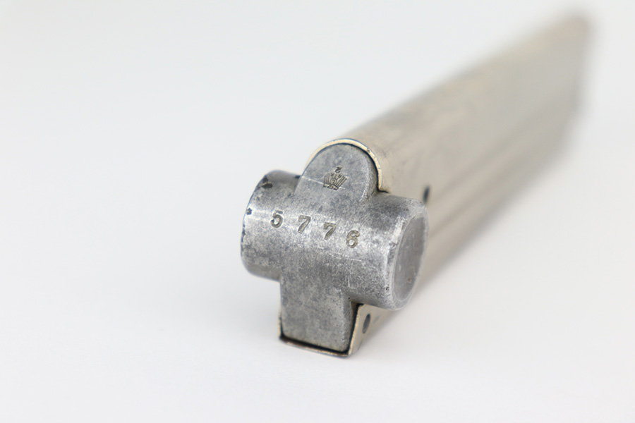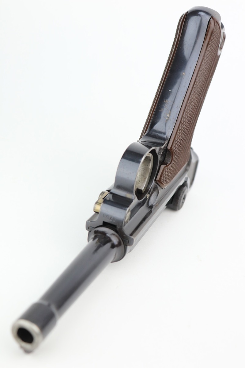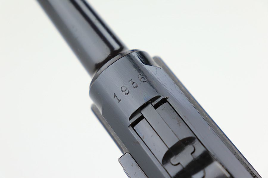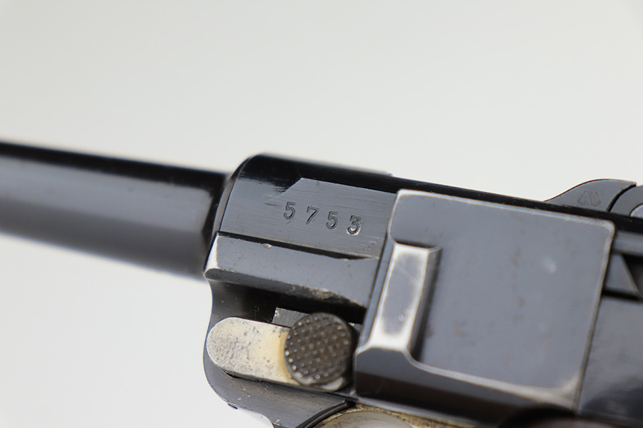 3/31/23 – This is a rare and highly desirable 1936 Krieghoff Luger – one of only ~2500 produced with 1936 chamber date. All matching with the proper “Eagle L/2” Krieghoff proofs throughout. It has retained about 97% of its original finish with very minor wear around the muzzle and on the side plate. A few tiny handling marks on the front strap. Fitted with excellent period-correct reddish bakelite Krieghoff grips. Comes with an original Krieghoff magazine that is not matching, but very close! Minty, shiny bore with just one small area of very light freckling.