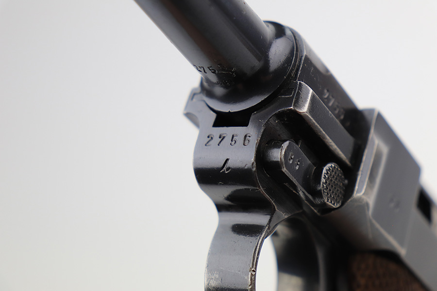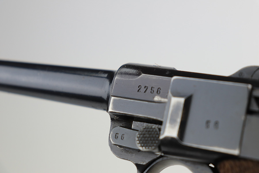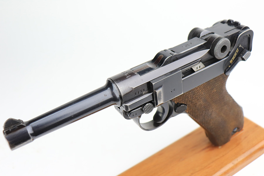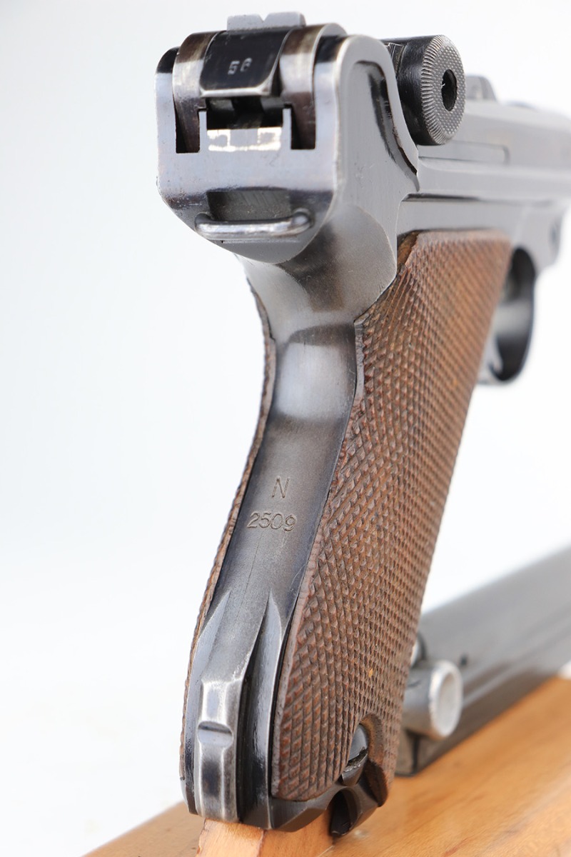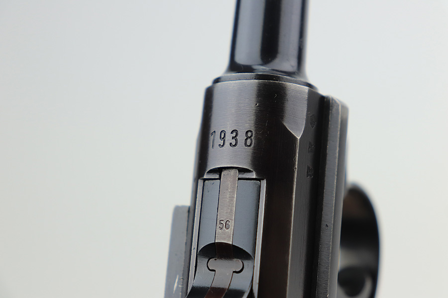 3/11/22 – This is an excellent example of a rare Mauser Luger issued to the Kriegsmarine in 1938. There were only 2,400 Navy Mauser Lugers produced in 1938, and there were only about 6,000 Kriegsmarine Mauser Lugers ever marked as such. This particular gun is all matching, has the proper “Eagle 63” military acceptance proofs, and has an “N 2509” Navy property marking on the back strap. It comes as a rig with a very nice 1938-dated Navy-marked holster and two period-correct Navy-marked magazines that are not matching to the gun. The gun itself has retained about 96% of its original bluing. There are just hints of thinning on both grip straps and areas of very minor wear on the side plate, side rails, and around the muzzle. A few tiny handling marks on the barrel. Comes with excellent matching-numbered wood grips. The bore has strong rifling with areas of minor frosting throughout.