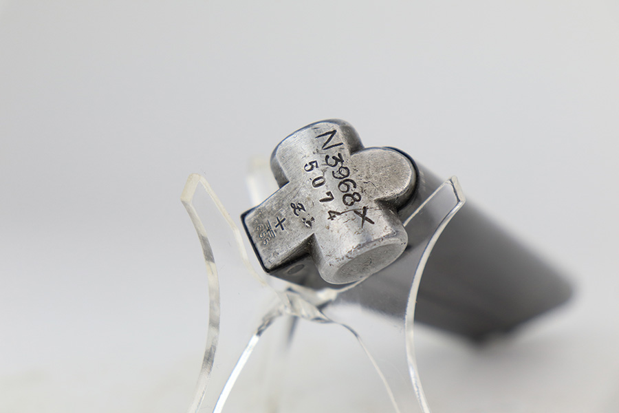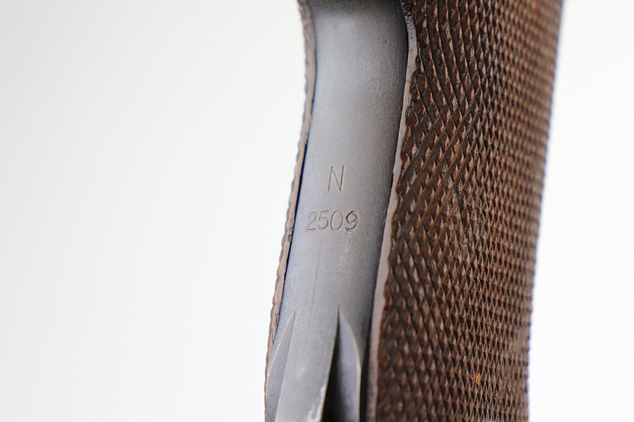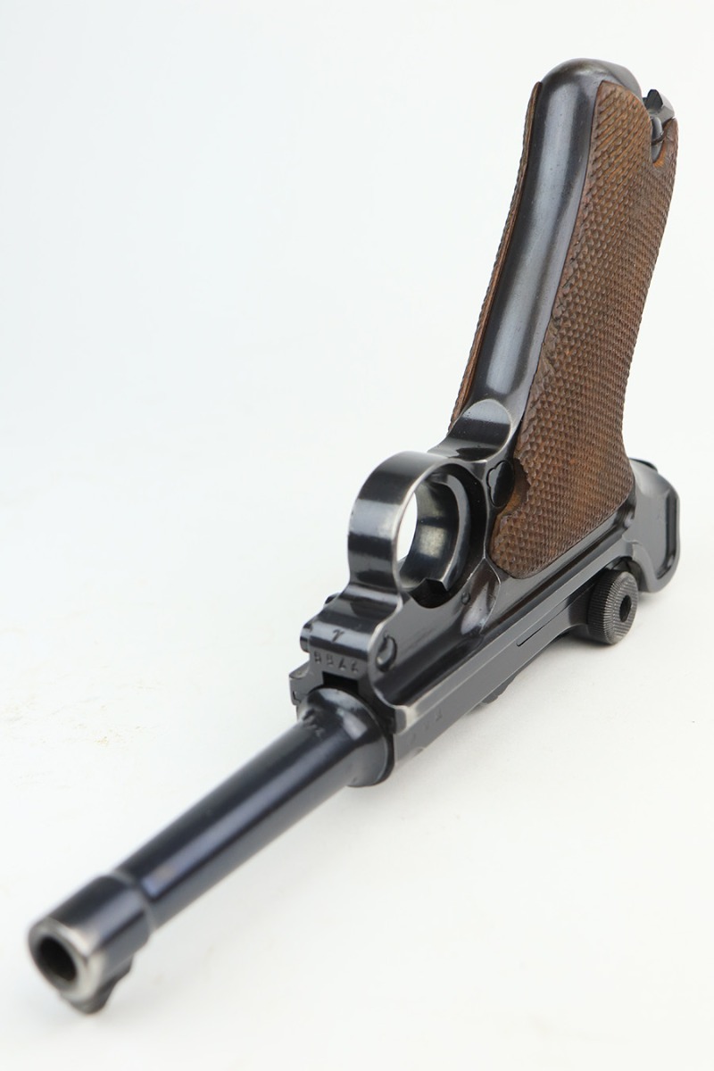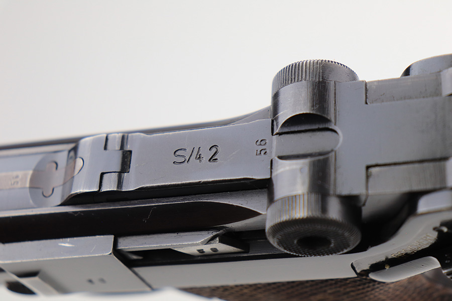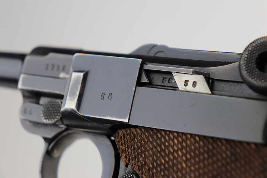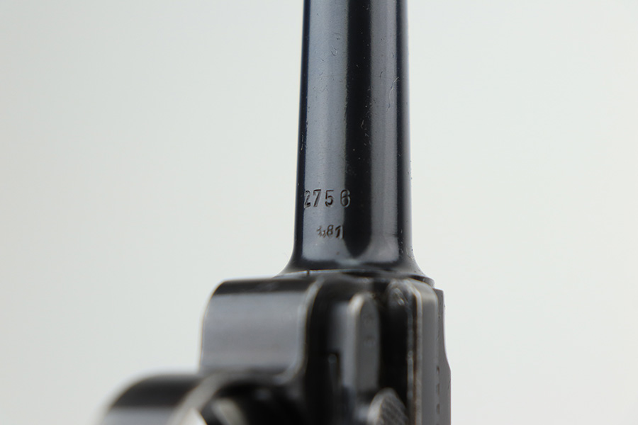 3/11/22 – This is an excellent example of a rare Mauser Luger issued to the Kriegsmarine in 1938. There were only 2,400 Navy Mauser Lugers produced in 1938, and there were only about 6,000 Kriegsmarine Mauser Lugers ever marked as such. This particular gun is all matching, has the proper “Eagle 63” military acceptance proofs, and has an “N 2509” Navy property marking on the back strap. It comes as a rig with a very nice 1938-dated Navy-marked holster and two period-correct Navy-marked magazines that are not matching to the gun. The gun itself has retained about 96% of its original bluing. There are just hints of thinning on both grip straps and areas of very minor wear on the side plate, side rails, and around the muzzle. A few tiny handling marks on the barrel. Comes with excellent matching-numbered wood grips. The bore has strong rifling with areas of minor frosting throughout.