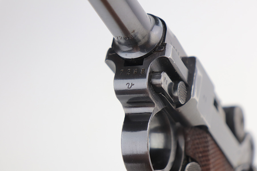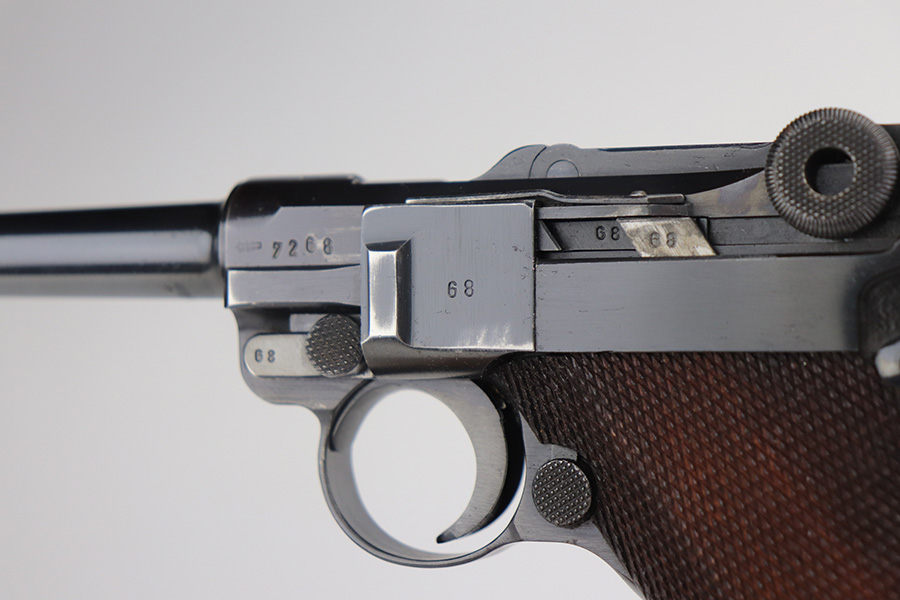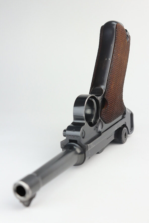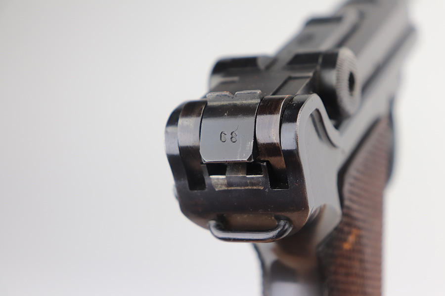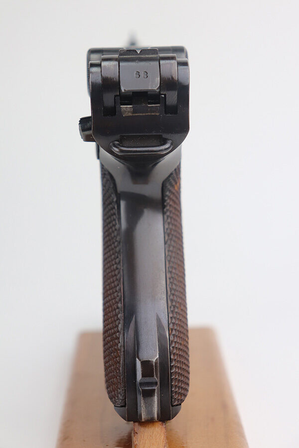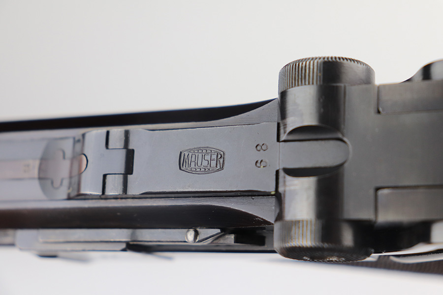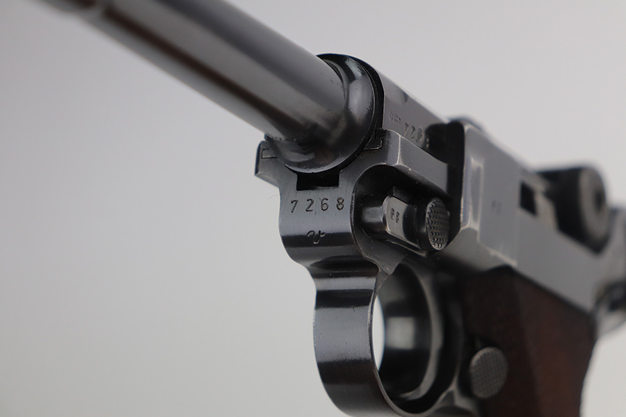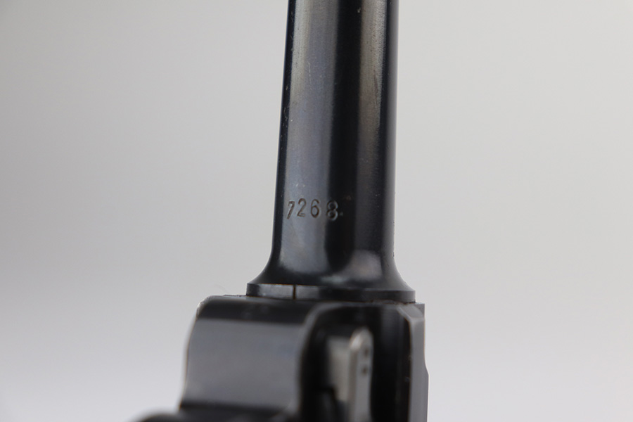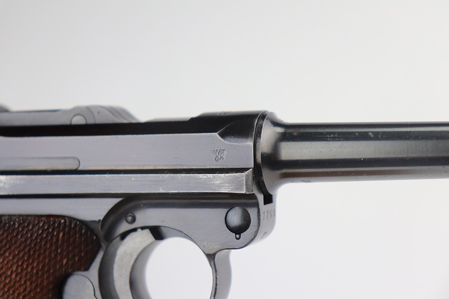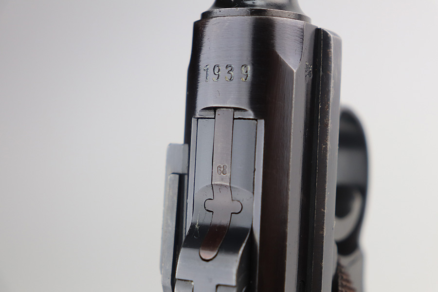 6/17/21 – This is an excellent example of a very rare Mauser Luger issued to the Nazi police force in 1939. It is all matching, has a police sear safety, a Mauser banner logo on the toggle, and a police “Eagle K” marking on the right side of the slide. There were only ~1,125 of this variation produced. This is the first (earliest) variation of the Mauser police luger for WW2. It has retained about 97% of its original finish. There is very minor wear on the side plate, side rails, and around the muzzle. A few very light handling marks on the barrel and front strap. Very tiny freckling on the straps. Comes with excellent matching grips and a mismatched period-correct police-marked magazine. Mint bore.
