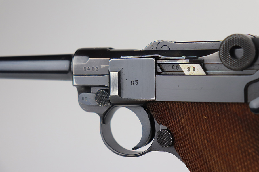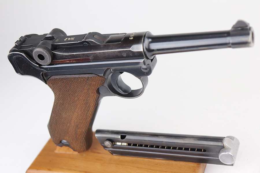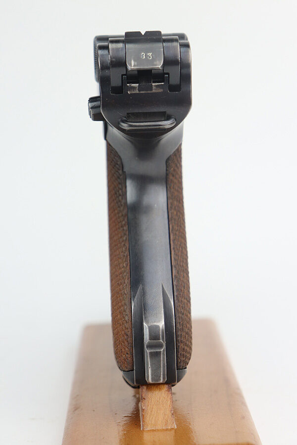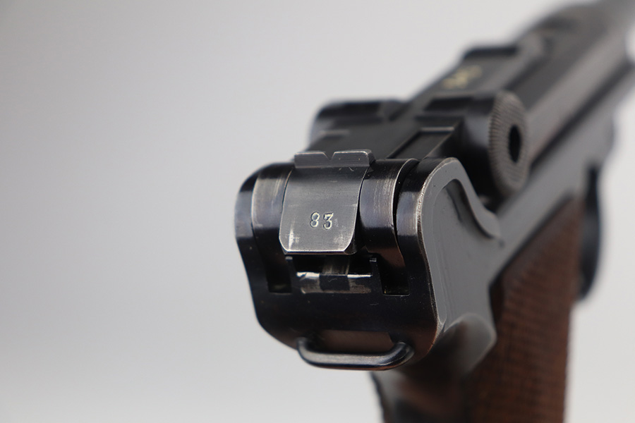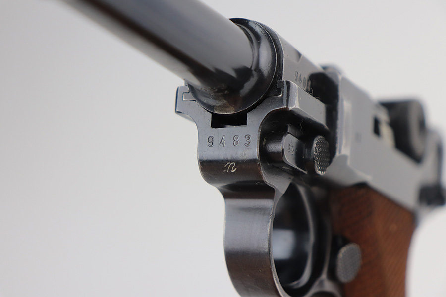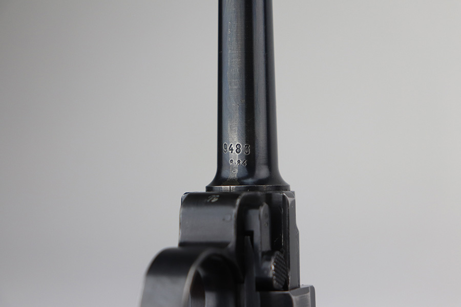 6/21/21 – This is an excellent example of a rare Mauser Luger that was initially issued to the Nazi military and then diverted to the police force. The gun is all matching, has “Eagle 63” military proofs, and an added police sear safety. The rig comes with an excellent police holster and two matching magazines. The magazines are “Eagle 63” marked. The gun has retained about 94-95% of its original finish. There is minor wear on the side plate, side rails, and around the muzzle. Minor thinning on the chamber and right side of the slide. Excellent matching grips. Excellent bore – shiny with strong rifling.