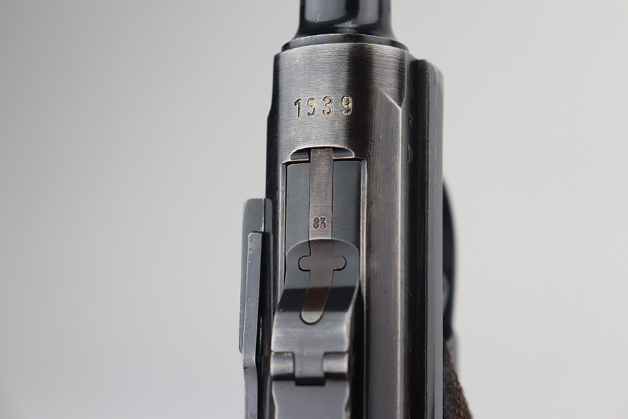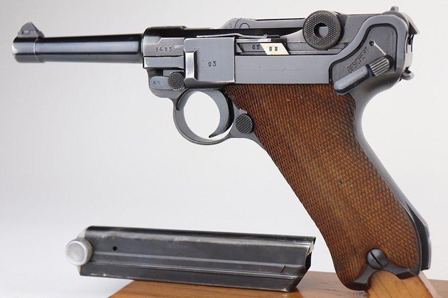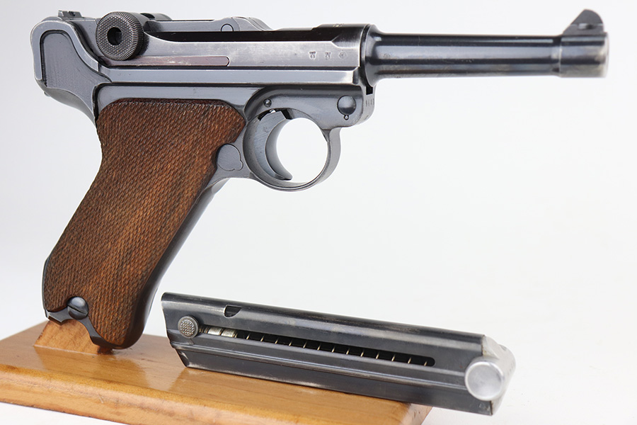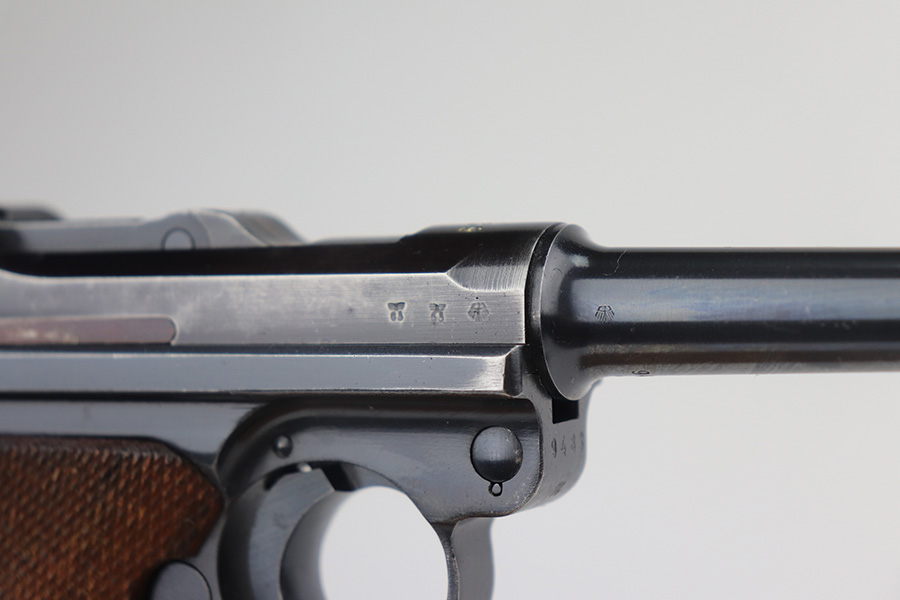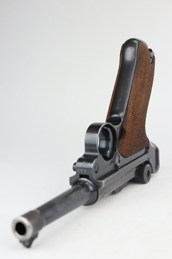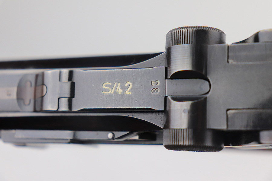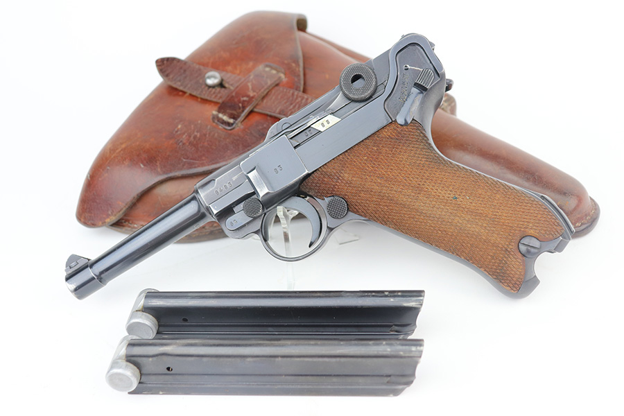 6/21/21 – This is an excellent example of a rare Mauser Luger that was initially issued to the Nazi military and then diverted to the police force. The gun is all matching, has “Eagle 63” military proofs, and an added police sear safety. The rig comes with an excellent police holster and two matching magazines. The magazines are “Eagle 63” marked. The gun has retained about 94-95% of its original finish. There is minor wear on the side plate, side rails, and around the muzzle. Minor thinning on the chamber and right side of the slide. Excellent matching grips. Excellent bore – shiny with strong rifling.