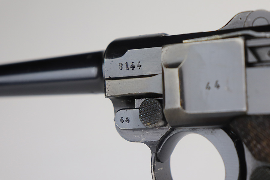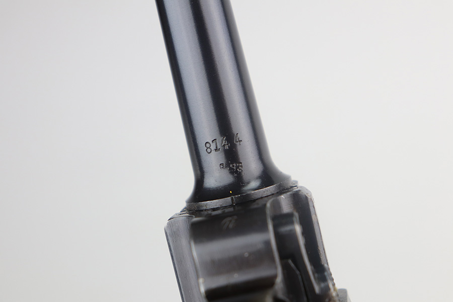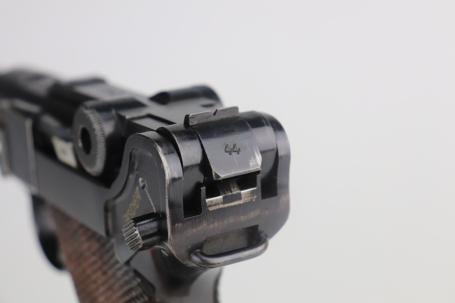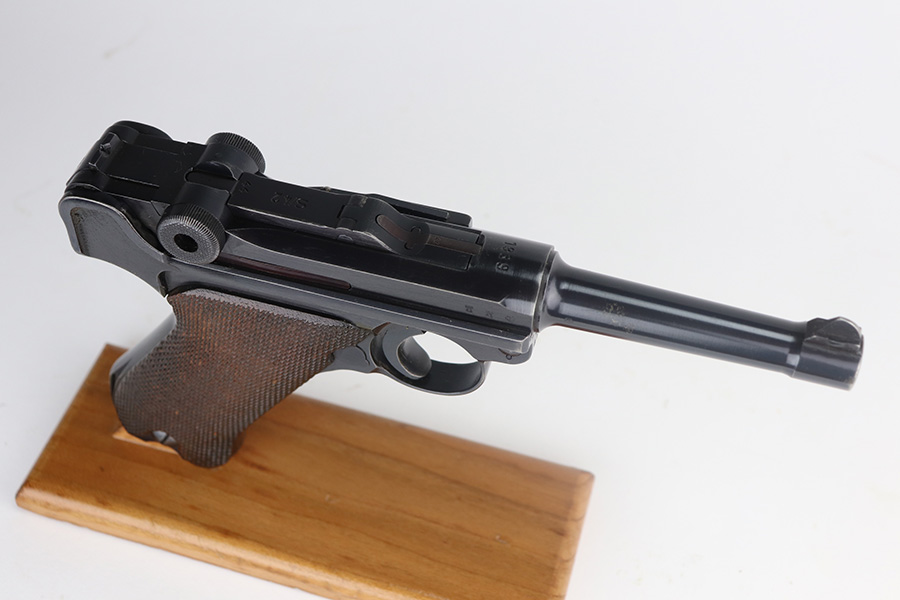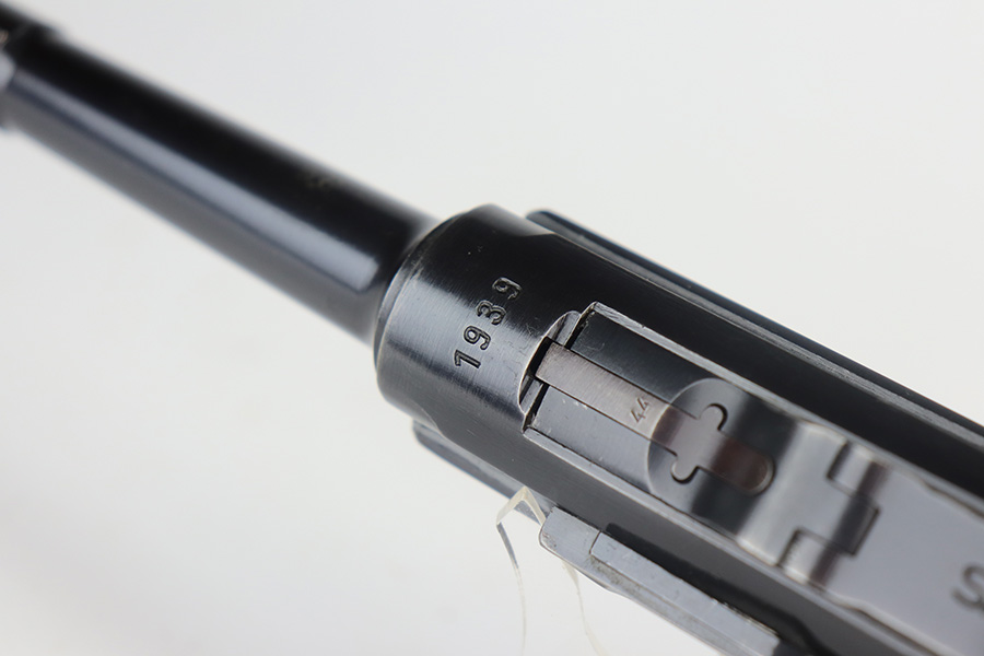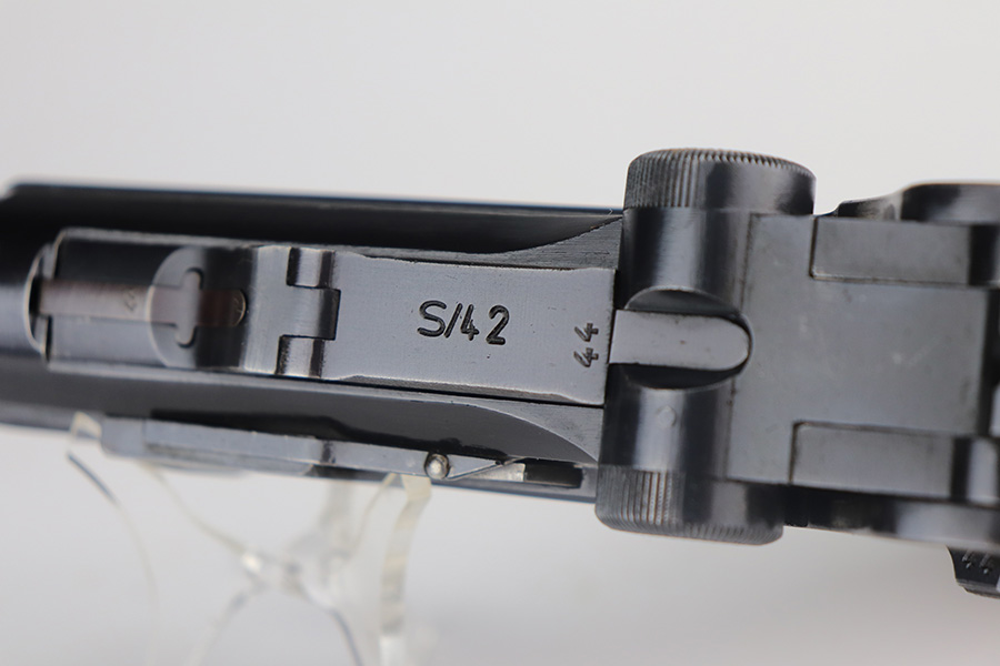 5/26/21 – This is an excellent example of a rare 1939 Mauser Luger rig. It was initially issued to the Nazi military in 1939 and then diverted to the police, as evidenced by the added police sear safety. The gun is all matching and has the proper “Eagle 63” military proofs. The Mauser factory code is “S/42”. This is a rare gun, as it is estimated only about 600 of this variation were diverted to the police. It comes with two original matching magazines and a minty 1939-dated holster. The gun has retained about 96-97% of its original bluing. There are areas of minor wear on the side plate, front edges of the side rail, and around the muzzle. A few dots of spotty discoloration on the barrel and back strap. Excellent matching grips. Mint bore.