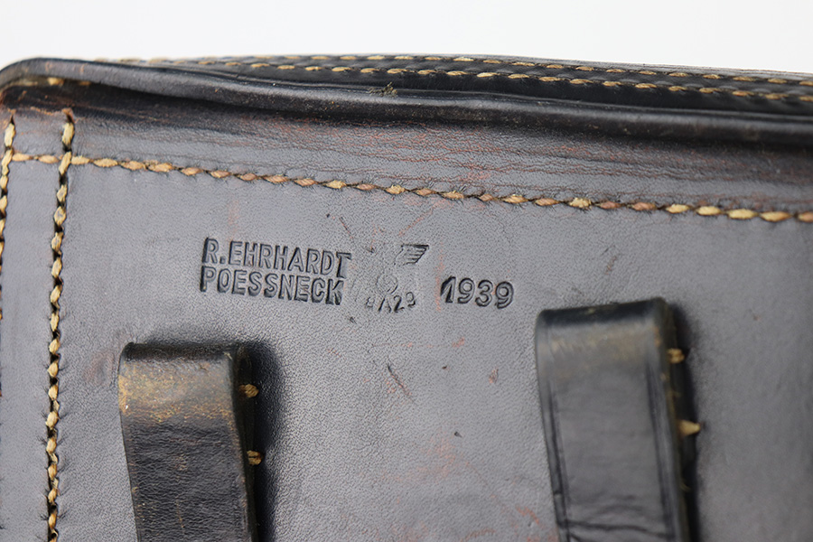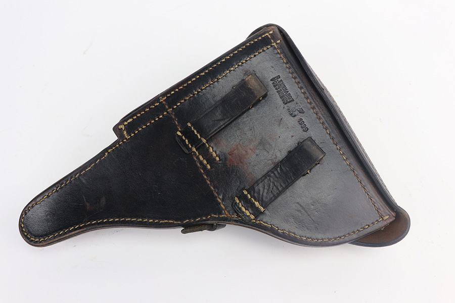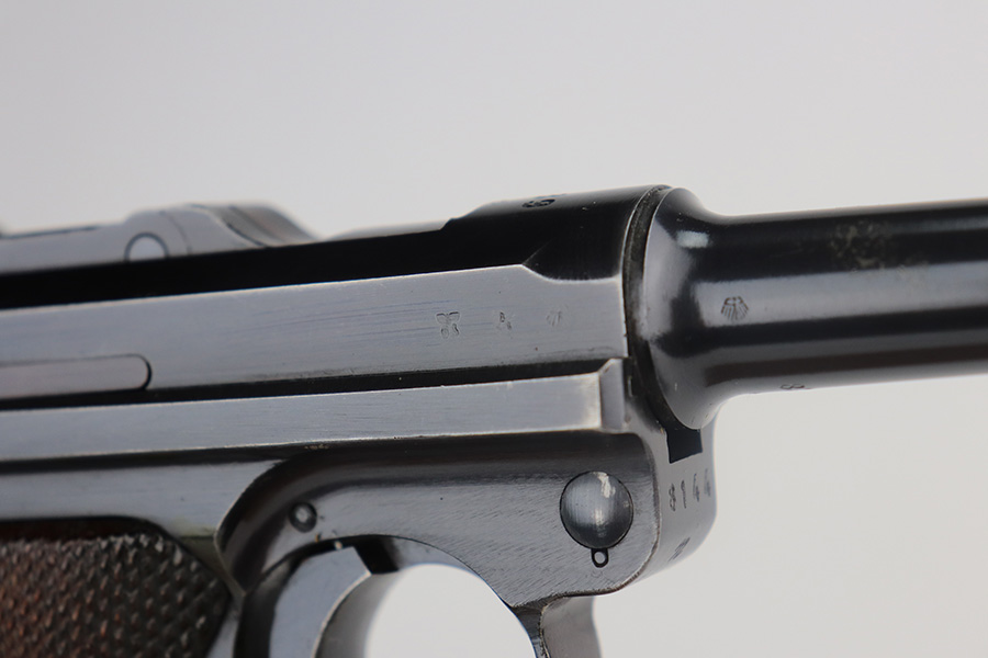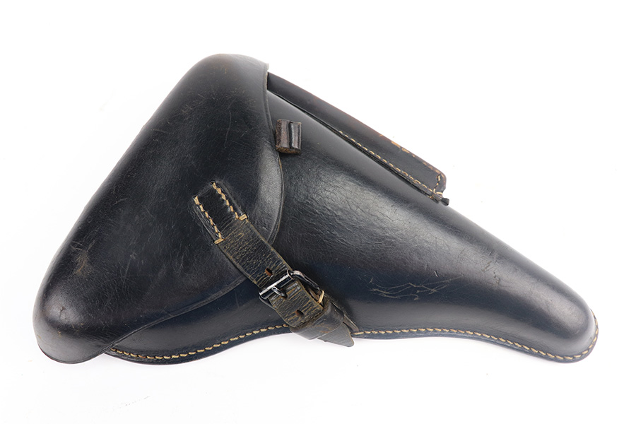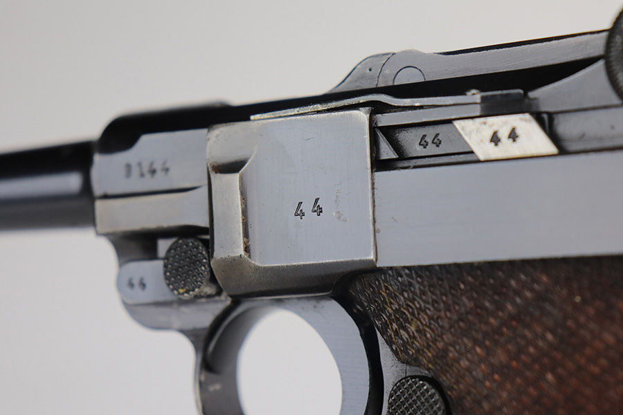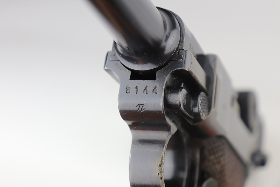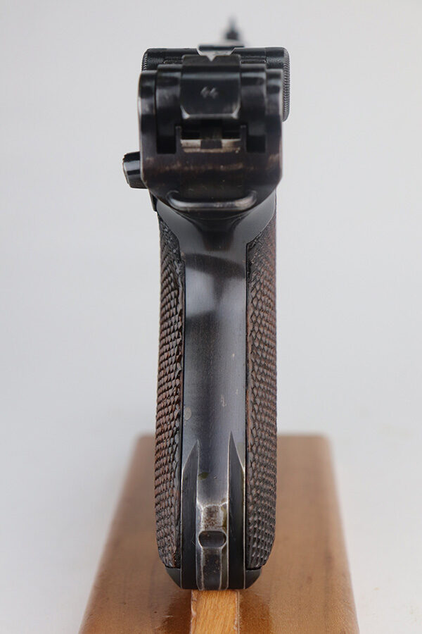 5/26/21 – This is an excellent example of a rare 1939 Mauser Luger rig. It was initially issued to the Nazi military in 1939 and then diverted to the police, as evidenced by the added police sear safety. The gun is all matching and has the proper “Eagle 63” military proofs. The Mauser factory code is “S/42”. This is a rare gun, as it is estimated only about 600 of this variation were diverted to the police. It comes with two original matching magazines and a minty 1939-dated holster. The gun has retained about 96-97% of its original bluing. There are areas of minor wear on the side plate, front edges of the side rail, and around the muzzle. A few dots of spotty discoloration on the barrel and back strap. Excellent matching grips. Mint bore.