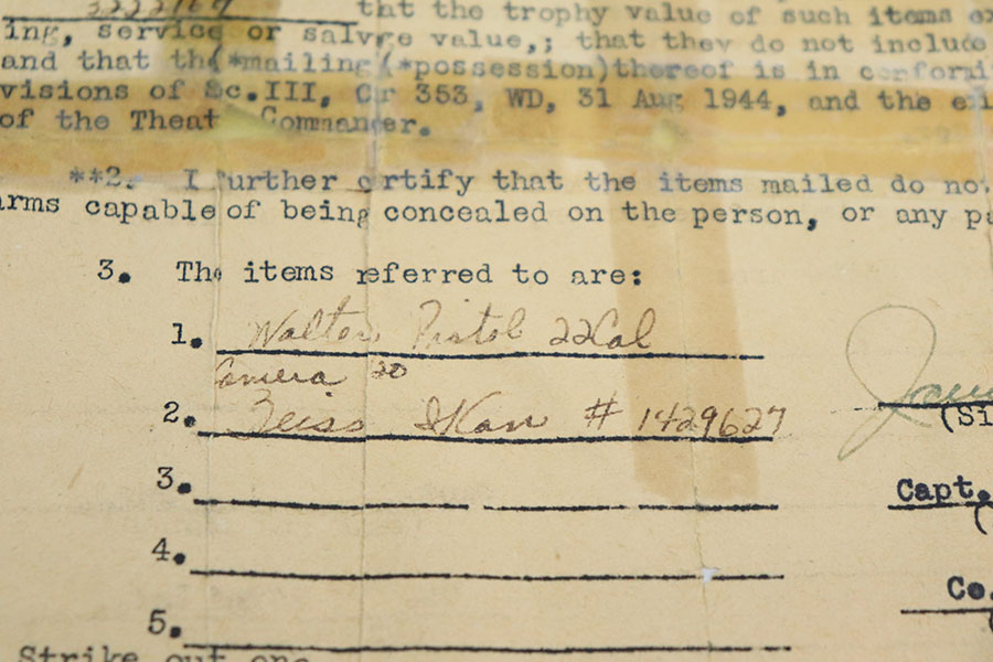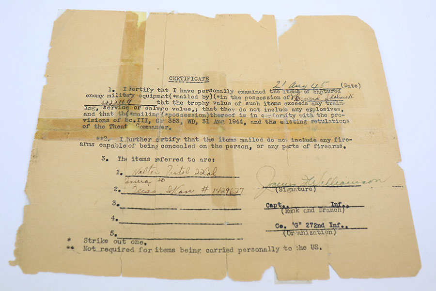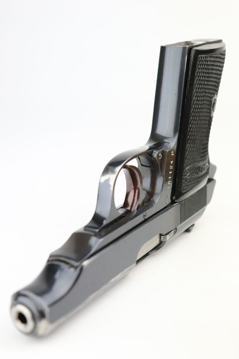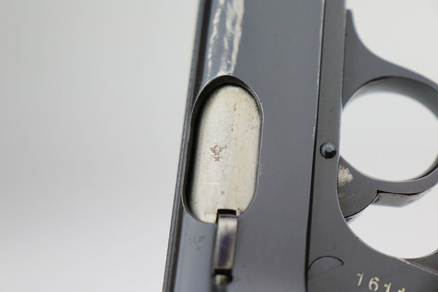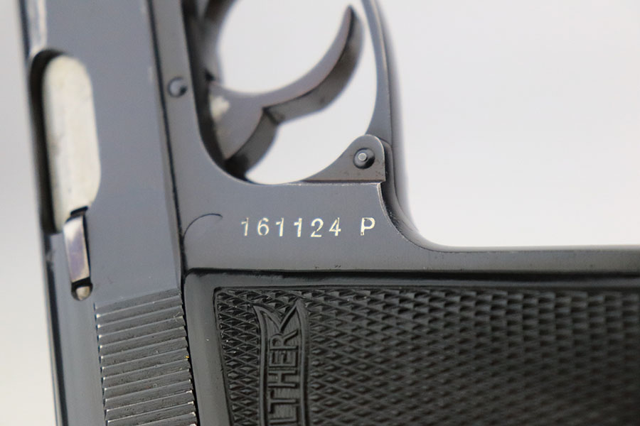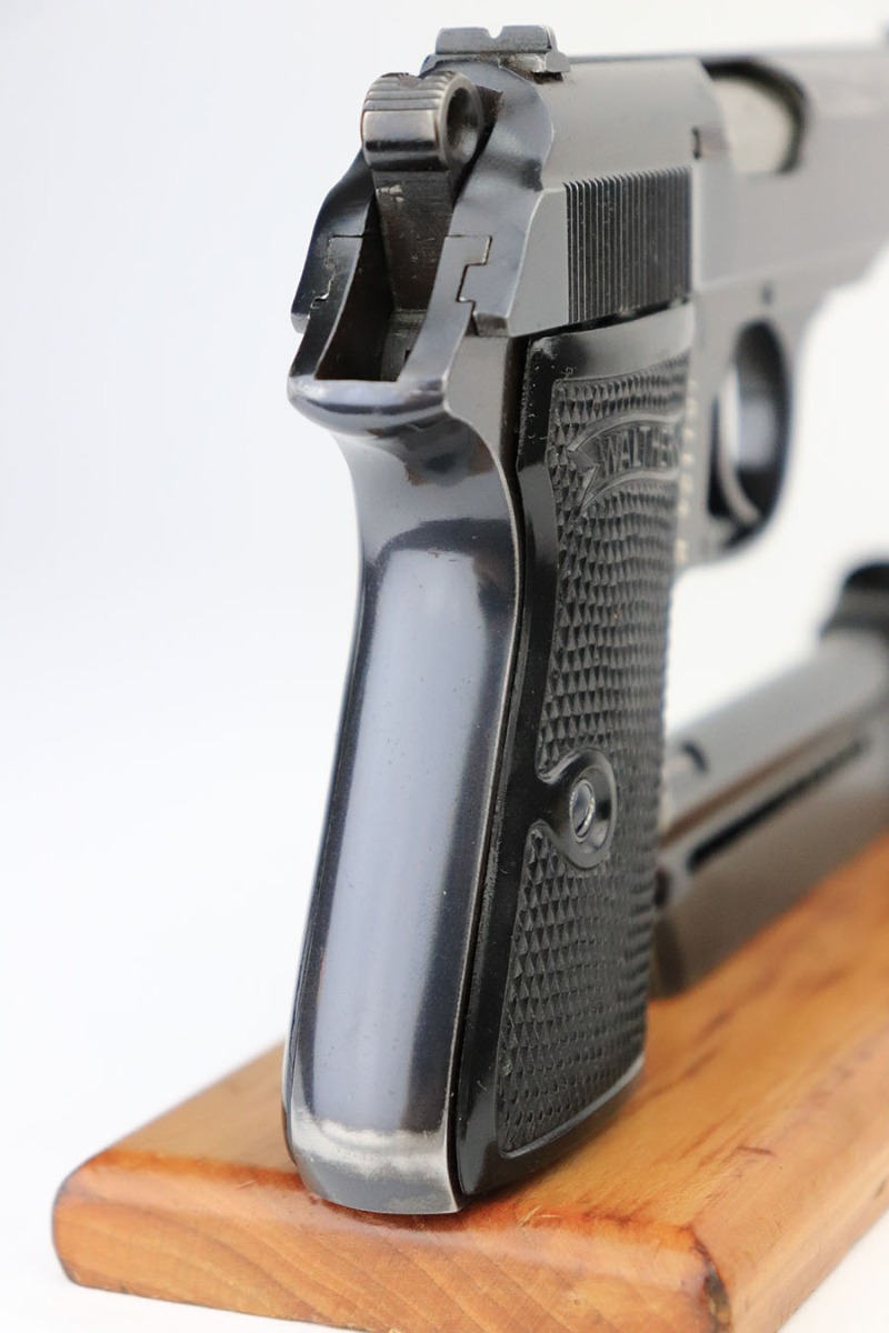 10/10/22 – This is an excellent example of a rare .22 Caliber Walther sold in the commercial market in 1940. It is all matching and has the proper “Eagle N” commercial proofs. It also comes with an original capture document dated August 21, 1945 that says “Walther Pistol 22 Cal”. Unfortunately there is no serial number listed. It also lists a camera. The paper is starting to tear and was repaired with tape. The gun itself has retained about 96% of its original high polish finish. There is minor muzzle wear and some wear along the round edge of the right side of the slide. Also one spot of wear at the base of the back strap. Comes with excellent period-correct black bakelite grips and a proper .22 caliber finger extension magazine. Mint bore.