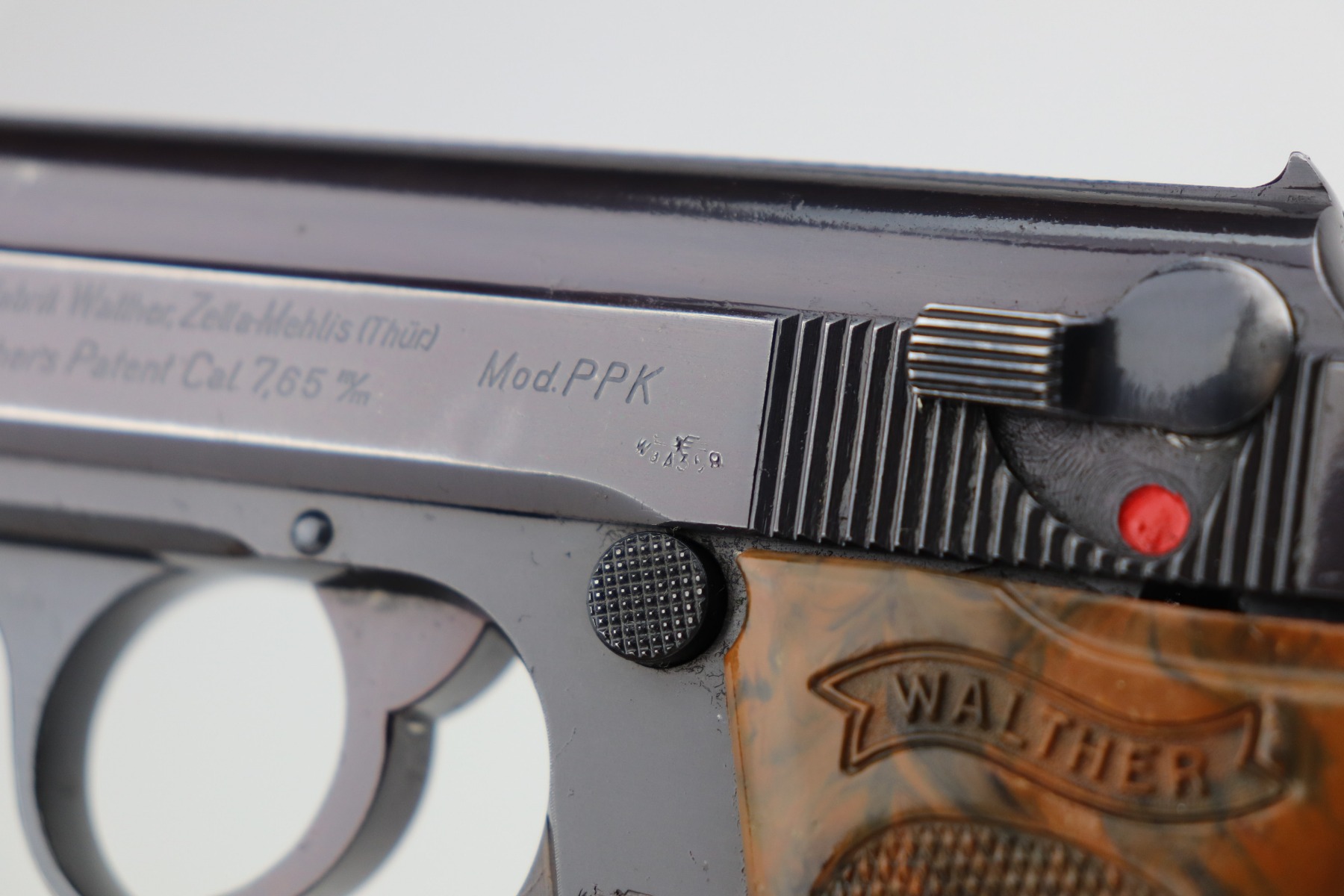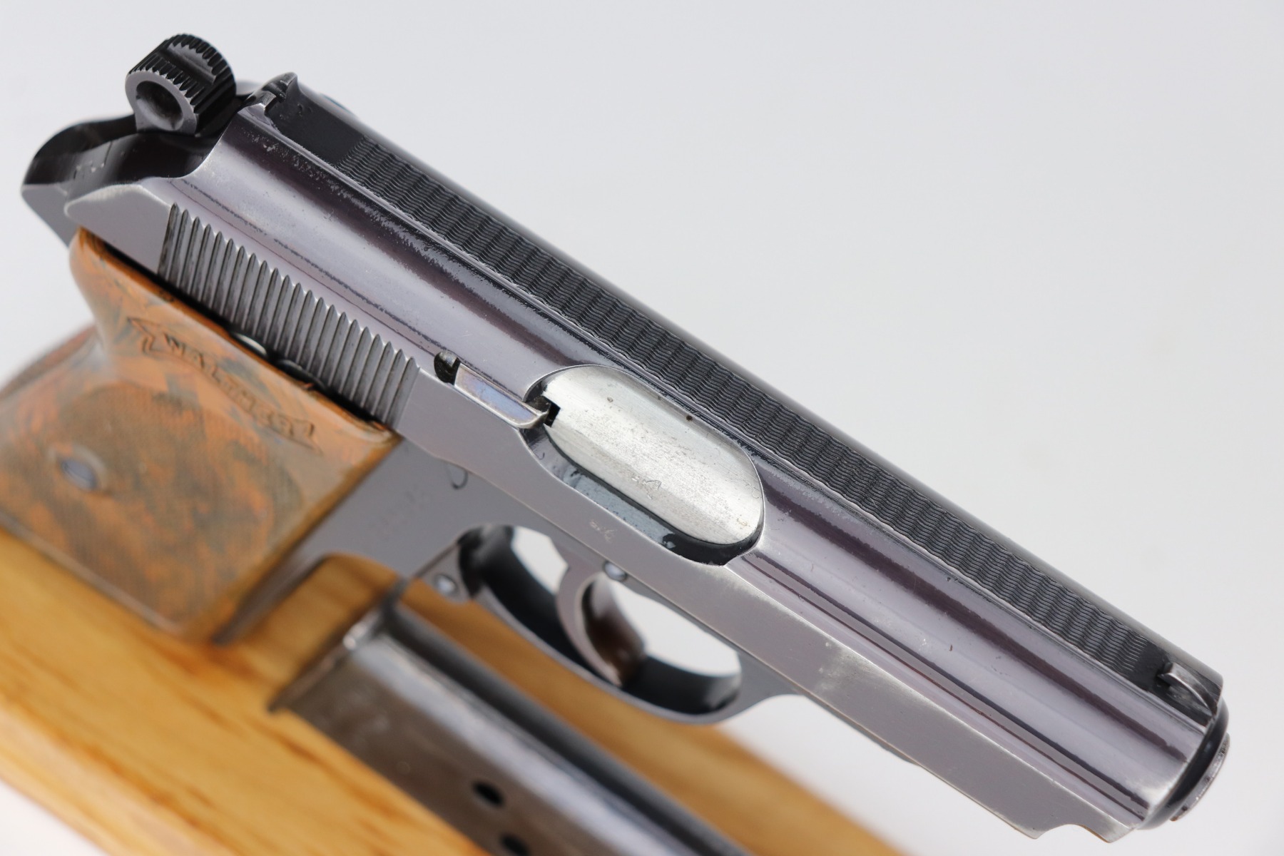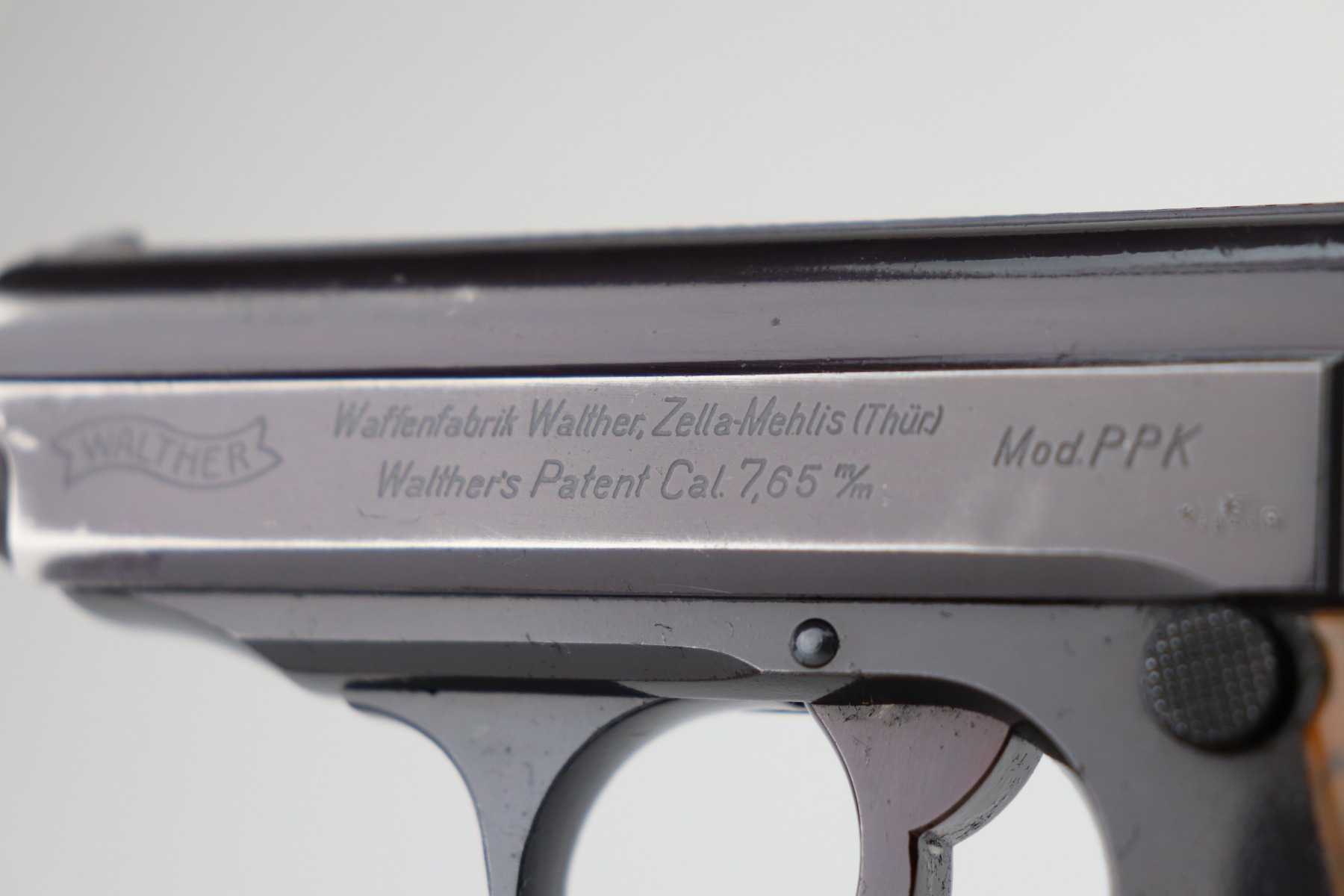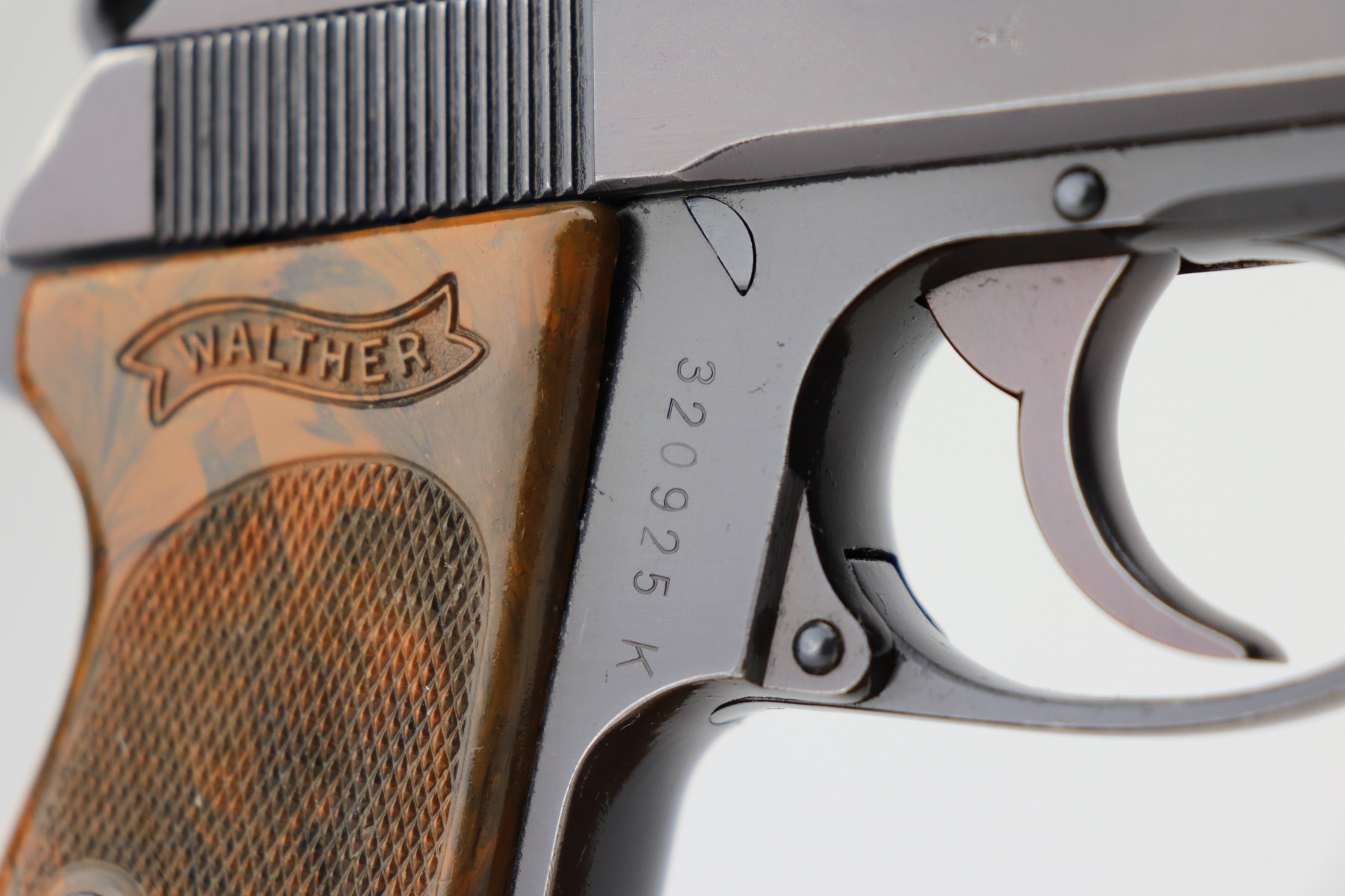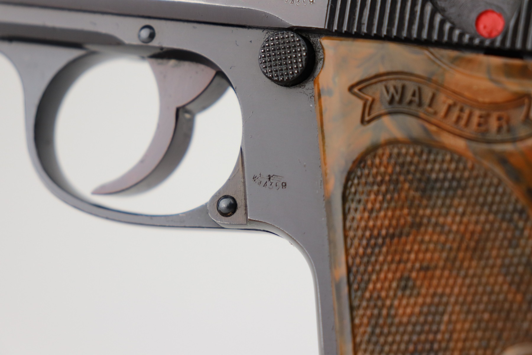 4/11/22 – This is an excellent example of a Walther PPK issued to the Nazi military in 1940. It is all matching and has the proper “Waffen 359” military proofs. This one has a beautiful plumb-colored high polish finish. It has retained about 94-95% of its original bluing. There is minor wear around the muzzle and high edges of the slide. A couple of small areas of wear on the right side of the slide. It comes with an excellent brown Walther grip and a wartime magazine. The bore is near-mint.