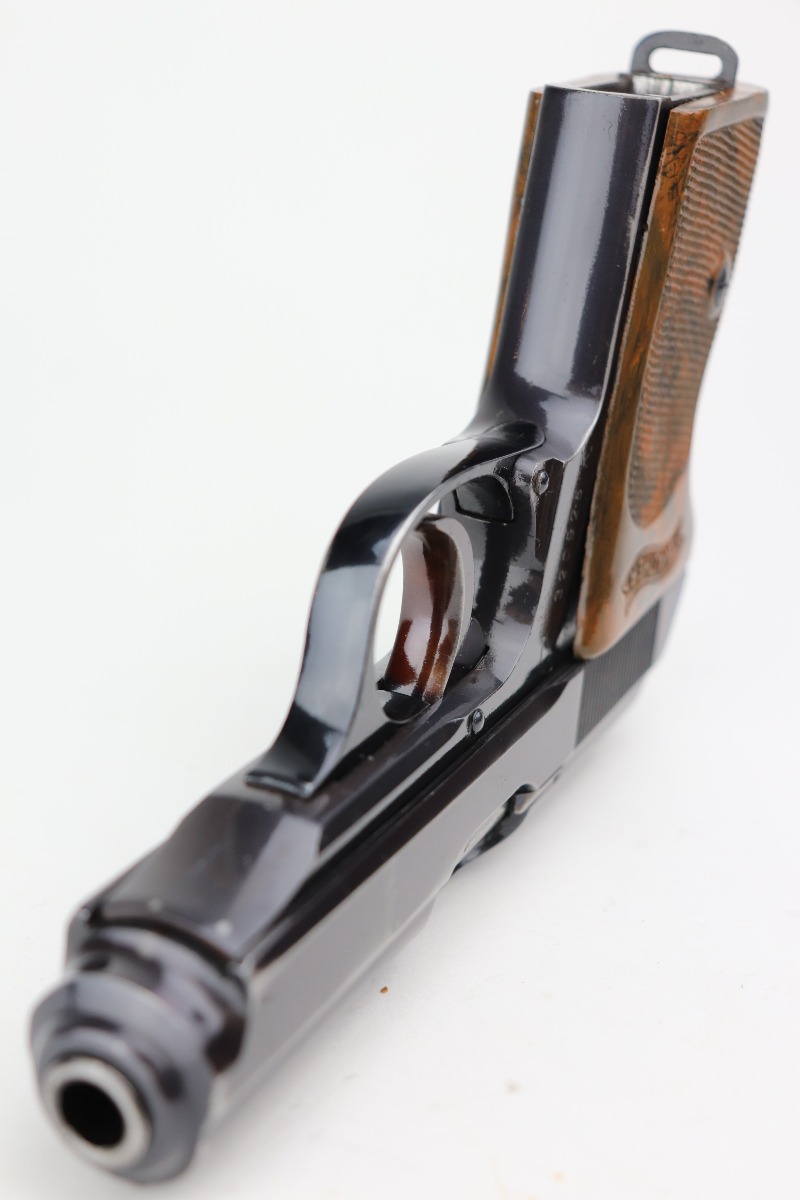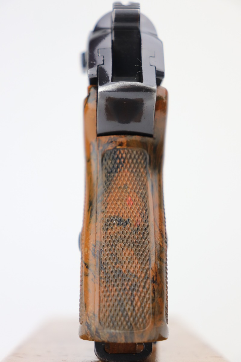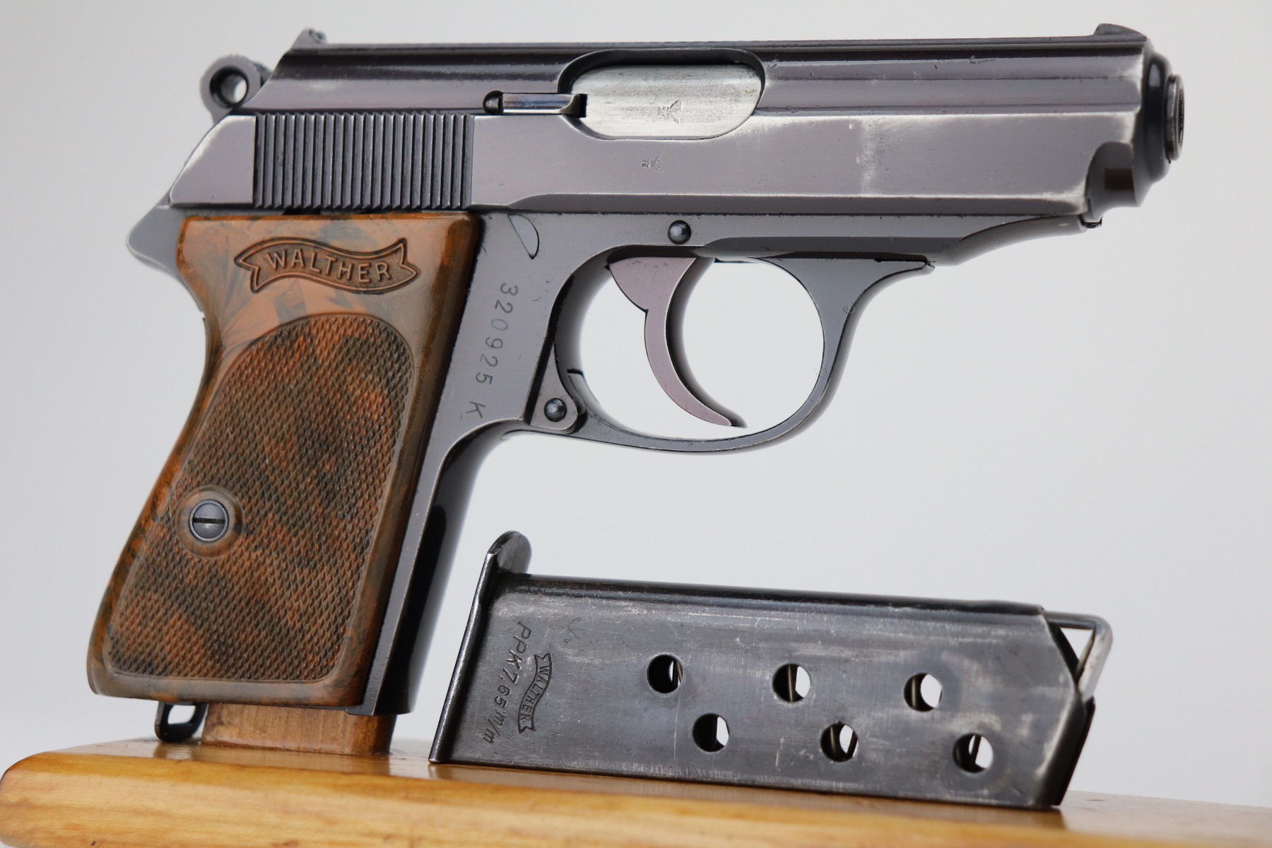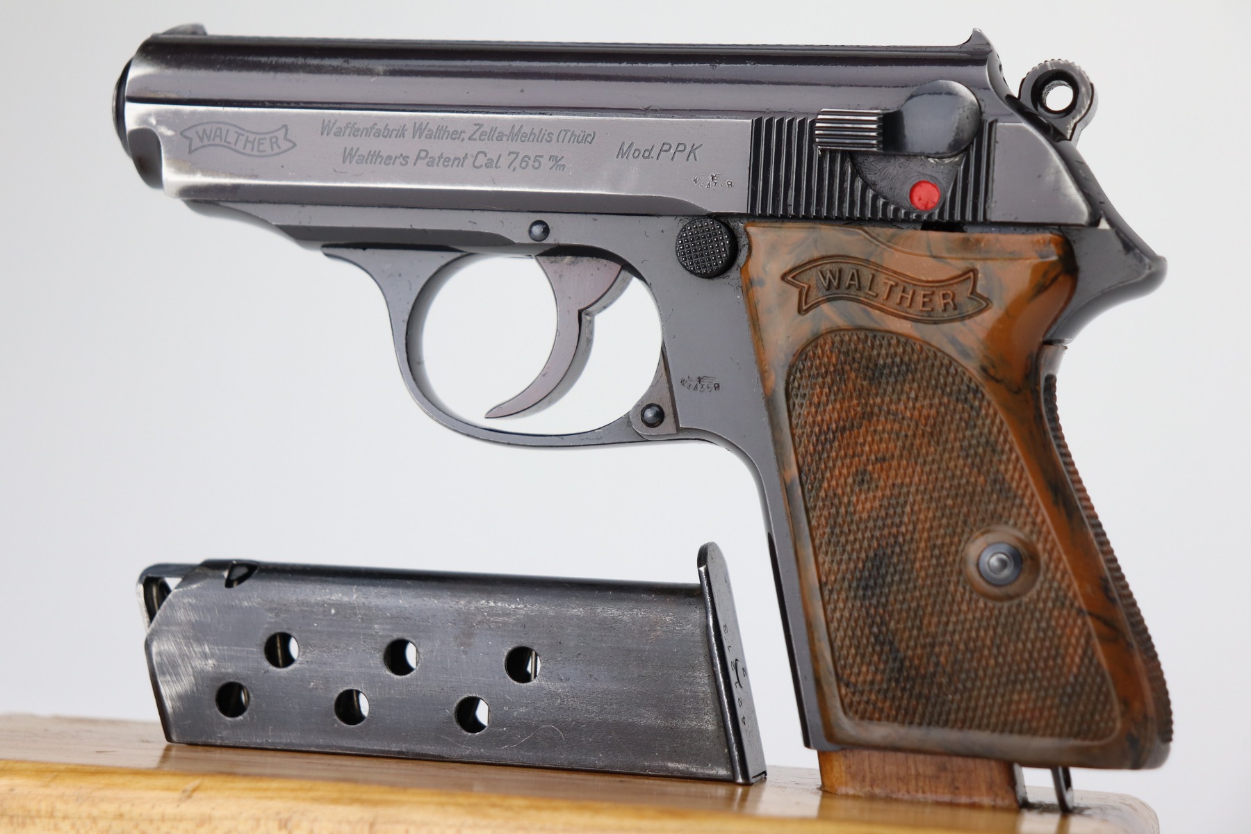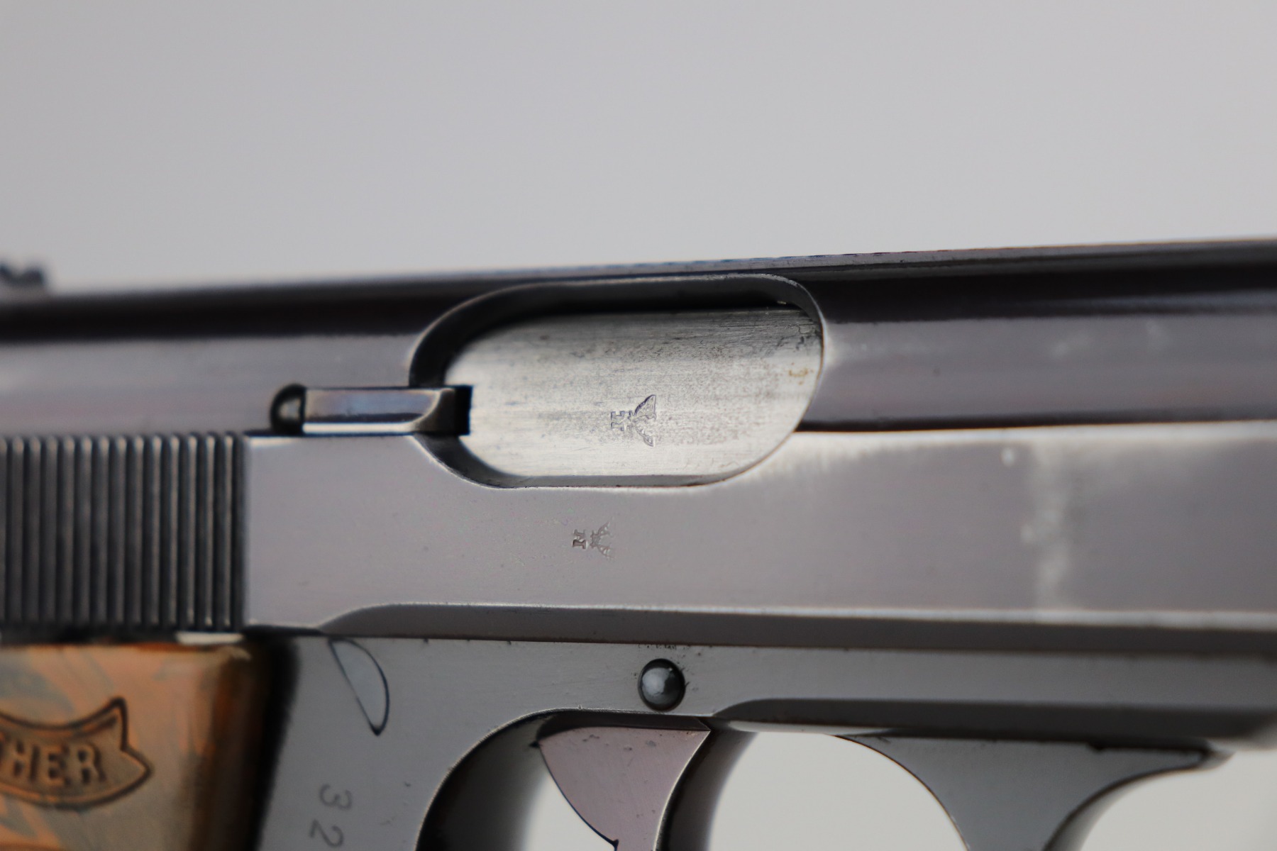 4/11/22 – This is an excellent example of a Walther PPK issued to the Nazi military in 1940. It is all matching and has the proper “Waffen 359” military proofs. This one has a beautiful plumb-colored high polish finish. It has retained about 94-95% of its original bluing. There is minor wear around the muzzle and high edges of the slide. A couple of small areas of wear on the right side of the slide. It comes with an excellent brown Walther grip and a wartime magazine. The bore is near-mint.