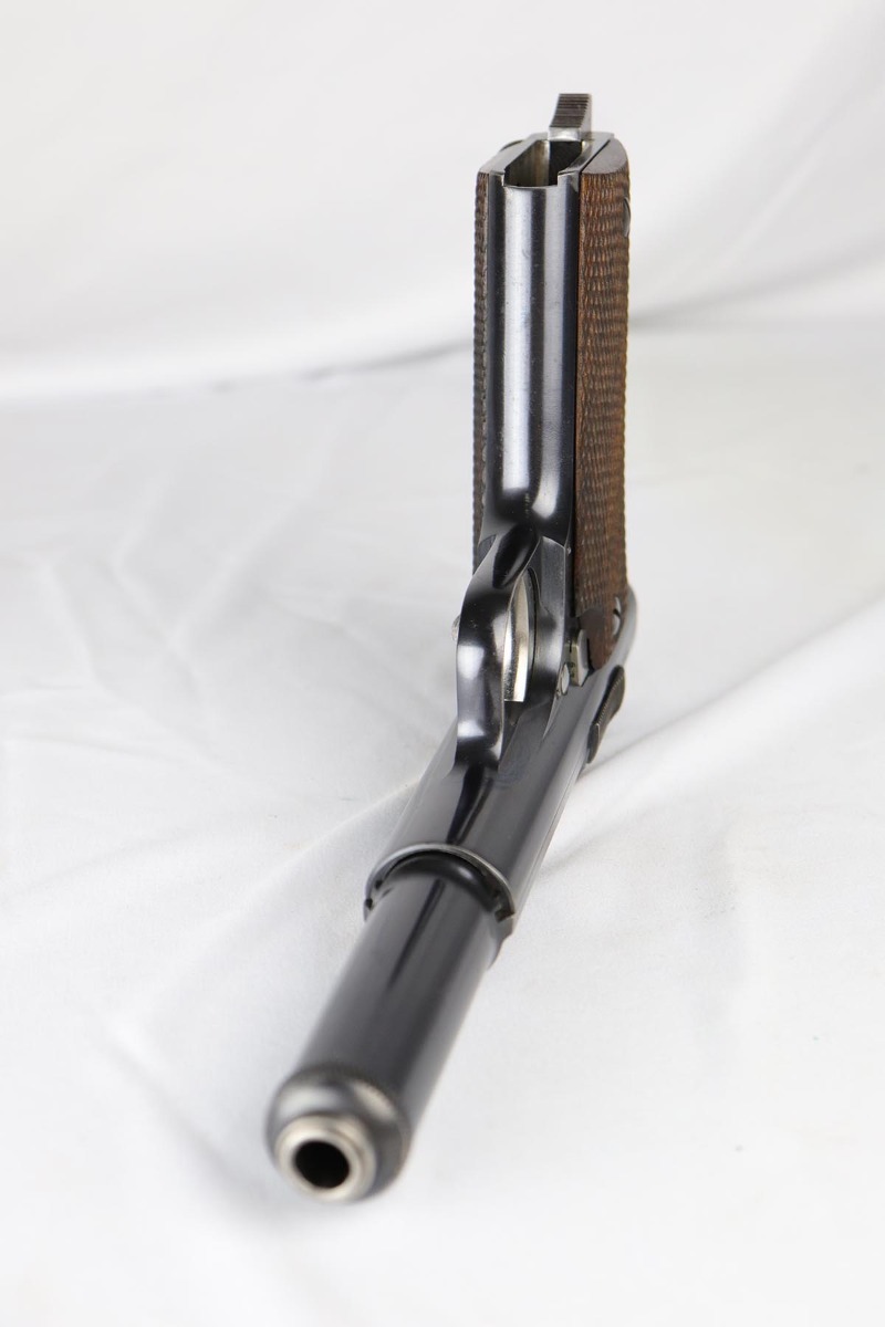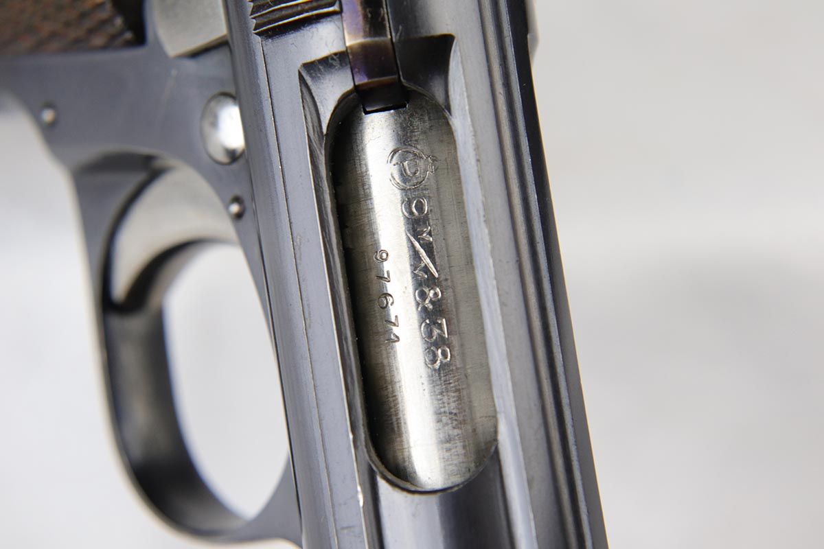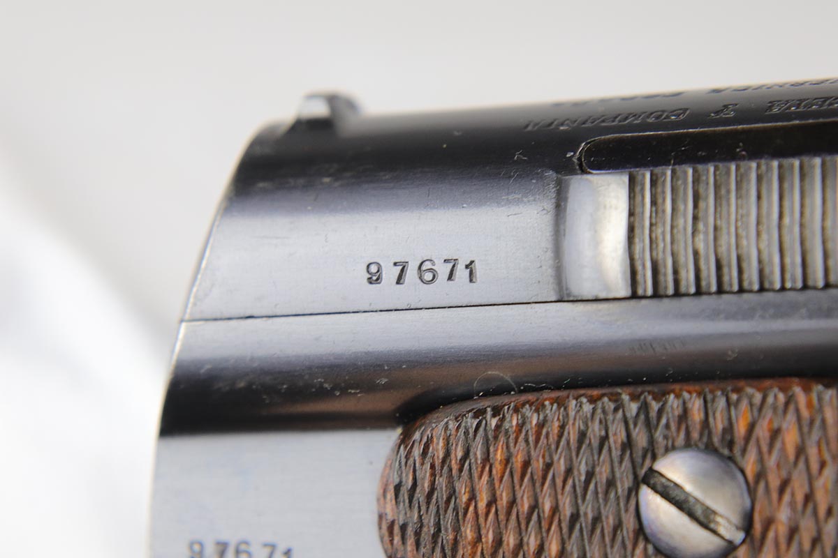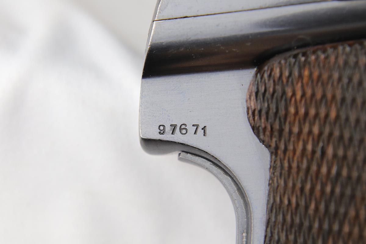 4/23/18 – This is a gorgeous example of a rare Nazi contract pistol – the Spanish Astra 400.  There were only ~6,000 Astra 400’s produced for the Nazi contract, all in 1941, as evidenced by the Awschalom factory letter which detailed the serial range for this contract.  This pistol is fully original and correct with about 97% blue remaining.  There is minor edge wear on the back of the frame/slide, and an area of finish loss on the high edge of the right side.  Minty grips, magazine and bore.