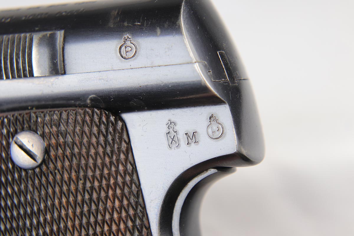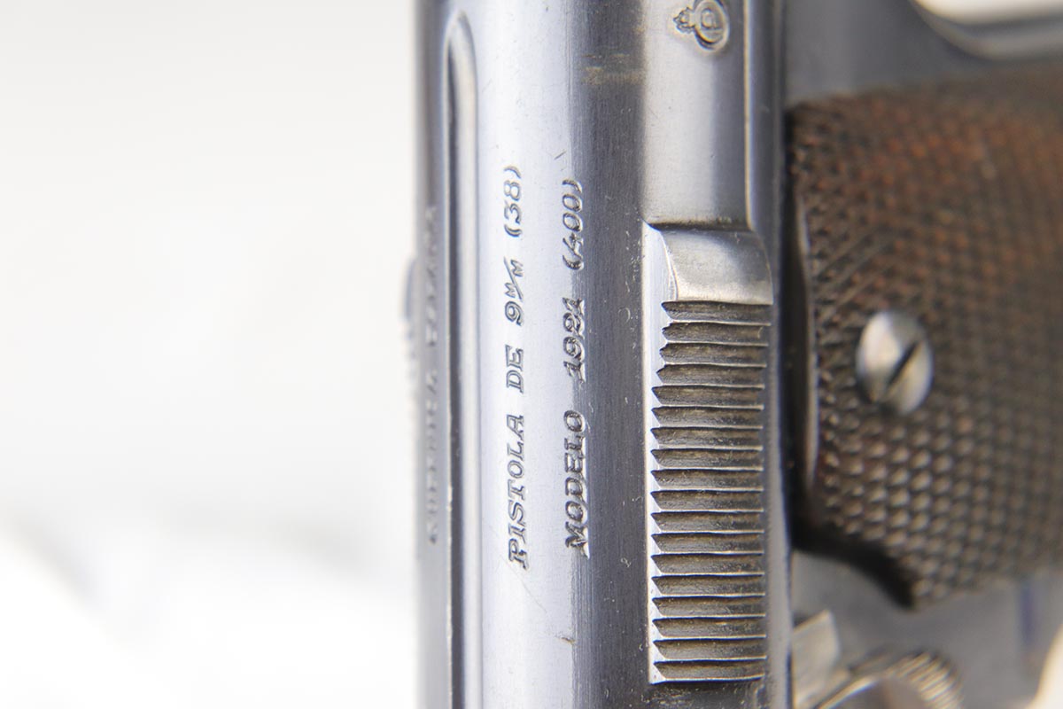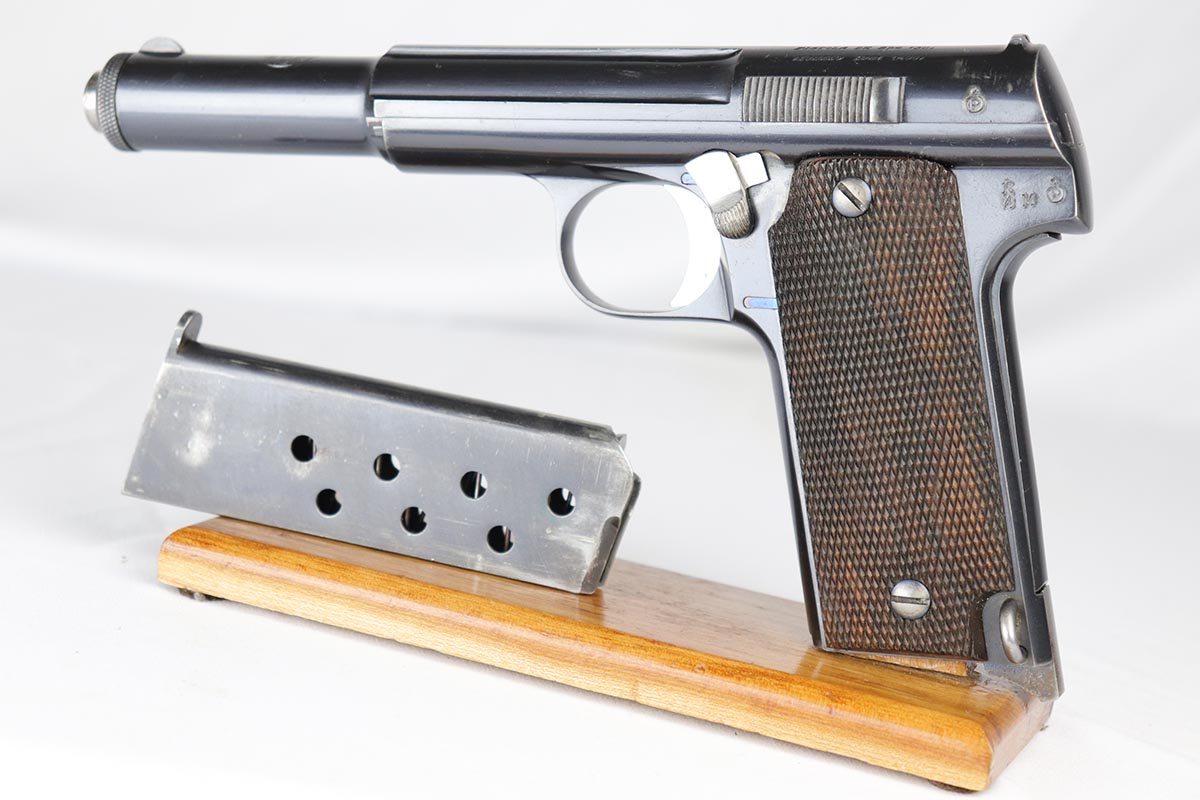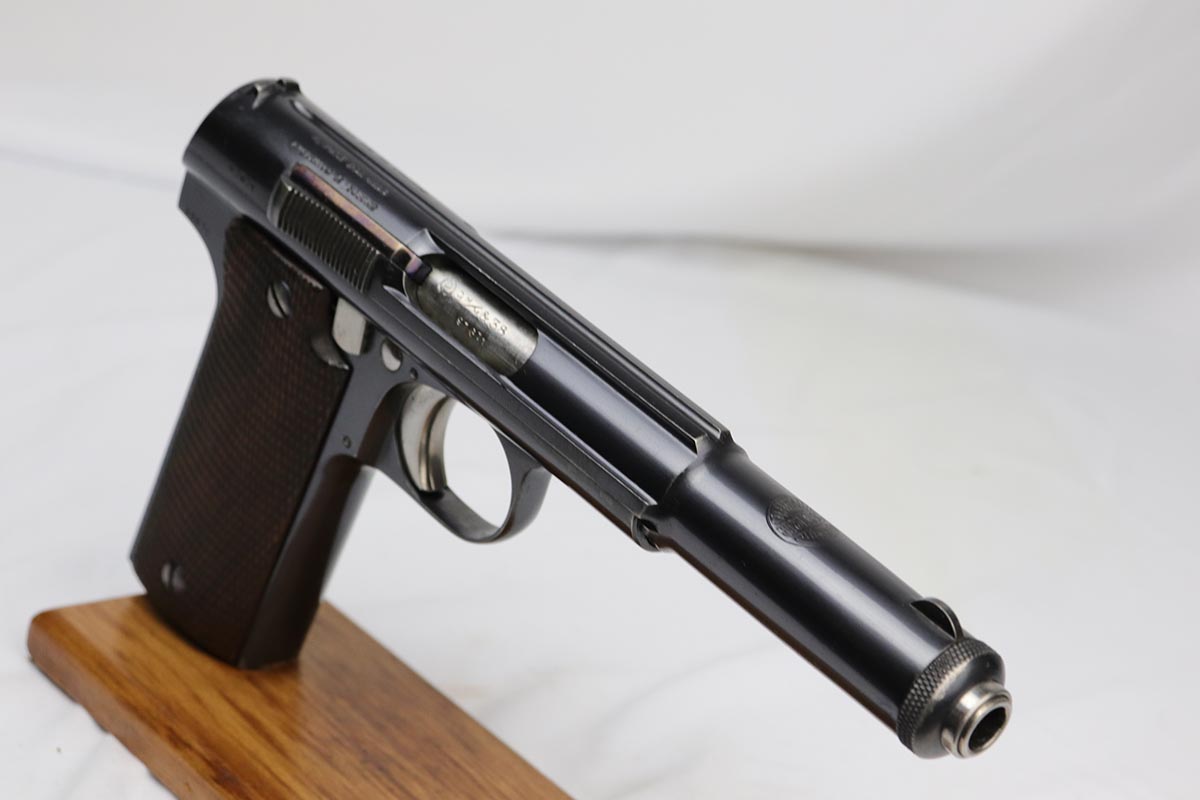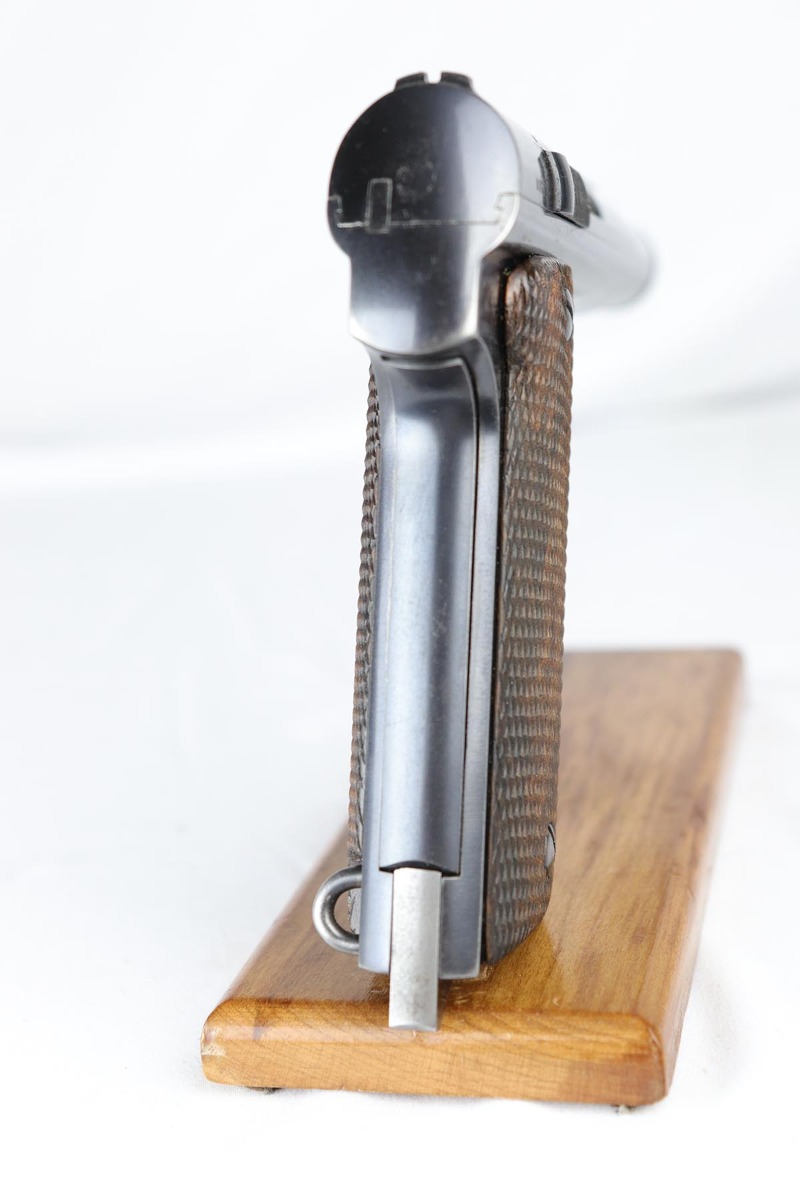 4/23/18 – This is a gorgeous example of a rare Nazi contract pistol – the Spanish Astra 400.  There were only ~6,000 Astra 400’s produced for the Nazi contract, all in 1941, as evidenced by the Awschalom factory letter which detailed the serial range for this contract.  This pistol is fully original and correct with about 97% blue remaining.  There is minor edge wear on the back of the frame/slide, and an area of finish loss on the high edge of the right side.  Minty grips, magazine and bore.