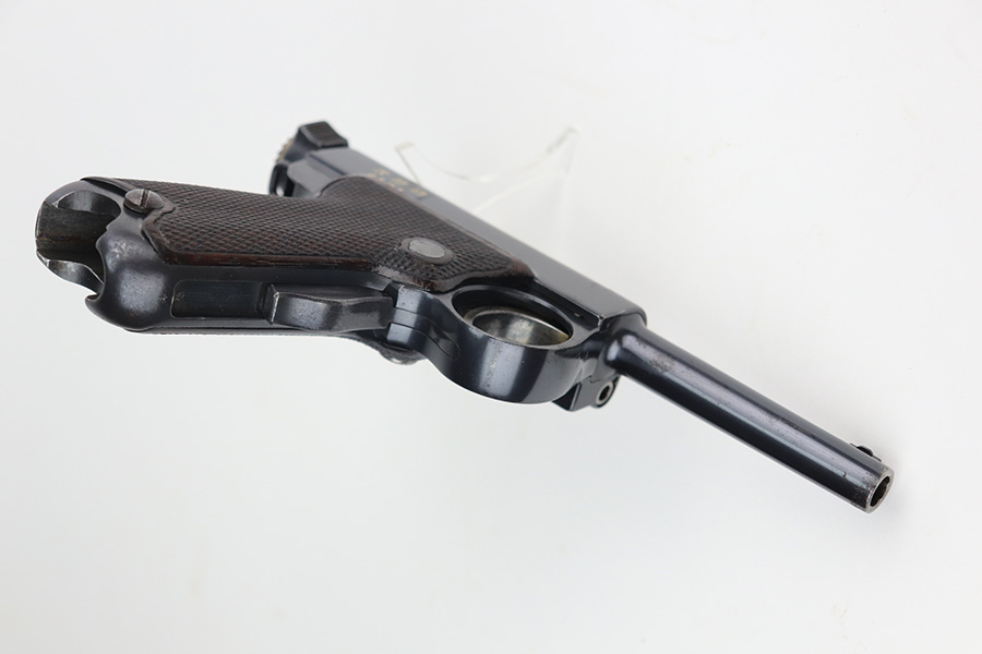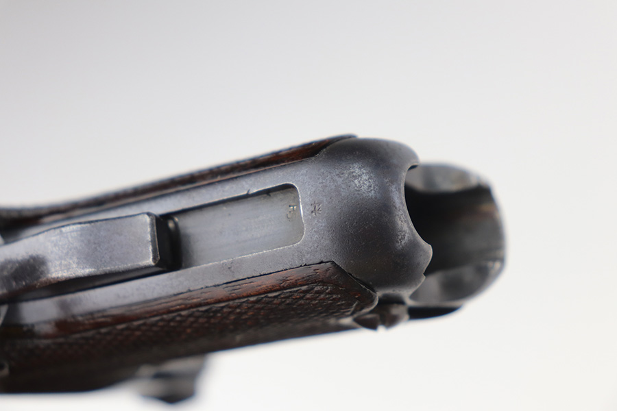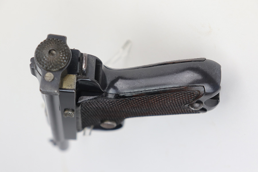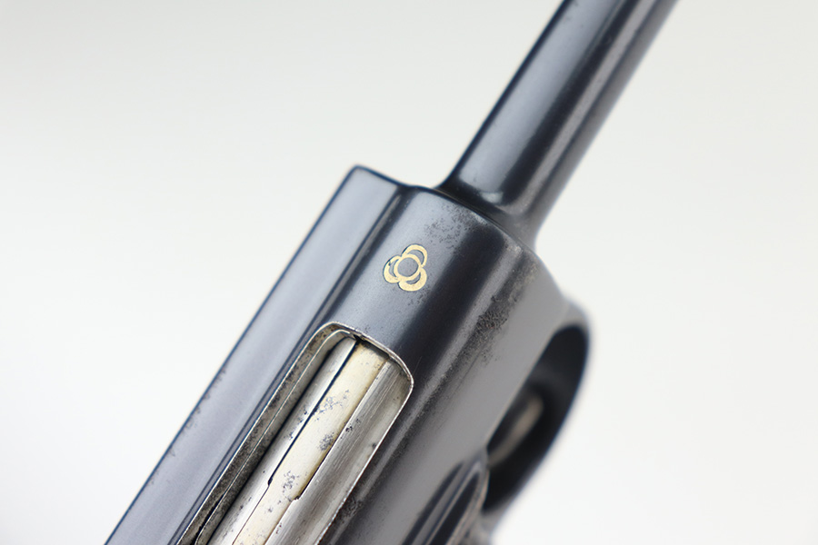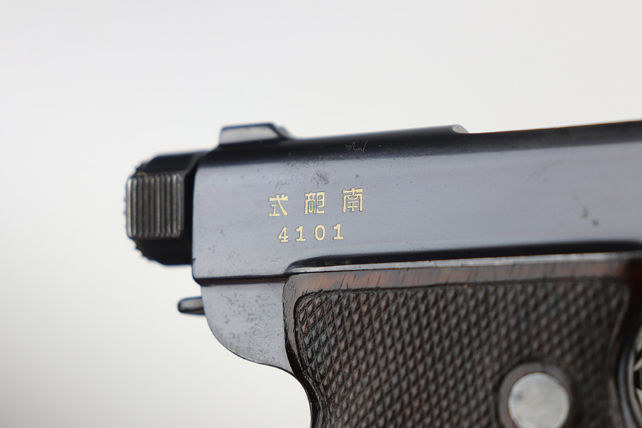 8/5/21 – This is an excellent Baby Nambu pistol that was manufactured at the Tokyo Arsenal in the 1910s, and still has the original, matching grips. The pistol has about 95-96% of the original blue, with a little bit of bluing loss on the left frame edge and muzzle, and a little more on the grip safety. There are also a few small patches of freckling/pitting. One on muzzle, on left frame edge and on the round portion of the right side of the frame. Excellent bore and grips. Scarce TG&E magazine which is mismatched number to the pistol of course. The Baby Nambu was developed as a personal weapon for high ranking Japanese officers and only about 6,500 were made in total. Considered by collectors to be one of the most beautiful handguns made in pre-war Japan, it featured ornamental knurling on the cocking knob and high quality “rust” blue, that rivaled European handguns of the era.