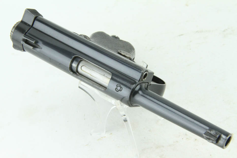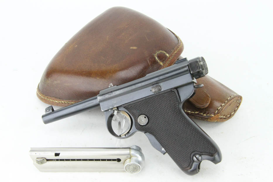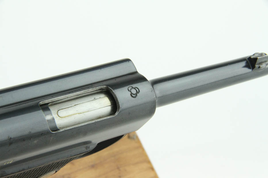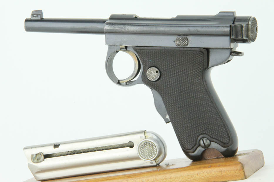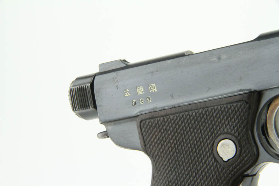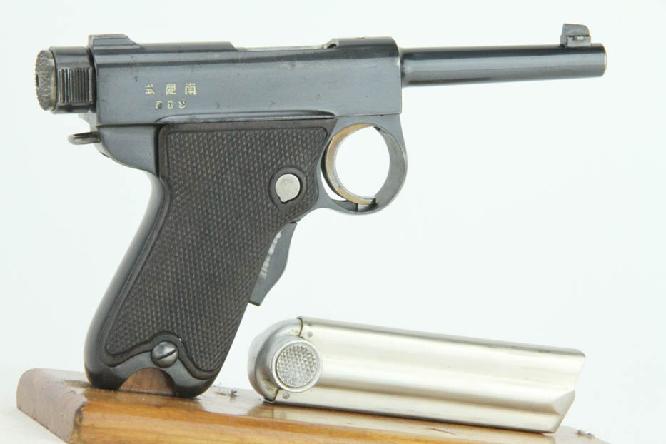 7/24/24 – This is an excellent example of an original Japanese Baby Nambu made at the Tokyo Arsenal. It comes as a rig with one original matching-numbered magazine and a high quality reproduction holster. The gun itself is all matching and has retained about 97% of its original finish. There is some wear on the left side rail and a few tiny pits here and there. Fitted with excellent matching-numbered wood grips. Excellent, shiny bore.