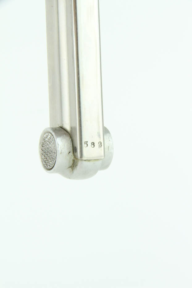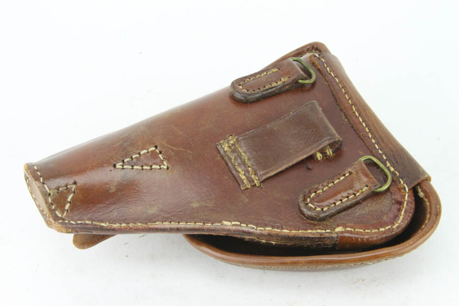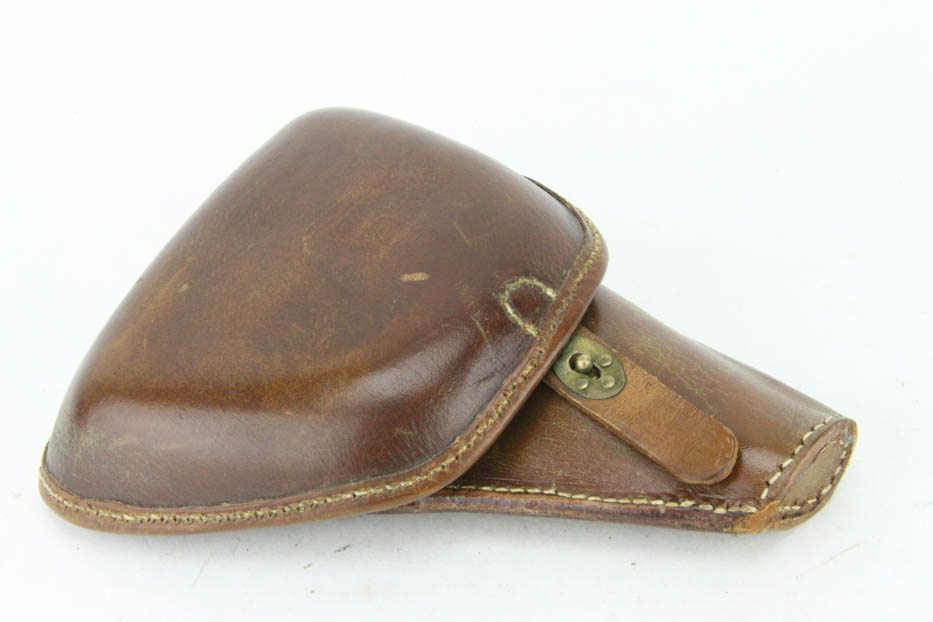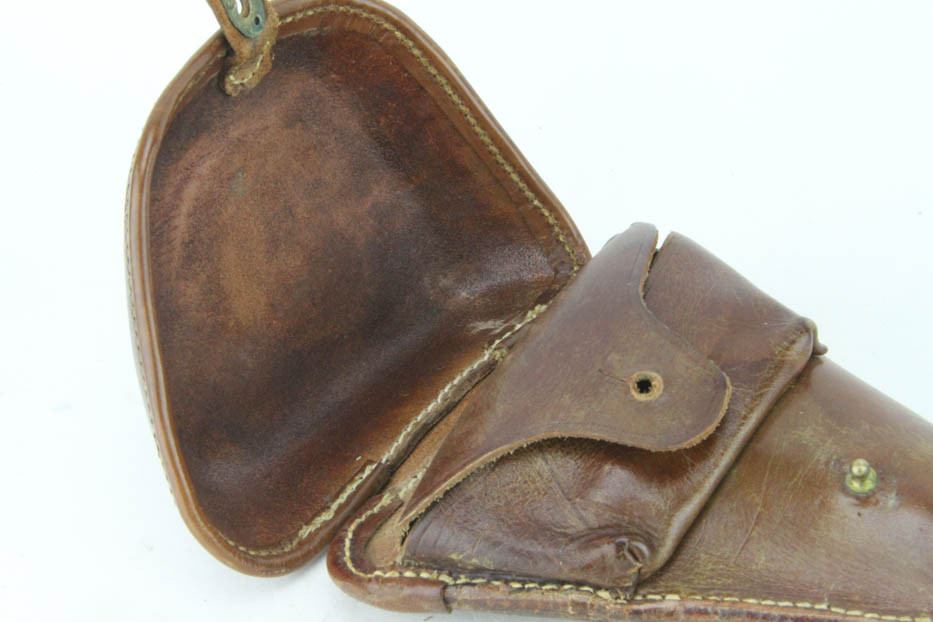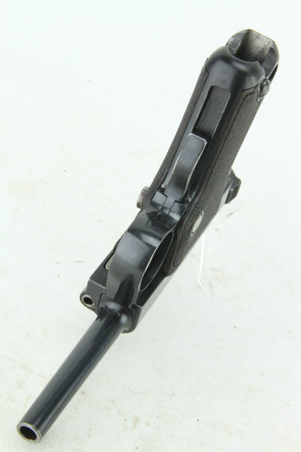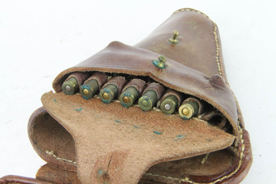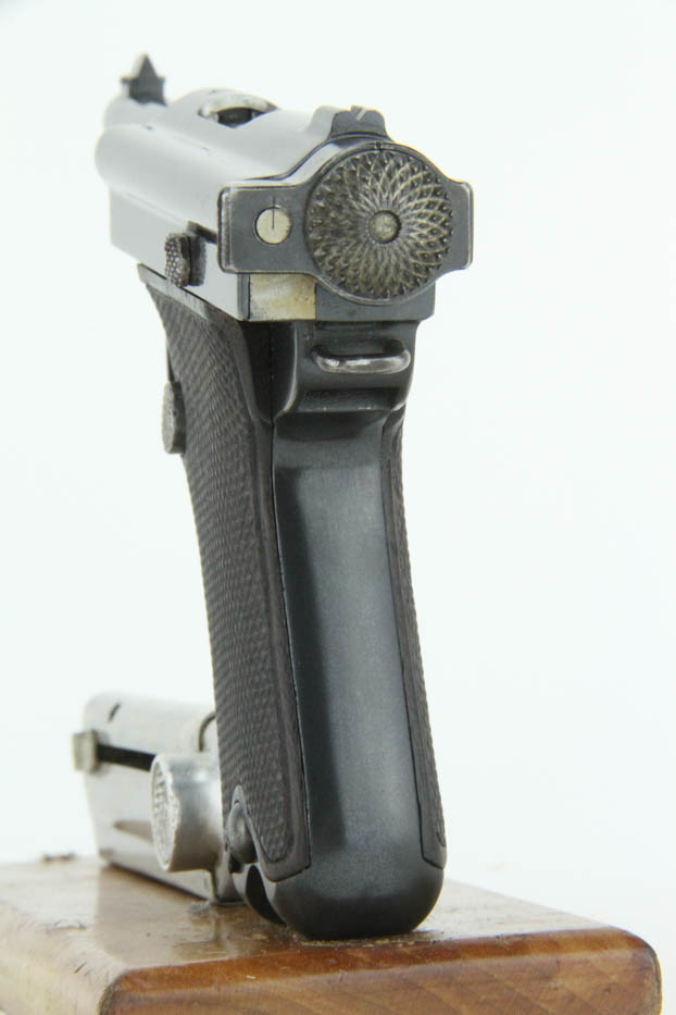 7/24/24 – This is an excellent example of an original Japanese Baby Nambu made at the Tokyo Arsenal. It comes as a rig with one original matching-numbered magazine and a high quality reproduction holster. The gun itself is all matching and has retained about 97% of its original finish. There is some wear on the left side rail and a few tiny pits here and there. Fitted with excellent matching-numbered wood grips. Excellent, shiny bore.