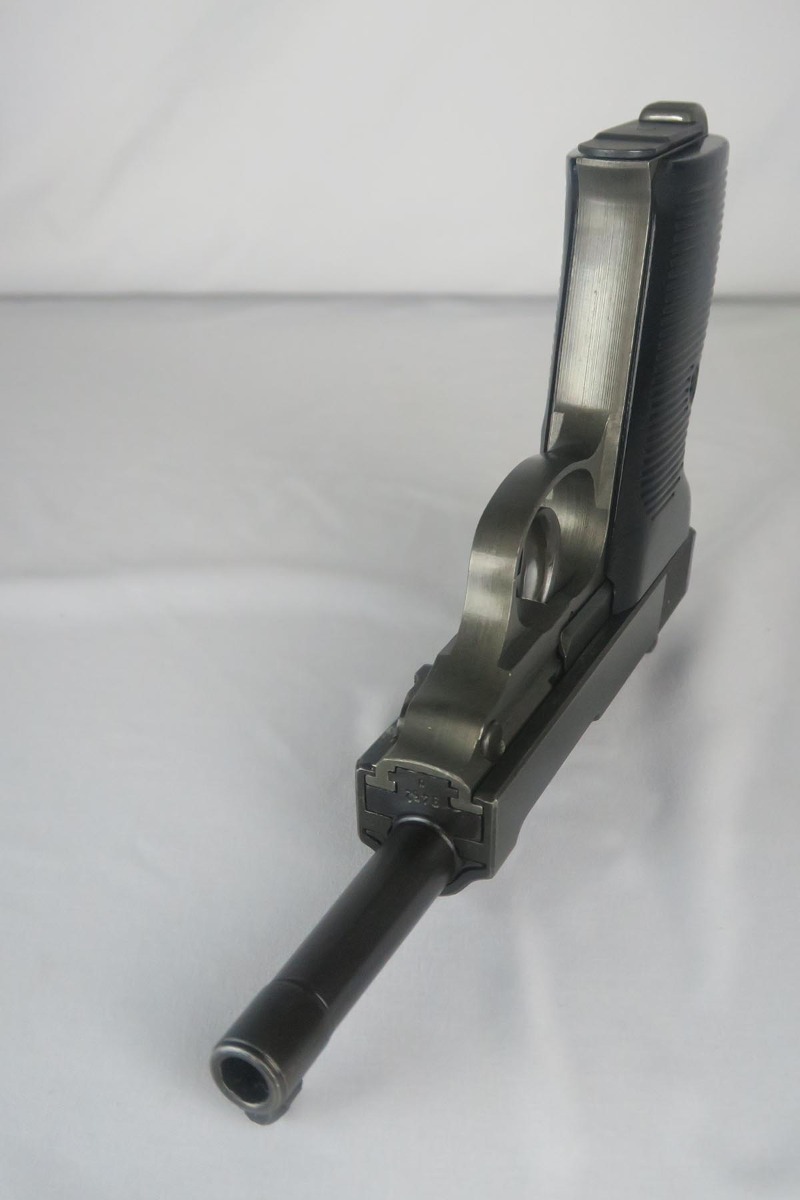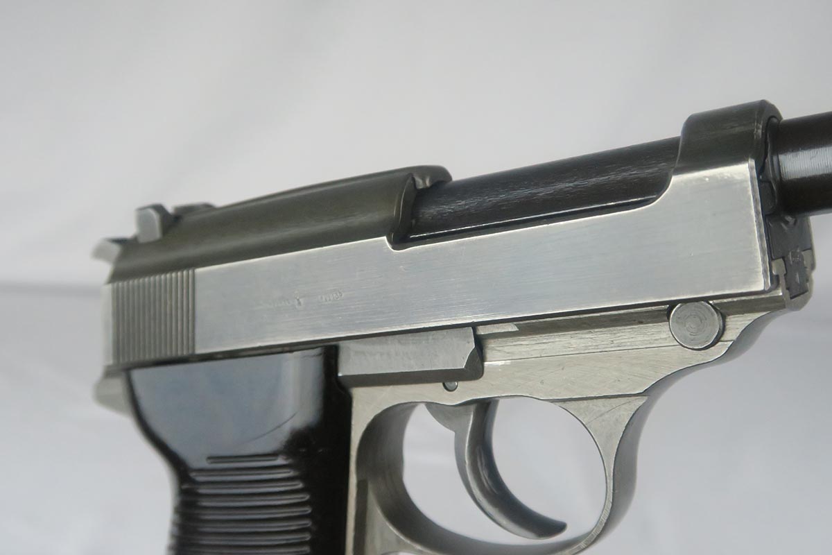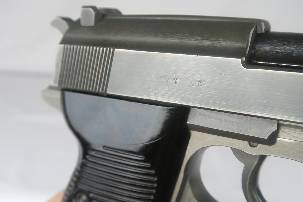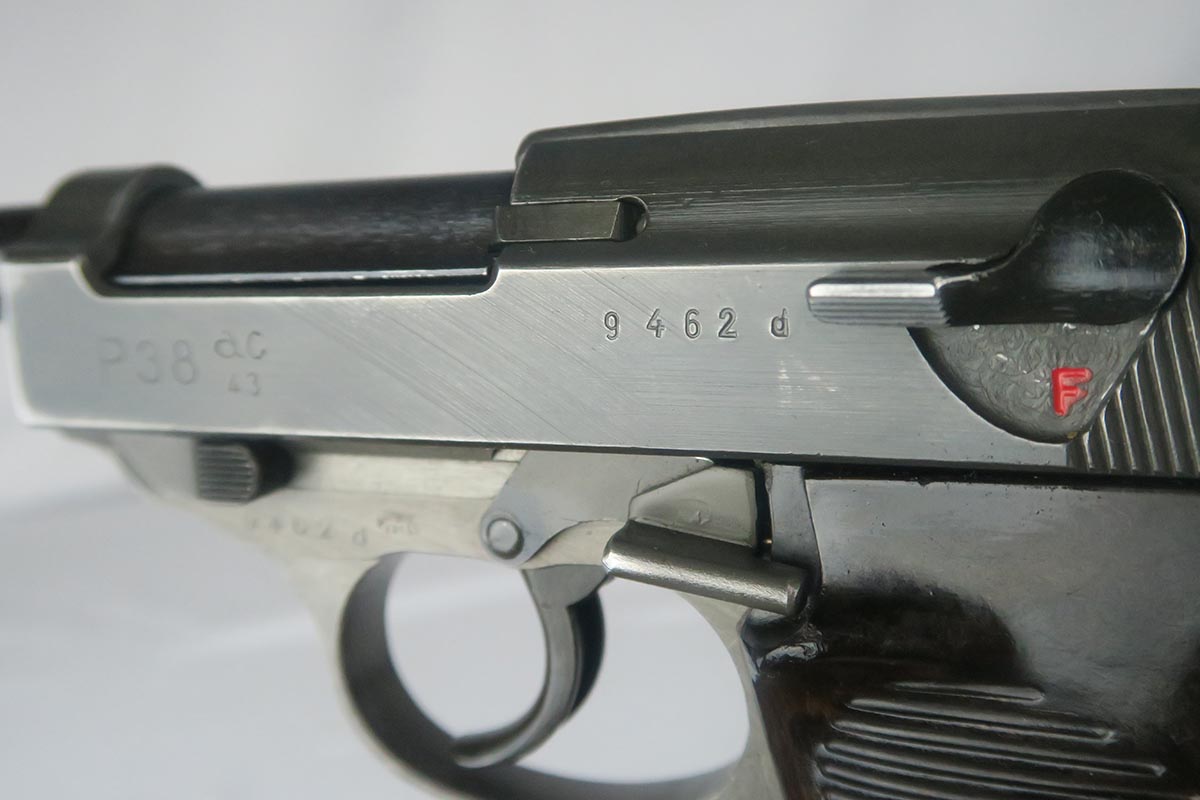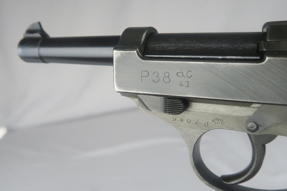 1/25/18 – This is an excellent example of a rare Mauser P.38 – a dual-tone with ac 43 marked slide. The slide shows the distinctive large ‘ac’ logo as the slide was manufactured at the FN factory in Belgium. The pistol is all matching and correct with 97-98% original finish remaining. The only wear is on the front edges of the slide. Minty bore and grips. Phosphate slide, frame and some small parts. Blued barrel. Decocker works properly. Late war magazine.