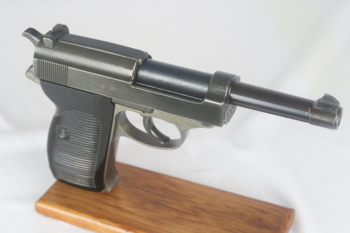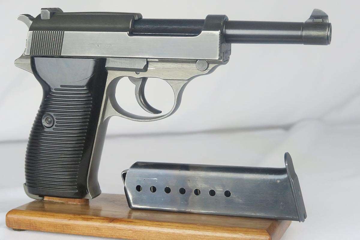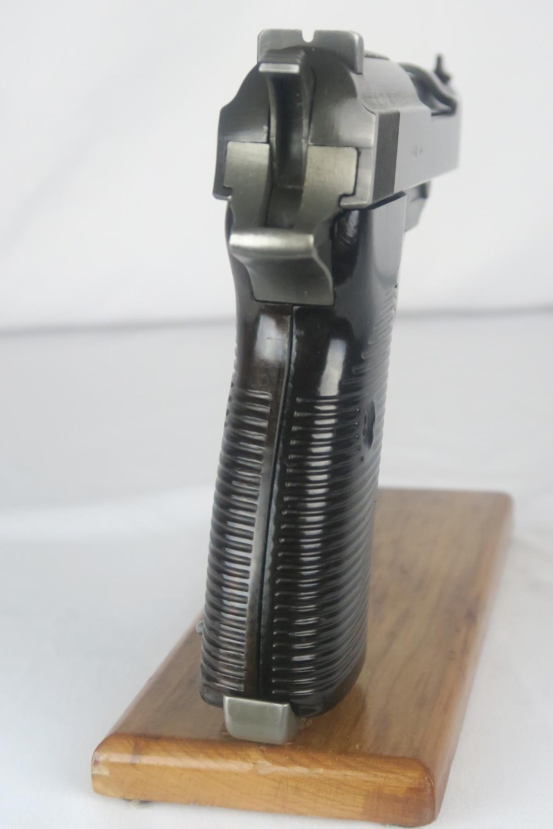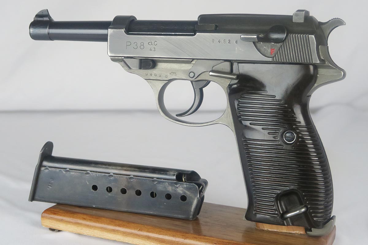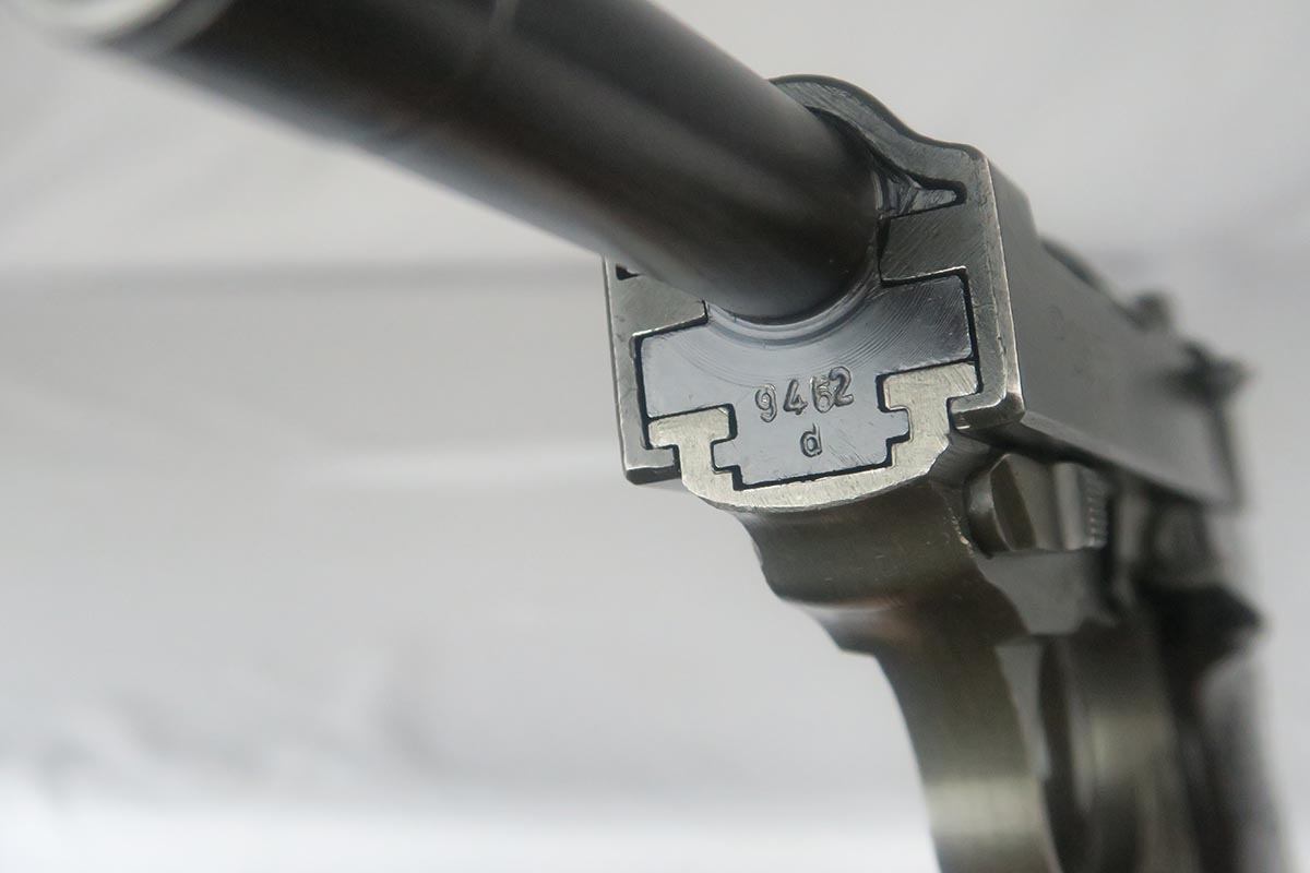 1/25/18 – This is an excellent example of a rare Mauser P.38 – a dual-tone with ac 43 marked slide. The slide shows the distinctive large ‘ac’ logo as the slide was manufactured at the FN factory in Belgium. The pistol is all matching and correct with 97-98% original finish remaining. The only wear is on the front edges of the slide. Minty bore and grips. Phosphate slide, frame and some small parts. Blued barrel. Decocker works properly. Late war magazine.