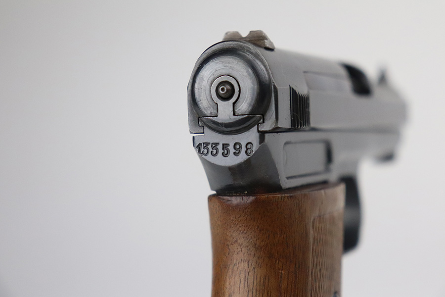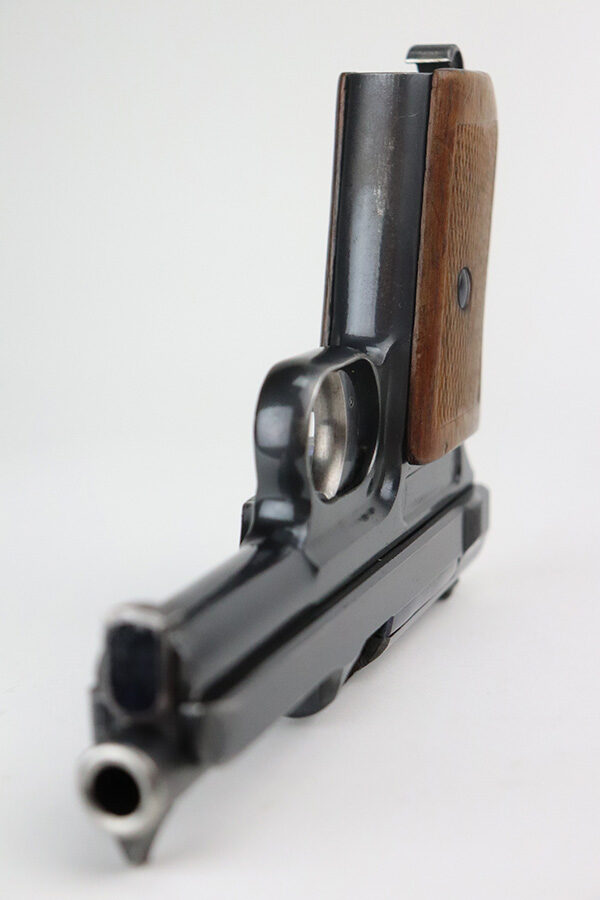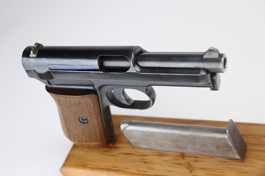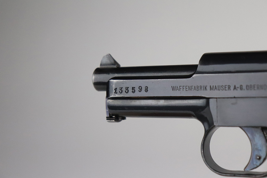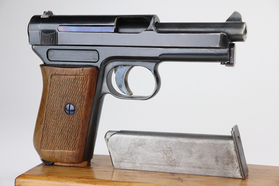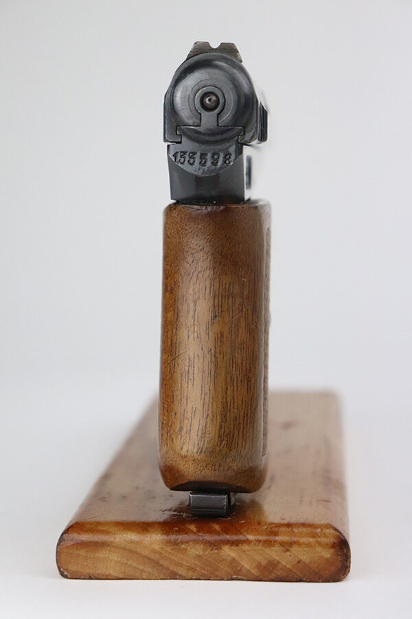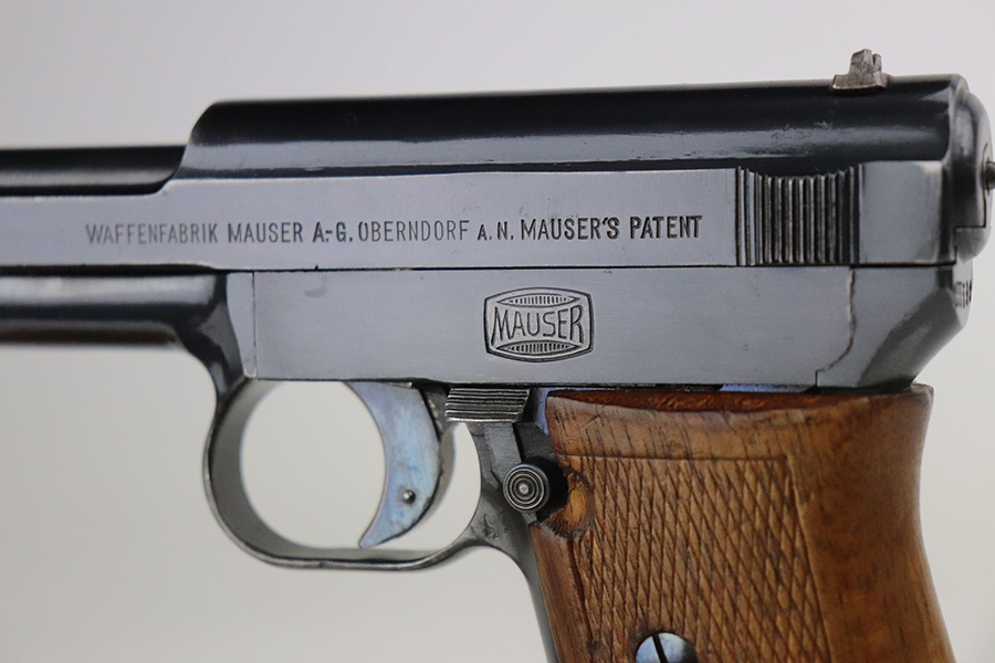 10/4/21 – This is an excellent example of a rare Mauser Model 1914 with an interesting history. It was initially issued to the Imperial German Army during WW1, as evidenced by the Imperial proof on the top of the slide. It was then diverted to the Prussian military for sale to officers as evidenced by the Prussian Eagle on the trigger guard. It is matching and has retained about 96% of its original finish. There is very minor wear on the high edges of the slide and around the muzzle. Minor scratchy wear and pin-pricking on the front strap. Comes with a nice wood grip (minor bruising throughout) and a period-correct magazine. Excellent bore – shiny with good rifling.